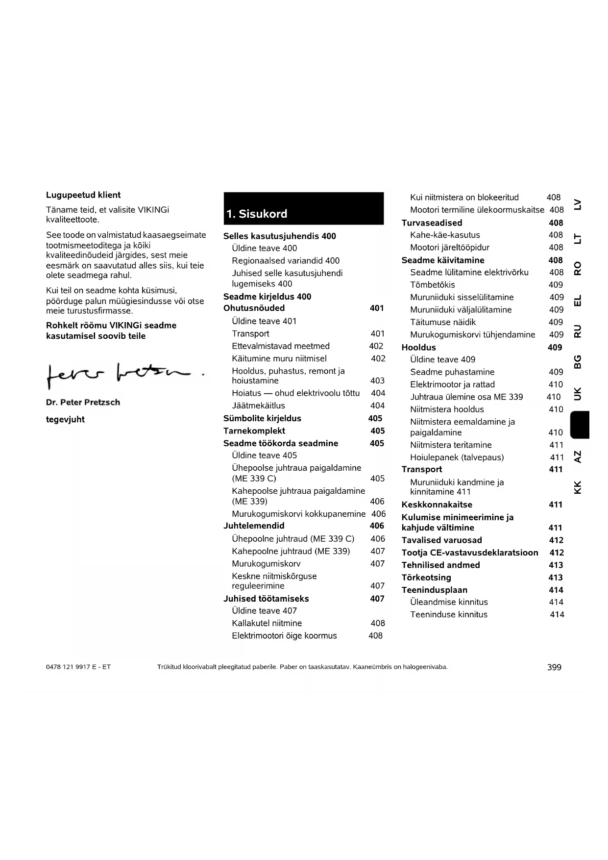 Selles kasutusjuhendis 400 Üldine teave 400 Regionaalsed variandid 400 Juhised selle kasutusjuhendi lugemiseks 400 Seadme kirjeldus 400 Ohutusnõuded 401 Üldine teave 401 Transport 401 Ettevalmistavad meetmed 402 Käitumine muru niitmisel 402 Hooldus, puhastus, remont ja hoiustamine 403 Hoiatus — ohud elektrivoolu tõttu 404 Jäätmekäitlus 404 Sümbolite kirjeldus 405 Tarnekomplekt 405 Seadme töökorda seadmine 405 Üldine teave 405 Ühepoolse juhtraua paigaldamine (ME 339 C) 405 Kahepoolse juhtraua paigaldamine (ME 339) 406 Murukogumiskorvi kokkupanemine 406 Juhtelemendid 406 Ühepoolne juhtraud (ME 339 C) 406 Kahepoolne juhtraud (ME 339) 407 Murukogumiskorv 407 Keskne niitmiskõrguse reguleerimine 407 Juhised töötamiseks 407 Üldine teave 407 Kallakutel niitmine 408 Elektrimootori õige koormus 408 Kui niitmistera on blokeeritud 408 Mootori termiline ülekoormuskaitse 408 Turvaseadised 408 Kahe-käe-kasutus 408 Mootori järeltööpidur 408 Seadme käivitamine 408 Seadme lülitamine elektrivõrku 408 Tõmbetõkis 409 Muruniiduki sisselülitamine 409 Muruniiduki väljalülitamine 409 Täitumuse näidik 409 Murukogumiskorvi tühjendamine 409 Hooldus 409 Üldine teave 409 Seadme puhastamine 409 Elektrimootor ja rattad 410 Juhtraua ülemine osa ME 339 410 Niitmistera hooldus 410 Niitmistera eemaldamine ja paigaldamine 410 Niitmistera teritamine 411 Hoiulepanek (talvepaus) 411 Transport 411 Muruniiduki kandmine ja kinnitamine 411 Keskkonnakaitse 411 Kulumise minimeerimine ja kahjude vältimine 411 Tavalised varuosad 412 Tootja CE-vastavusdeklaratsioon 412 Tehnilised andmed 413 Tõrkeotsing 413 Teenindusplaan 414 Üleandmise kinnitus 414 Teeninduse kinnitus 4140478 121 9917 E - ET