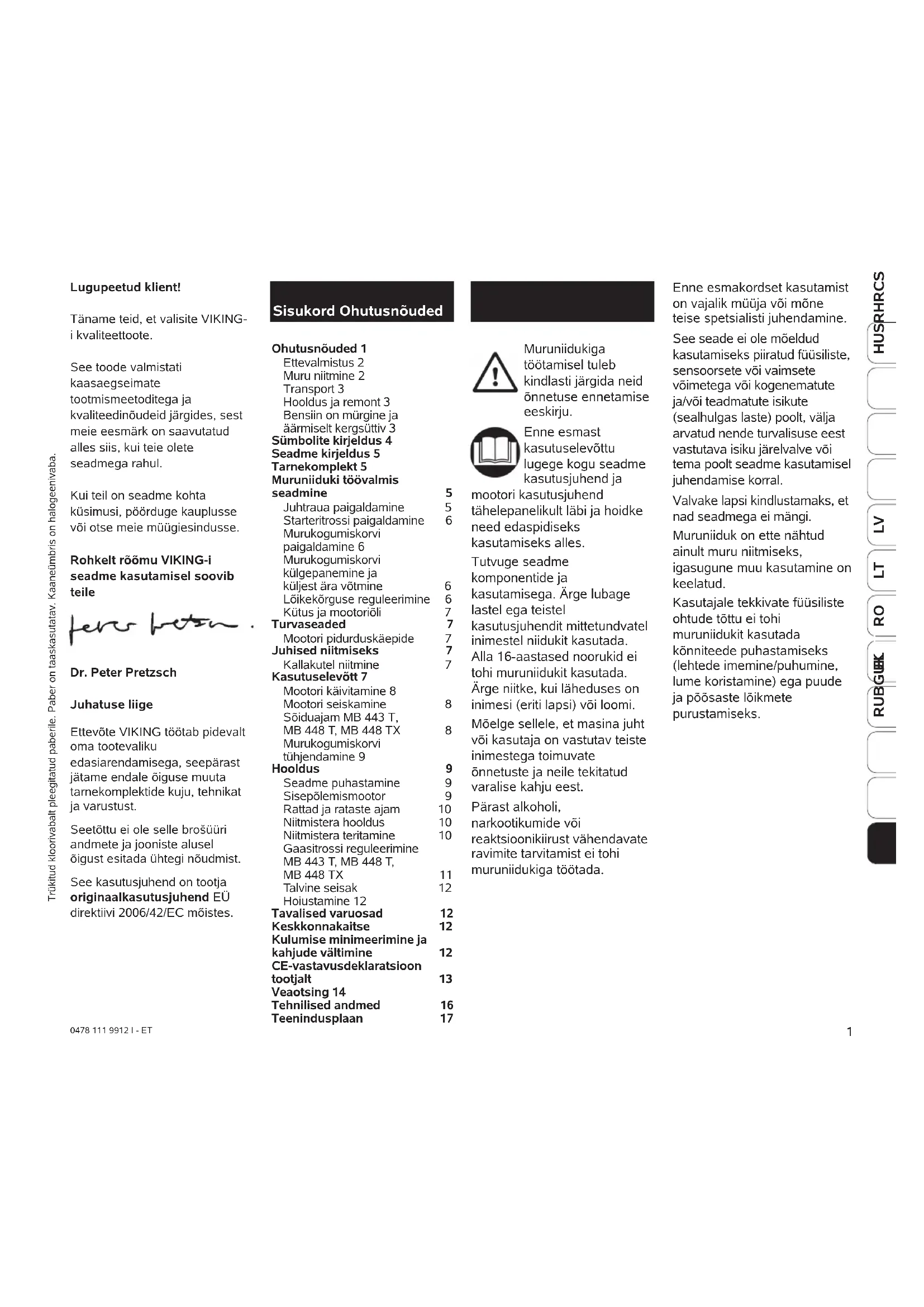 RUBGUKET Muruniidukiga töötamisel tuleb kindlasti järgida neid õnnetuse ennetamise eeskirju. Enne esmast kasutuselevõttu lugege kogu seadme kasutusjuhend ja mootori kasutusjuhend tähelepanelikult läbi ja hoidke need edaspidiseks kasutamiseks alles. Tutvuge seadme komponentide ja kasutamisega. Ärge lubage lastel ega teistel kasutusjuhendit mittetundvatel inimestel niidukit kasutada. Alla 16-aastased noorukid ei tohi muruniidukit kasutada. Ärge niitke, kui läheduses on inimesi (eriti lapsi) või loomi. Mõelge sellele, et masina juht või kasutaja on vastutav teiste inimestega toimuvate õnnetuste ja neile tekitatud varalise kahju eest. Pärast alkoholi, narkootikumide või reaktsioonikiirust vähendavate ravimite tarvitamist ei tohi muruniidukiga töötada. Lugupeetud klient! Täname teid, et valisite VIKING- i kvaliteettoote. See toode valmistati kaasaegseimate tootmismeetoditega ja kvaliteedinõudeid järgides, sest meie eesmärk on saavutatud alles siis, kui teie olete seadmega rahul. Kui teil on seadme kohta küsimusi, pöörduge kauplusse või otse meie müügiesindusse. Rohkelt rõõmu VIKING-i seadme kasutamisel soovib teile Dr. Peter Pretzsch Juhatuse liige Ettevõte VIKING töötab pidevalt oma tootevaliku edasiarendamisega, seepärast jätame endale õiguse muuta tarnekomplektide kuju, tehnikat ja varustust. Seetõttu ei ole selle brošüüri andmete ja jooniste alusel õigust esitada ühtegi nõudmist. See kasutusjuhend on tootja originaalkasutusjuhend EÜ direktiivi 2006/42/EC mõistes. Sisukord Ohutusnõuded Ohutusnõuded 1 Ettevalmistus 2 Muru niitmine 2 Transport 3 Hooldus ja remont 3 Bensiin on mürgine ja äärmiselt kergsüttiv 3 Sümbolite kirjeldus 4 Seadme kirjeldus 5 Tarnekomplekt 5 Muruniiduki töövalmis seadmine 5 Juhtraua paigaldamine 5 Starteritrossi paigaldamine 6 Murukogumiskorvi paigaldamine 6 Murukogumiskorvi külgepanemine ja küljest ära võtmine 6 Lõikekõrguse reguleerimine 6 Kütus ja mootoriõli 7 Turvaseaded 7 Mootori pidurduskäepide 7 Juhised niitmiseks 7 Kallakutel niitmine 7 Kasutuselevõtt 7 Mootori käivitamine 8 Mootori seiskamine 8 Sõiduajam MB 443 T, MB 448 T, MB 448 TX 8 Murukogumiskorvi tühjendamine 9 Hooldus 9 Seadme puhastamine 9 Sisepõlemismootor 9 Rattad ja rataste ajam 10 Niitmistera hooldus 10 Niitmistera teritamine 10 Gaasitrossi reguleerimine MB 443 T, MB 448 T, MB 448 TX 11 Talvine seisak 12 Hoiustamine 12 Tavalised varuosad 12 Keskkonnakaitse 12 Kulumise minimeerimine ja kahjude vältimine 12 CE-vastavusdeklaratsioon tootjalt 13 Veaotsing 14 Tehnilised andmed 16 Teenindusplaan 17 Enne esmakordset kasutamist on vajalik müüja või mõne teise spetsialisti juhendamine. See seade ei ole mõeldud kasutamiseks piiratud füüsiliste, sensoorsete või vaimsete võimetega või kogenematute ja/või teadmatute isikute (sealhulgas laste) poolt, välja arvatud nende turvalisuse eest vastutava isiku järelvalve või tema poolt seadme kasutamisel juhendamise korral. Valvake lapsi kindlustamaks, et nad seadmega ei mängi. Muruniiduk on ette nähtud ainult muru niitmiseks, igasugune muu kasutamine on keelatud. Kasutajale tekkivate füüsiliste ohtude tõttu ei tohi muruniidukit kasutada kõnniteede puhastamiseks (lehtede imemine/puhumine, lume koristamine) ega puude ja põõsaste lõikmete purustamiseks. Trükitud kloorivabalt pleegitatud paberile. Paber on taaskasutatav. Kaaneümbris on halogeenivaba.2 0478 111 9912 I - ET