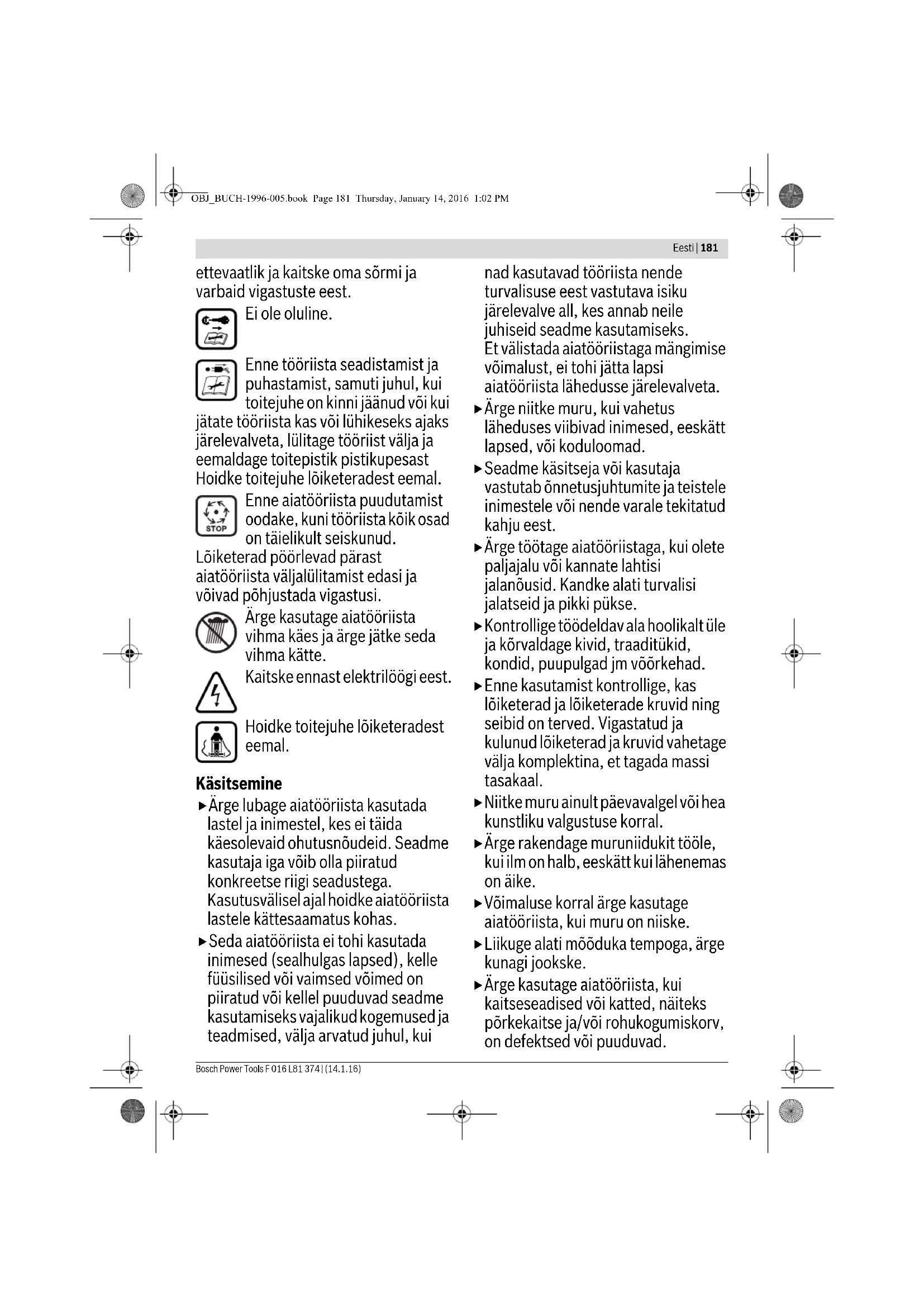 STOP Simptomi Mogući uzroci Pomoć Motor ne radi Nema mrežnog napona Provjeriti i uključiti Neispravna mrežna utičnica Koristiti drugu utičnicu Produžni kabel je oštećen Kontrolirati priključni kabel i zamijeniti ga ako je oštećen Osigurač je reagirao Zamijeniti osigurač Previsoka trava Da bi se smanjilo početno opterećenje, treba namjestiti veću visinu rezanja i nagnuti vrtni uređaj Reagirala je zaštita motora Ostaviti motor da se ohladi i namjestiti veću visinu rezanja OBJ_BUCH-1996-005.book Page 179 Thursday, January 14, 2016 1:02 PM180 | Eesti F 016 L81 374 | (14.1.16) Bosch Power Tools Servisiranje i savjetovanje o primjeni www.bosch-garden.com Kod svih upita i naručivanja rezervnih dijelova molimo neizostavno navedite 10-znamenkasti kataloški broj sa tipske pločice vrtnog uređaja. Hrvatski Robert Bosch d.o.o Kneza Branimira 22 10040 Zagreb Tel.: (01) 2958051 Fax: (01) 2958050 Zbrinjavanje Vrtne uređaje, pribor i ambalažu treba dostaviti na ekološki prihvatljivo recikliranje. Vrtne uređaje ne bacajte u kućni otpad! Samo za zemlje EU: Prema Europskim smjernicama 2012/19/EU za električne i elektroničke stare uređaje, neuporabivi električni i elektronički uređaji moraju se odvojeno sakupljati i dovoditi na ekološki prihvatljivo recikliranje. Zadržavamo pravo na promjene. Eesti Ohutusnõuded Tähelepanu! Lugege järgmised juhised tähelepanelikult läbi. Tutvuge aiatööriista käsitsuselementide ja nõuetekohase kasutamisega. Hoidke kasutusjuhend hilisemaks kasutamiseks hoolikalt alles. Aiatööriistal olevate sümbolite selgitus Üldine oht. Lugege läbi kasutusjuhend. Veenduge, et eemalepaiskuvad võõrkehad ei vigasta läheduses viibivaid inimesi. Hoiatus: Viibige töötavast aiatööriistast ohutus kauguses. Ettevaatust: Ärge puudutage pöörlevaid lõiketerasid. Lõiketerad on teravad. Olge Vrtni uređaj radi sa prekidima Produžni kabel je oštećen Kontrolirati priključni kabel i zamijeniti ga ako je oštećen Neispravno unutarnje ožičenje vrtnog uređaja Zatražiti pomoć ovlaštenog servisa Reagirala je zaštita motora Ostaviti motor da se ohladi i namjestiti veću visinu rezanja Vrtni uređaj ostavlja iza sebe nepravilnu sliku rezanja i/ili Motor radi otežano Premala visina rezanja Namjestiti veću visinu rezanja Nož je tup Zamjena noža Moguće je začepljenje Kontrolirati donju stranu vrtnog uređaja i prema potrebi je osloboditi (uvijek nosite zaštitne rukavice za rad u vrtu) Noževi su pogrešno montirani Noževe ispravno montirati Nož se ne vrti nakon uključivanja vrtnog uređaja Nožu smeta trava Isključiti vrtni uređaj Otkloniti začepljenje (uvijek nosite zaštitne rukavice za rad u vrtu) Otpuštena matica/vijak noža Stegnuti maticu/vijak noža (17 Nm) Jake vibracije/šumovi Otpuštena matica/vijak noža Stegnuti maticu/vijak noža (17 Nm) Nož je oštećen Zamjena noža Simptomi Mogući uzroci Pomoć OBJ_BUCH-1996-005.book Page 180 Thursday, January 14, 2016 1:02 PMEesti | 181 Bosch Power Tools F 016 L81 374 | (14.1.16) ettevaatlik ja kaitske oma sõrmi ja varbaid vigastuste eest. Ei ole oluline. Enne tööriista seadistamist ja puhastamist, samuti juhul, kui toitejuhe on kinni jäänud või kui jätate tööriista kas või lühikeseks ajaks järelevalveta, lülitage tööriist välja ja eemaldage toitepistik pistikupesast Hoidke toitejuhe lõiketeradest eemal. Enne aiatööriista puudutamist oodake, kuni tööriista kõik osad on täielikult seiskunud. Lõiketerad pöörlevad pärast aiatööriista väljalülitamist edasi ja võivad põhjustada vigastusi. Ärge kasutage aiatööriista vihma käes ja ärge jätke seda vihma kätte. Kaitske ennast elektrilöögi eest. Hoidke toitejuhe lõiketeradest eemal. Käsitsemine Ärge lubage aiatööriista kasutada lastel ja inimestel, kes ei täida käesolevaid ohutusnõudeid. Seadme kasutaja iga võib olla piiratud konkreetse riigi seadustega. Kasutusvälisel ajal hoidke aiatööriista lastele kättesaamatus kohas. Seda aiatööriista ei tohi kasutada inimesed (sealhulgas lapsed), kelle füüsilised või vaimsed võimed on piiratud või kellel puuduvad seadme kasutamiseks vajalikud kogemused ja teadmised, välja arvatud juhul, kui nad kasutavad tööriista nende turvalisuse eest vastutava isiku järelevalve all, kes annab neile juhiseid seadme kasutamiseks. Et välistada aiatööriistaga mängimise võimalust, ei tohi jätta lapsi aiatööriista lähedusse järelevalveta. Ärge niitke muru, kui vahetus läheduses viibivad inimesed, eeskätt lapsed, või koduloomad. Seadme käsitseja või kasutaja vastutab õnnetusjuhtumite ja teistele inimestele või nende varale tekitatud kahju eest. Ärge töötage aiatööriistaga, kui olete paljajalu või kannate lahtisi jalanõusid. Kandke alati turvalisi jalatseid ja pikki pükse. Kontrollige töödeldav ala hoolikalt üle ja kõrvaldage kivid, traaditükid, kondid, puupulgad jm võõrkehad. Enne kasutamist kontrollige, kas lõiketerad ja lõiketerade kruvid ning seibid on terved. Vigastatud ja kulunud lõiketerad ja kruvid vahetage välja komplektina, et tagada massi tasakaal. Niitke muru ainult päevavalgel või hea kunstliku valgustuse korral. Ärge rakendage muruniidukit tööle, kui ilm on halb, eeskätt kui lähenemas on äike. Võimaluse korral ärge kasutage aiatööriista, kui muru on niiske. Liikuge alati mõõduka tempoga, ärge kunagi jookske. Ärge kasutage aiatööriista, kui kaitseseadised või katted, näiteks põrkekaitse ja/või rohukogumiskorv, on defektsed või puuduvad. OBJ_BUCH-1996-005.book Page 181 Thursday, January 14, 2016 1:02 PM182 | Eesti F 016 L81 374 | (14.1.16) Bosch Power Tools Kandke kuulmiskaitsevahendeid. Töötamine kallakutel võib olla ohtlik. – Ärge kasutage seadet väga järskudel nõlvadel. – Nõlvadel ja märjal rohul säilitage stabiilne asend. – Kallakutel liikuge alati vasakule- paremale ja mitte üles-alla. – Nõlvadel suunda muutes olge äärmiselt ettevaatlik. Aiatööriistaga tagu