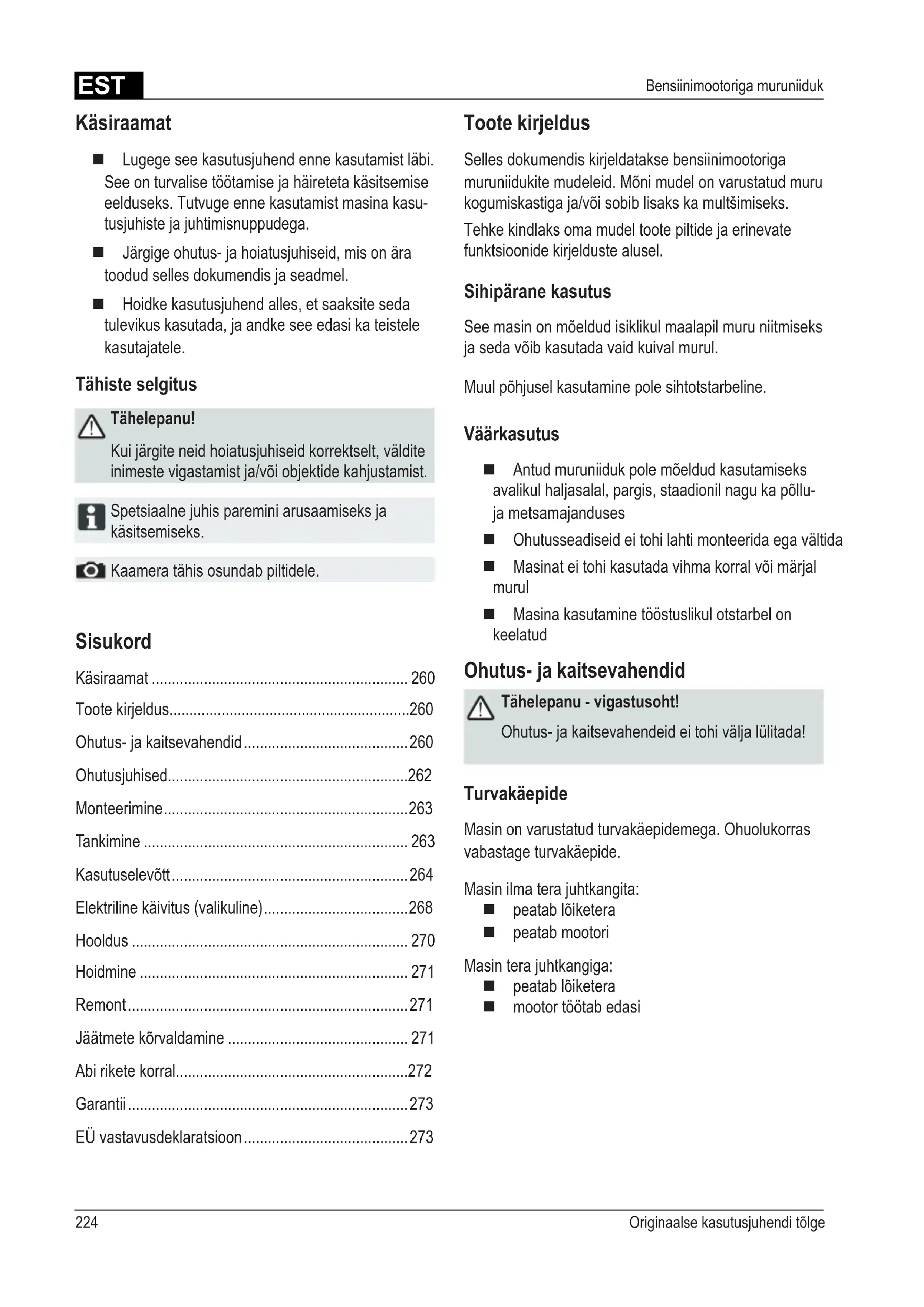 - Bensiinimootoriga muruniiduk Sisukord Käsiraamat p. 260