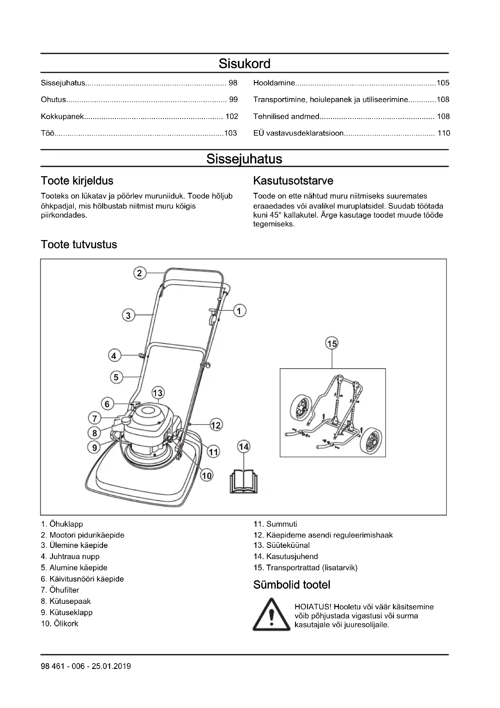 Sümbolid tootel HOIATUS! Hooletu või väär käsitsemine võib põhjustada vigastusi või surma kasutajale või juuresolijaile. 98 461 - 006 - 25.01.2019Enne seadme kasutamist lugege kasutusjuhend põhjalikult läbi, et kõik juhised oleksid täiesti arusaadavad. Hoiatus: pöörlev lõiketera. Hoidke käed ja jalad eemal. Hoiatus: pöörlevad osad. Hoidke käed ja jalad eemal. Olge ettevaatlik - lenduvad esemed ning tagasipõrkumise oht. Teised inimesed ja loomad peavad viibima tööalast ohutus kauguses. Enne seadme remontimist või hooldamist seisake mootor ja eemaldage süütejuhe. Toode vastab ELi kehtivatele direktiividele. Ümbritsevasse keskkonda leviv müra vastavalt Euroopa Ühenduse direktiivile. Seadme müratase on ära toodud tehniliste andmete peatükis ja etiketil. Kütuseklapp avatud. Kütuseklapp suletud. Mootori heitgaasid sisalda- vad vingugaasi: lõhnatut, mürgist ja väga ohtlikku gaa- si. Ärge laske seadmel tööta- da siseruumis või väikesel suletud alal. Tuleoht. Enne tankimist sei- sake mootor. Märkus: Seadmel toodud ülejäänud sümbolid/tähised vastavad muude kommertsvaldkondade sertifitseerimisnõuetele. EL V HOIATUS: Mootori igasugune modifitseerimine, muutmine või rikkumine tühistab toote EL-i tüübikinnituse. Tootevastutus Tootevastutusseaduste alusel ei vastuta me tootest tingitud kahjustuste eest, kui:
