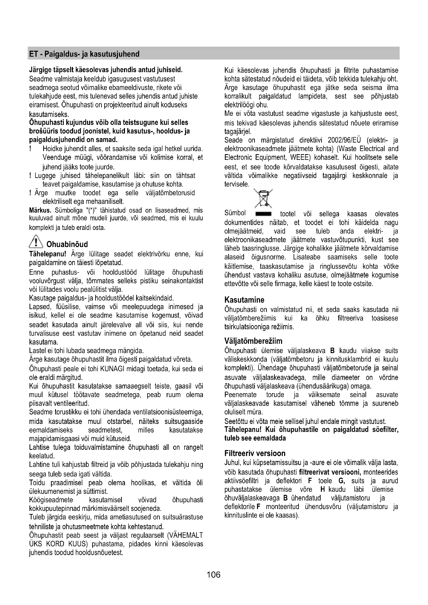 Kui kaesolevas juhendis ohpuhasti ja filtrite puhastamise kohta satestatud noueid ei taideta, voib tekkida talekahju oht. Arge kasutage ohpuhastit ega jatke seda seisma ilma korralikult paigaldatud lampideta, sest see pohjustab elektriloo gi ohu.