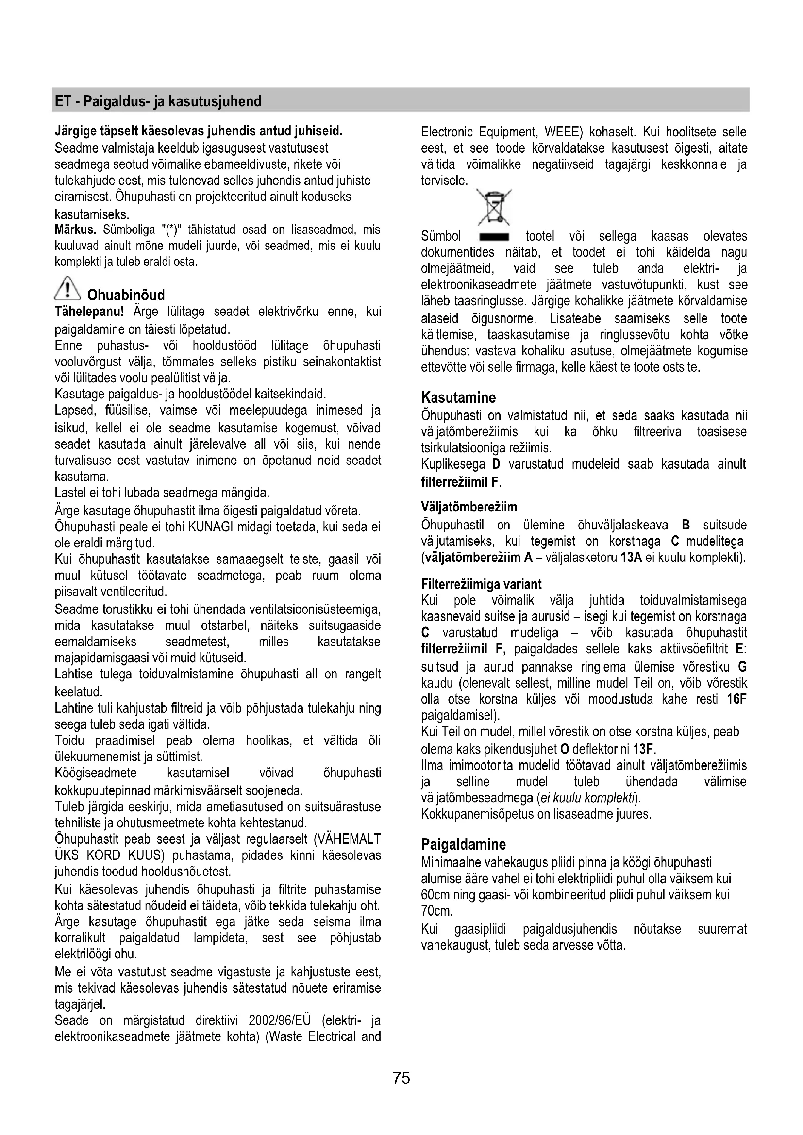Daži modeļi ir aprīkoti ar metāla filtru M bez balsta režģa , tiem ir jabūt mazgātiem, kā tas ir norādīts augstāk un tiem ir jābūt noņemtiem spiežot rokturus N uz leju. Aktīvo ogļu filtrs (Tikai Versijai ar Filtru) Notur nepatīkamas smaržas, kuras veidojas no ēdiena gatavošanas. Ogļu filtra piesātināšanās parādās pēc diezgan ilgas izmantošanas, atkarībā no virtuves veida un tauku filtru tīrīšanas regularitātes. Jebkurā gadījumā, ir nepieciešams nomainīt kartridžu maksimums katrus ceturto mēnesi (vai kad filtru piešātināšanās norādījumu sistēma – ja to paredz Jūsu modelis – uzrāda šo nepieciešamību). NEVAR būt mazgāts vai atjaunots. Ogļu filtrs ar centrālo rokturi Pielietot vienu filtru katrai pusei, lai nosegtu dzinēja lāpstiņriteņa abusOgļu filtrs ar centrālo rokturi Pielietot vienu filtru katrai pusei, lai nosegtu dzinēja lāpstiņriteņa abus aizsardzības režģus, p ēctam pagriezt filtru centrālo rokturi P pulskteņrādītāja virzienā. Nomontēšanai pagriezt katra fitra centrālo rokturi pretēji pulksteņrādītāja virzienam. Spuldžu nomainīšana Atvienot ierīci no elektriskās sistēmas. Uzmanību! Pirms pieskarties spuldzēm, pārliecināties, ka tās ir aukstas. Spuldžu nomainīšana 40W – Piekļūt pie spuldzes nodaļas – Noskrūvēt augšgaismas balsta skrūves. Noskrūvēt bojātu spuldzi un nomainīt to pret ovālu spuldzi max 40W E14 pie sakarsēšanas. Halogēna spuldzes nomainīšana – Piekļūt pie spuldzes nodaļas – izņemt aizsardzību ar plakana skrūvgrieža vai līdzīga instrumenta palīdzību. Nomainīt bojātu spuldzi. Izmantot 20W max (G4) halogēna spuldzes, pievēršot uzmanību, lai tās neaiztiktu ar rokām. Aizvērt augšgaismu (fiksēšana ar klikšķi). (Z1 - Z2) Ja apgaismojums nedarbojas, pārbaudīt, vai spuldze ir pareizi ievietota, pirms griezties pie tehniskā servisa.75 ET - Paigaldus- ja kasutusjuhend Järgige täpselt käesolevas juhendis antud juhiseid. Seadme valmistaja keeldub igasugusest vastutusest seadmega seotud võimalike ebameeldivuste, rikete või tulekahjude eest, mis tulenevad selles juhendis antud juhiste eiramisest. Õhupuhasti on projekteeritud ainult koduseks kasutamiseks. Märkus. Sümboliga "(*)" tähistatud osad on lisaseadmed, mis kuuluvad ainult mõne mudeli juurde, või seadmed, mis ei kuulu komplekti ja tuleb eraldi osta. Ohuabinõud Tähelepanu! Ärge lülitage seadet elektrivõrku enne, kui paigaldamine on täiesti lõpetatud. Enne puhastus- või hooldustööd lülitage õhupuhasti vooluvõrgust välja, tõmmates selleks pistiku seinakontaktist või lülitades voolu pealülitist välja. Kasutage paigaldus- ja hooldustöödel kaitsekindaid. Lapsed, füüsilise, vaimse või meelepuudega inimesed ja isikud, kellel ei ole seadme kasutamise kogemust, võivad seadet kasutada ainult järelevalve all või siis, kui nende turvalisuse eest vastutav inimene on õpetanud neid seadet kasutama. Lastel ei tohi lubada seadmega mängida. Ärge kasutage õhupuhastit ilma õigesti paigaldatud võreta. Õhupuhasti peale ei tohi KUNAGI midagi toetada, kui seda ei ole eraldi märgitud. Kui õhupuhastit kasutatakse samaaegselt teiste, gaasil või muul kütusel töötavate seadmetega, peab ruum olema piisavalt ventileeritud. Seadme torustikku ei tohi ühendada ventilatsioonisüsteemiga, mida kasutatakse muul otstarbel, näiteks suitsugaaside eemaldamiseks seadmetest, milles kasutatakse majapidamisgaasi või muid kütuseid. Lahtise tulega toiduvalmistamine õhupuhasti all on rangelt keelatud. Lahtine tuli kahjustab filtreid ja võib põhjustada tulekahju ning seega tuleb seda igati vältida. Toidu praadimisel peab olema hoolikas, et vältida õli ülekuumenemist ja süttimist. Köögiseadmete kasutamisel võivad õhupuhasti kokkupuutepinnad märkimisväärselt soojeneda. Tuleb järgida eeskirju, mida ametiasutused on suitsuärastuse tehniliste ja ohutusmeetmete kohta kehtestanud. Õhupuhastit peab seest ja väljast regulaarselt (VÄHEMALT ÜKS KORD KUUS) puhastama, pidades kinni käesolevas juhendis toodud hooldusnõuetest. Kui käesolevas juhendis õhupuhasti ja filtrite puhastamise kohta sätestatud nõudeid ei täideta, võib tekkida tulekahju oht. Ärge kasutage õhupuhastit ega jätke seda seisma ilma korralikult paigaldatud lampideta, sest see põhjustab elektrilöögi ohu. Me ei võta vastutust seadme vigastuste ja kahjustuste eest, mis tekivad käesolevas juhendis sätestatud nõuete eriramise tagajärjel. Seade on märgistatud direktiivi 2002/96/EÜ (elektri- ja elektroonikaseadmete jäätmete kohta) (Waste Electrical and Electronic Equipment, WEEE) kohaselt. Kui hoolitsete selle eest, et see toode kõrvaldatakse kasutusest õigesti, aitate vältida võimalikke negatiivseid tagajärgi keskkonnale ja tervisele. Sümbol tootel või sellega kaasas olevates dokumentides näitab, et toodet ei tohi käidelda nagu olmejäätmeid, vaid see tuleb anda elektri- ja elektroonikaseadmete jäätmete vastuvõtupunkti, kust see läheb taasringlusse. Järgige kohalikke jäätmete kõrvaldamise alaseid õigusnorme. Lisateabe saamiseks selle toote käitlemise, taaskasutamise ja ringlussevõtu kohta võtke ühendust vastava kohaliku asutuse, olmejäätmete kogumise ettevõtte või selle firmaga, kelle käest te toote ostsite. Kasutamine Õhupuhasti on valmistatud nii, et seda saaks kasutada nii väljatõmberežiimis kui ka õhku filtreeriva toasisese tsirkulatsiooniga režiimis. Kuplikesega D varustatud mudeleid saab kasutada ainult filterrežiimil F. Väljatõmberežiim Õhupuhastil on ülemine õhuväljalaskeava B suitsude väljutamiseks, kui tegemist on korstnaga C mudelitega (väljatõmberežiim A – väljalasketoru 13A ei kuulu komplekti). Filterrežiimiga variant Kui pole võimalik välja juhtida toiduvalmistamisega kaasnevaid suitse ja aurusid – isegi kui tegemist on korstnaga C varustatud mudeliga – võib kasutada õhupuhastit filterrežiimil F, paigaldad