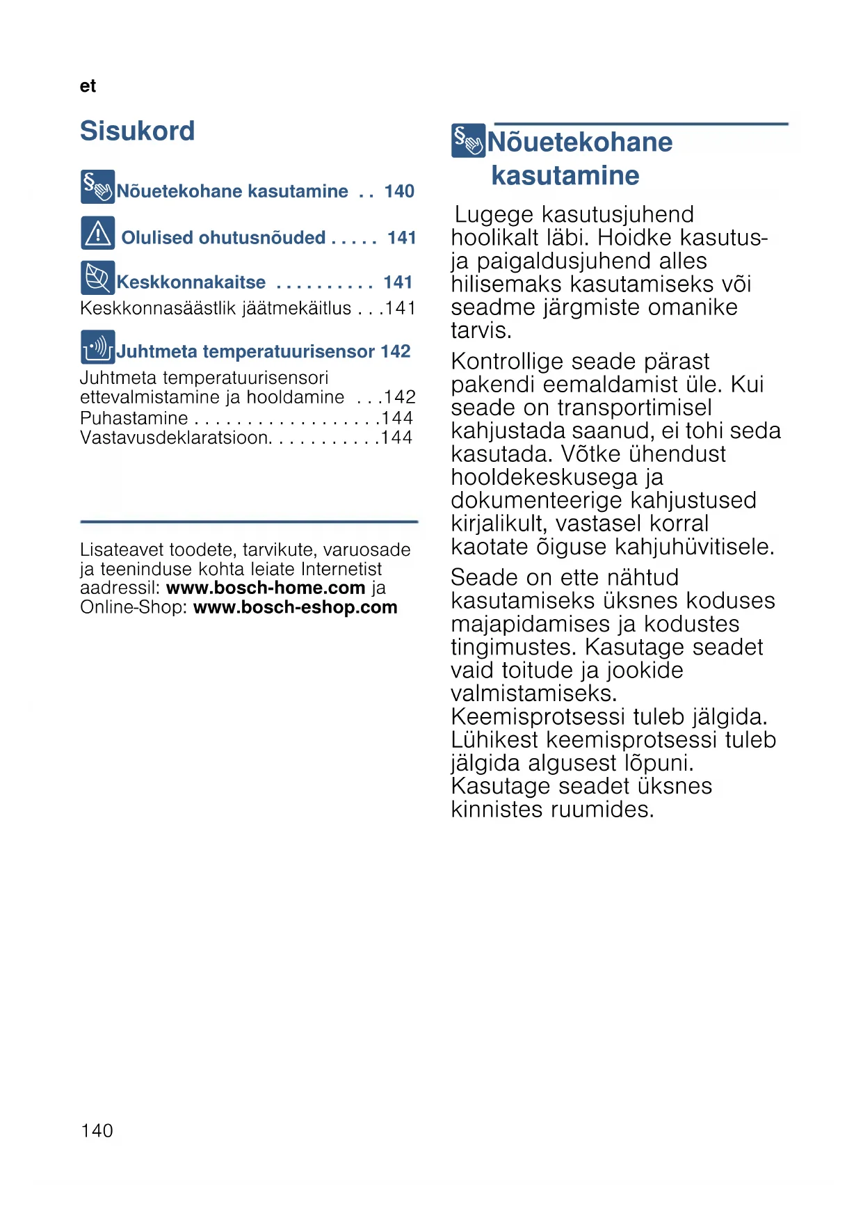 - Vastavusdeklaratsioon Teave toote kohta Lisateavet toodete, tarvikute, varuosade ja teeninduse kohta leiate Internetist aadressil: www.bosch-home.com ja Online-Shop: www.bosch-eshop.com 8 Nõuetekohane kasutamine Nõuet ekohane kasut amine Lugege kasutusjuhend hoolikalt läbi. Hoidke kasutus- ja paigaldusjuhend alles hilisemaks kasutamiseks või seadme järgmiste omanike tarvis. Kontrollige seade pärast pakendi eemaldamist üle. Kui seade on transportimisel kahjustada saanud, ei tohi seda kasutada. Võtke ühendust hooldekeskusega ja dokumenteerige kahjustused kirjalikult, vastasel korral kaotate õiguse kahjuhüvitisele. Seade on ette nähtud kasutamiseks üksnes koduses majapidamises ja kodustes tingimustes. Kasutage seadet vaid toitude ja jookide valmistamiseks. Keemisprotsessi tuleb jälgida. Lühikest keemisprotsessi tuleb jälgida algusest lõpuni. Kasutage seadet üksnes kinnistes ruumides.et p. 144