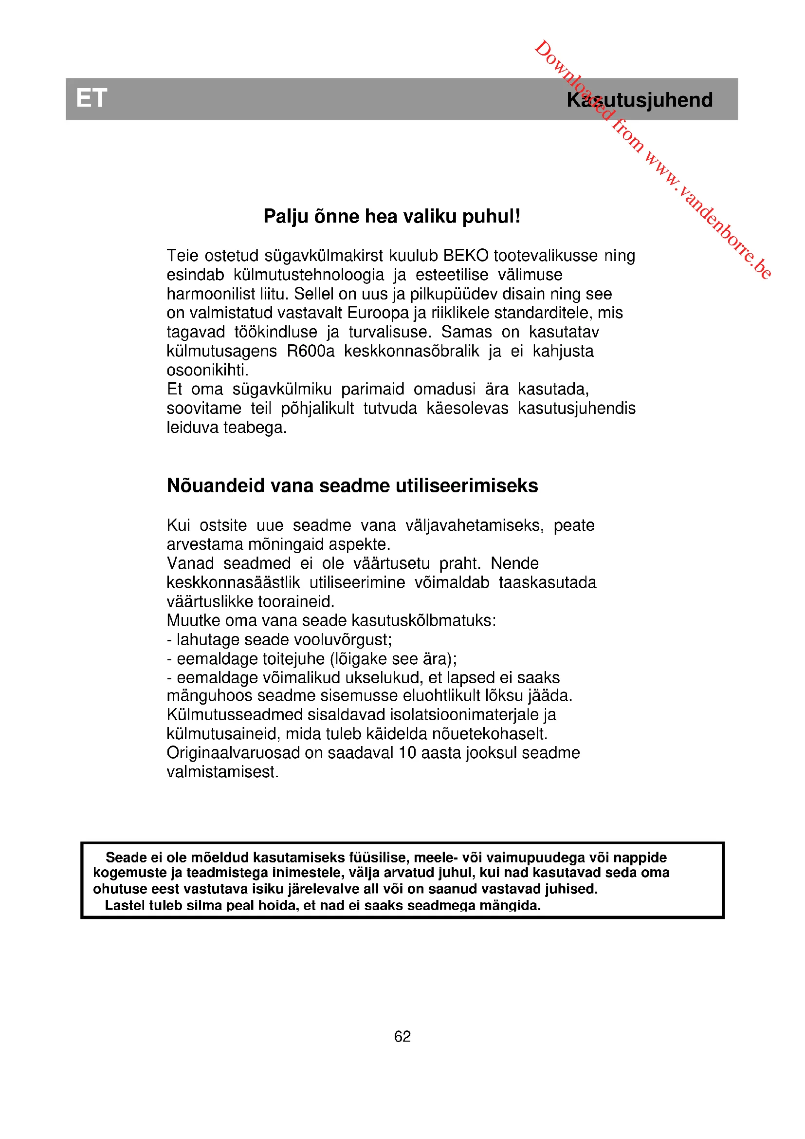 Seade ei ole mõeldud kasutamiseks füüsilise, meele- või vaimupuudega või nappide kogemuste ja teadmistega inimestele, välja arvatud juhul, kui nad kasutavad seda oma ohutuse eest vastutava isiku järelevalve all või on saanud vastavad juhised. Lastel tuleb silma peal hoida, et nad ei saaks seadmega mängida. ET Kasutusjuhend Downloaded from www.vandenborre.bePakendi utiliseerimine HO I ATU S ! Ärge laske lastel pakendi või selle osadega mängida. Lainepapist ja kilest detailid võivad põhjustada lämbumist. Et seade jõuaks teieni tervena, kaitseb seda vastav pakend. Kõik pakkematerjalid on keskkonnasõbralikud ja taaskasutatavad. Palun aidake meil pakend keskkonnasäästlikult taaskasutusele suunata! NB ! Enne seadme kasutuselevõtmist lugege kogu kasutusjuhend põhjalikult läbi. See sisaldab olulist teavet seadme paigaldamise, kasutamise ja hooldamise kohta. Käesolevas dokumendis sisalduva teabe eiramisel ei kanna tootja mingit vastutust. Hoidke neid juhiseid kindlas kohas, et need oleksid vajadusel käepärast. Neid võib kunagi vaja minna ka järgmisel kasutajal. TÄ H ELEP A NU! Seadet tohib kasutada ainult ettenähtud otstarbeks (kodumajapidamises), sobiva ruumis, kaitstuna vihma, niiskuse ja muude ilmastikutingimuste eest. Transpordieeskirjad Võimalusel tuleb seadet transportida ainult vertikaalasendis. Pakend peab olema transportimisel ideaalses seisukorras. Kui seadet transporditi horisontaalselt (ainult vastavalt pakendil olevatele tähistele), on soovitatav lasta sellel enne töölepanemist 4 tundi seista, et külmutusahel saaks taastuda. Nende juhiste eiramine võib lõppeda mootorkompressori rikkega ja selle garantii kehtetuks muutumisega. Hoiatused ja üldised nõuanded Ärge ühendage seadet vooluvõrku, kui avastasite sellel mõne rikke. Seadet võivad parandada ainult vastava väljaõppega spetsialistid. Järgmistel juhtudel eemaldage seade vooluvõrgust: - seadme täielikul sulatamisel; - seadme puhastamisel. Seadme pistiku väljatõmbamisel seinakontaktist hoidke kinni pistikust, mitte juhtmest! Jätke seadme ja sellega külgneva seina vahele piisavalt ruumi. Ärge ronige seadme otsa. Ärge laske lastel seadme sees mängida ega end seadmesse peita. Ärge asetage sulatamiseks sügavkülmikusse kunagi elektriseadmeid. Ärge kasutage seadet kütteseadmete, pliidi või muude kütte- ja tulekollete läheduses. Ärge jätke sügavkülmiku ust lahti kauemaks, kui on vajalik toidu sissepanemiseks või väljavõtmiseks. Ärge jätke toitu mittetöötavasse seadmesse. Ärge hoidke seadmes tooteid, mis sisaldavad tule- või plahvatusohtlikke gaase. Ärge hoidke sügavkülmikus gaseeritud jooke (mahla, mineraalvett, šampust vms) – pudel võib plahvatada! Ärge külmutage plastpudelitesse villitud jooke. Ärge sööge jäätist ja jääkuubikuid kohe pärast sügavkülmikust välja võtmist, sest need võivad tekitada külmakahjustusi. Ärge kunagi puudutage jäiseid metallosi või külmunud toiduaineid märgade kätega, sest käed võivad hetkega nende külge jäätuda. Seadme kaitsmiseks ladustamise ja transportimise ajal on sellel ukse ja kapiosa vahel vahetükid (esi- ja tagaküljel). Enne seadme töölepanemist tuleb need vahetükid eemaldada.