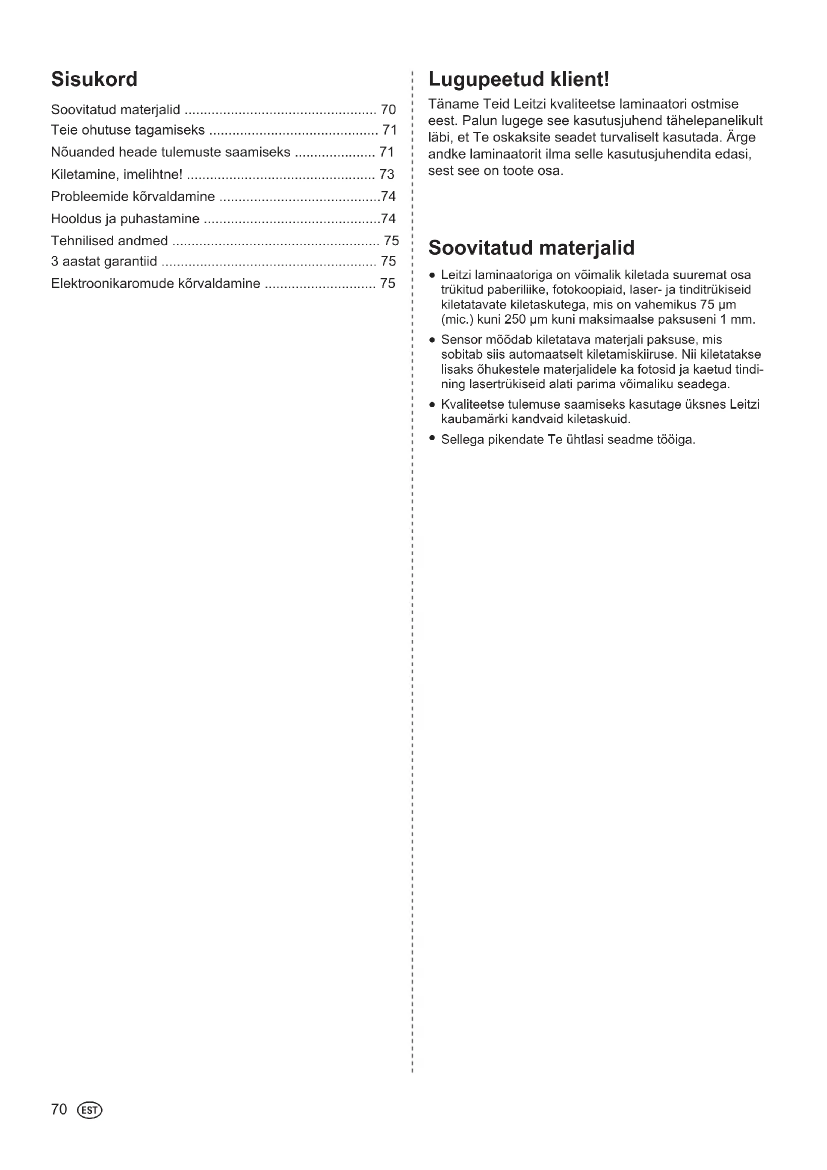 Lugupeetud klient! Täname Teid Leitzi kvaliteetse laminaatori ostmise eest. Palun lugege see kasutusjuhend tähelepanelikult läbi, et Te oskaksite seadet turvaliselt kasutada. Ärge andke laminaatorit ilma selle kasutusjuhendita edasi, sest see on toote osa. Soovitatud materjalid