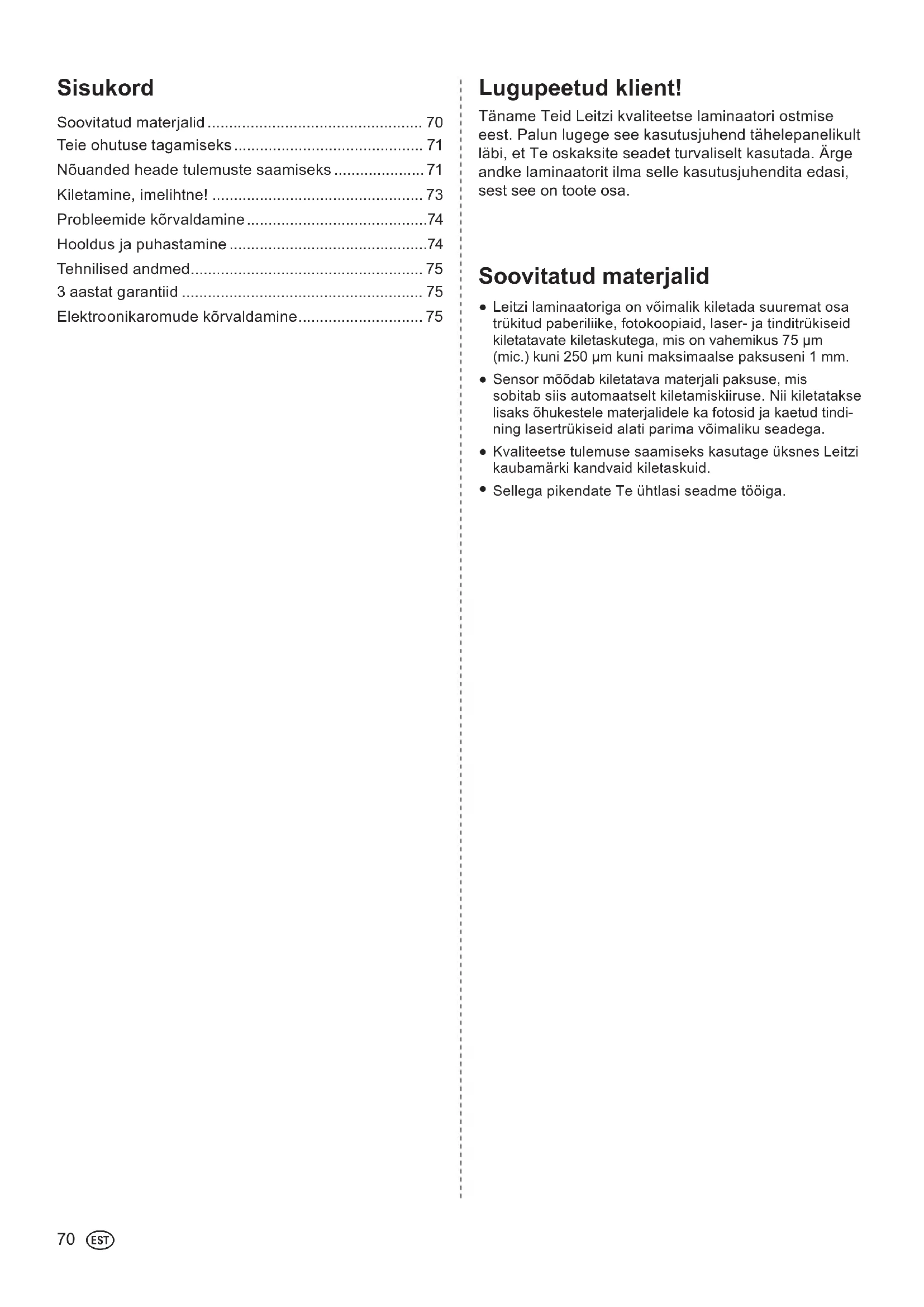 Lugupeetud klient! Täname Teid Leitzi kvaliteetse laminaatori ostmise eest. Palun lugege see kasutusjuhend tähelepanelikult läbi, et Te oskaksite seadet turvaliselt kasutada. Ärge andke laminaatorit ilma selle kasutusjuhendita edasi, sest see on toote osa. Soovitatud materjalid
