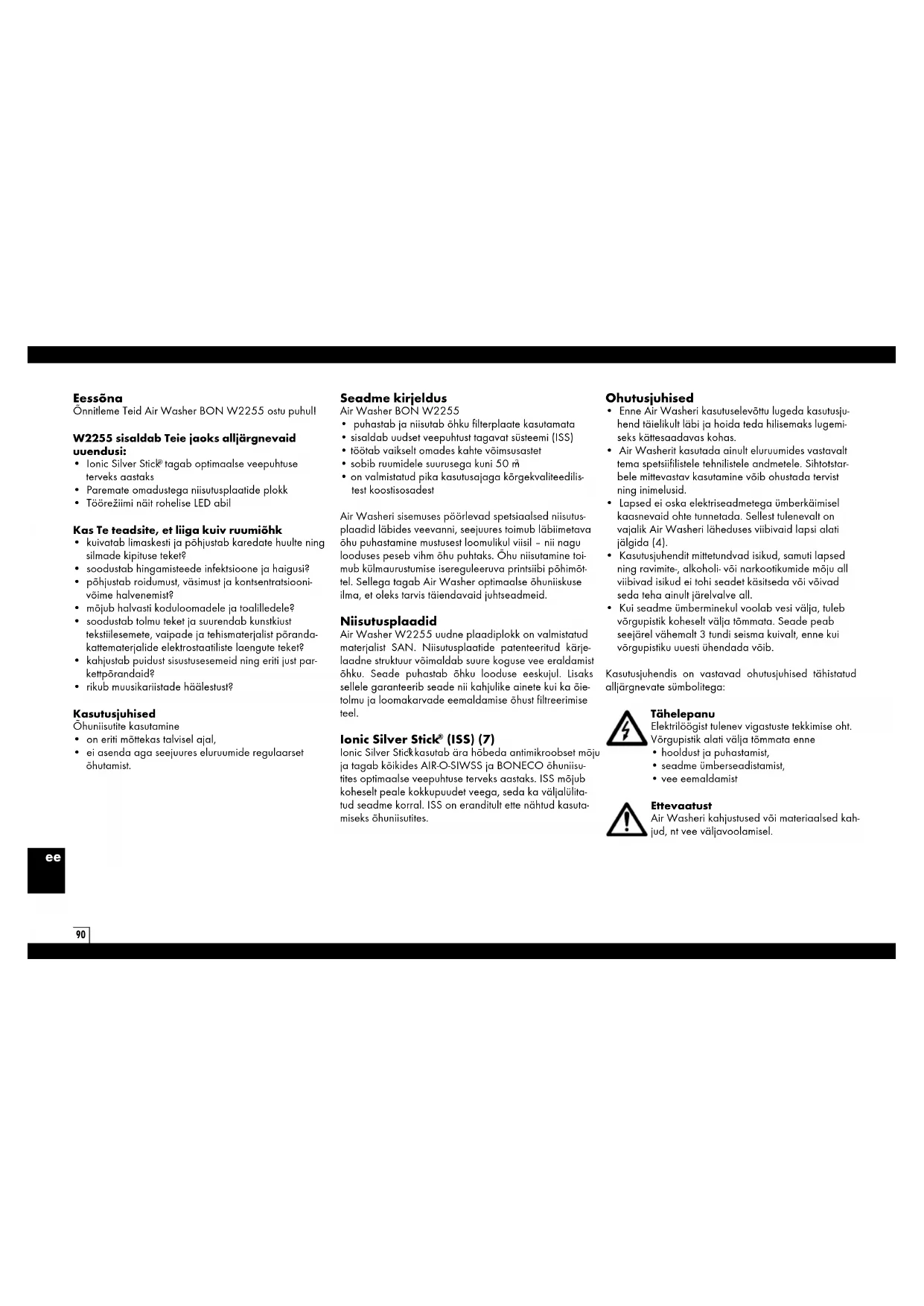 - on valmistatud pika kasutusajaga kõrgekvaliteedilis- test koostisosadest Air Washeri sisemuses pöörlevad spetsiaalsed niisutus- plaadid läbides veevanni, seejuures toimub läbiimetava õhu puhastamine mustusest loomulikul viisil – nii nagu looduses peseb vihm õhu puhtaks. Õhu niisutamine toi- mub külmaurustumise isereguleeruva printsiibi põhimõt- tel. Sellega tagab Air Washer optimaalse õhuniiskuse ilma, et oleks tarvis täiendavaid juhtseadmeid. Niisutusplaadid Air Washer W2255 uudne plaadiplokk on valmistatud materjalist SAN. Niisutusplaatide patenteeritud kärje- laadne struktuur võimaldab suure koguse vee eraldamist õhku. Seade puhastab õhku looduse eeskujul. Lisaks sellele garanteerib seade nii kahjulike ainete kui ka õie- tolmu ja loomakarvade eemaldamise õhust filtreerimise teel. Ionic Silver Stick