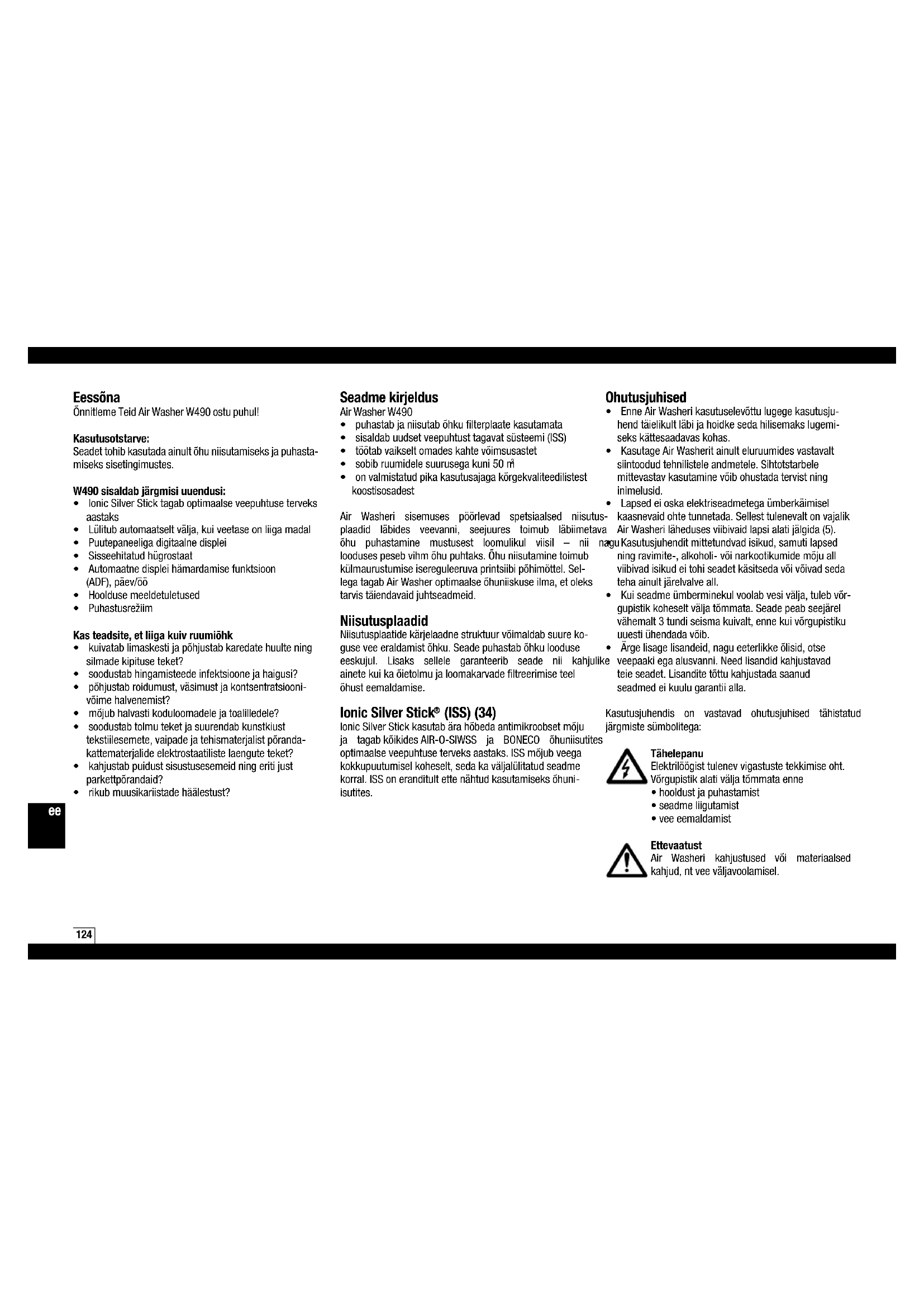 (ISS) (34) lonicSilverStickkasutabärahõbedaantimikroobsetmõju ja tagabkõikidesAIR-O-SIWSS ja BONECO õhuniisutites optimaalseveepuhtuseterveksaastaks.ISSmõjubveega kokkupuutumiselkoheselt,sedakaväljalülitatudseadme korral.ISSoneranditultettenähtudkasutamiseksõhuni- isutites. Ohutusjuhised