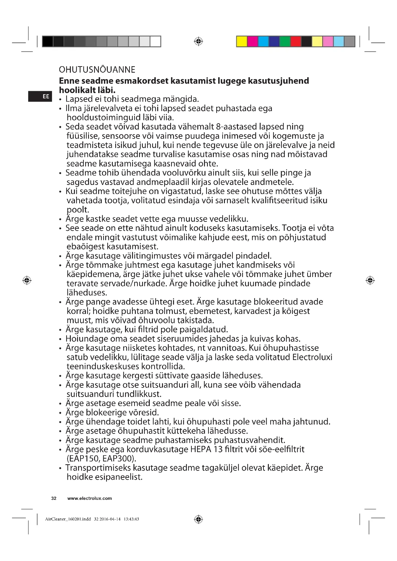 - Ärge kasutage niisketes kohtades, nt vannitoas. Kui õhupuhastisse satub vedelikku, lülitage seade välja ja laske seda volitatud Electroluxi teeninduskeskuses kontrollida.