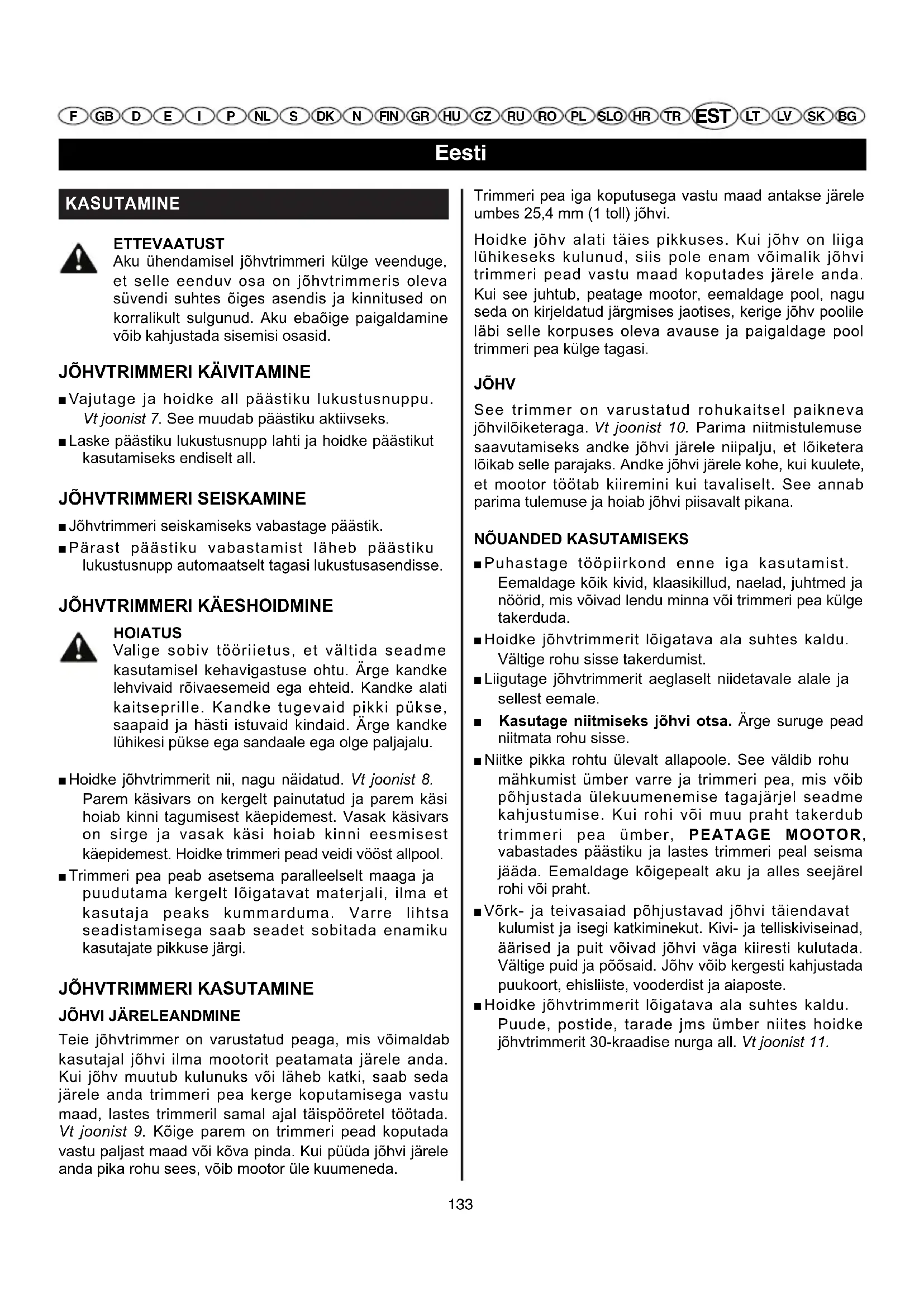 Arge püddke töörista muuta ega luua vöi kinnitada selle kulge lisatarvikuid, mida selle töörista puhul pole soovitatud kasutada. Iga selline muudatus on vaärkasutus ning voib viia ohtlike olukordade ja tosiste kehavigastusteni. Kontrollige johvtrimmerit sageli, veendumaks, et koik osad on terved ja kovasti kinni. Raskete kehavigastuste vältimiseks veenduge, et koik krucid ja kinnitused on kovasti kinni.