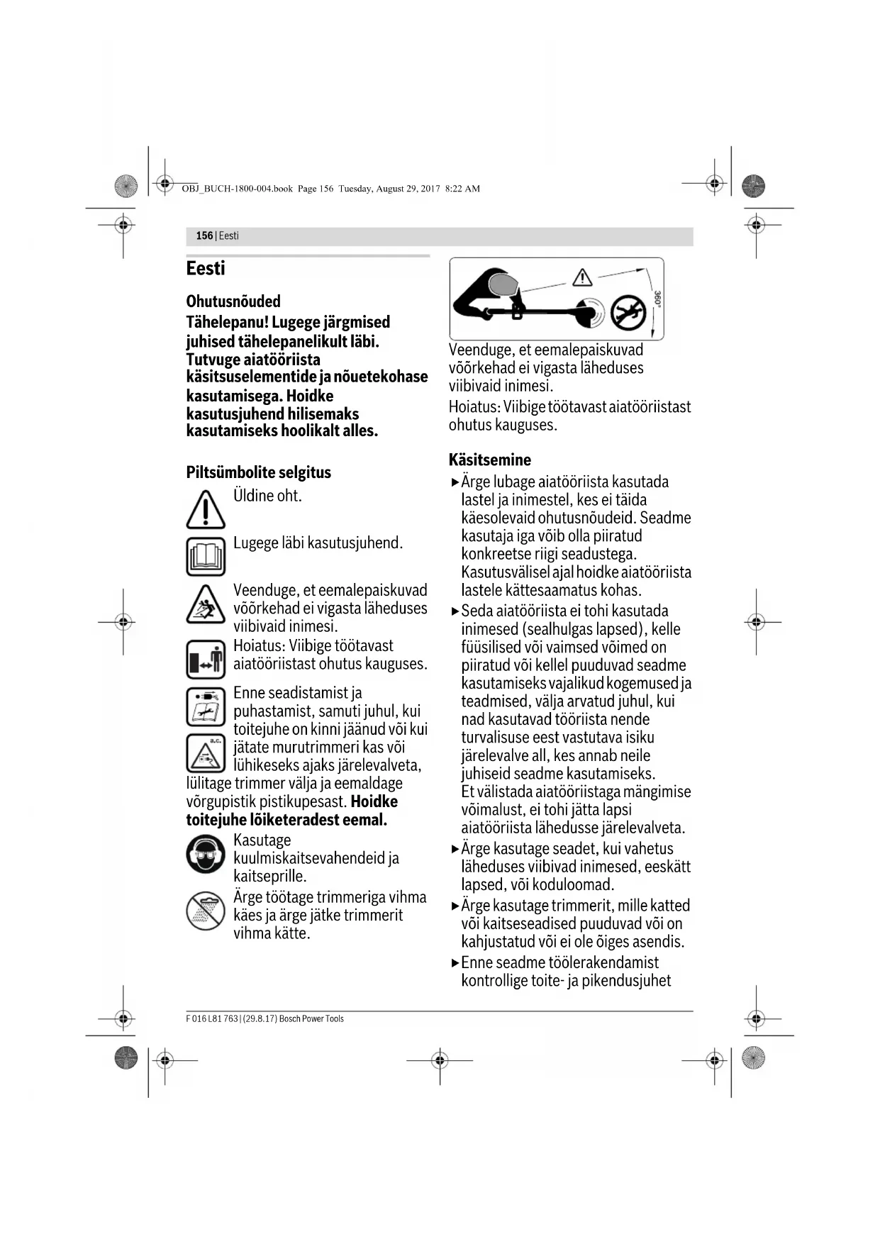 LAHUTATUD. Ärge töötage murutrimmeriga, mille toitejuhe on viga saanud või kulunud. Enne töölerakendamist ja pärast tööriistale avaldunud lööki kontrollige tööriista kulumise ja kahjustuste suhtes ning laske tööriist vajaduse korral parandada. Ärge kasutage aiatööriista, kui olete väsinud või haige või kui olete tarbinud alkoholi, narkootikume või ravimeid. Kandke pikki tugevast riidest pükse, tugevaid jalatseid ja kindaid. Ärge kandke laiu riideid, ehteid, lühikesi pükse, sandaale ja ärge töötage paljajalu. Siduge pikad juuksed kinni, et vältida nende sattumist seadme liikuvate osade vahele. Aiatööriista käsitsemisel kandke kaitseprille ja kuulmiskaitsevahendeid. Olge stabiilses asendis ja säilitage kogu aeg tasakaal. Ärge pingutage ennast üle. Ärge töötage trimmeriga, kui vahetus lähedus viibivad inimesed, eeskätt lapsed, ja koduloomad. Seadme käsitseja või kasutaja vastutab õnnetusjuhtumite ja teistele inimestele või nende varale tekitatud kahju eest. Ärge puudutage pöörlevaid lõikeelemente enne, kui need on täielikult seiskunud. Lõikeelemendid pöörlevad pärast trimmeri väljalülitamist edasi ja võivad põhjustada vigastusi. Töötage trimmeriga ainult päevavalgel või hea kunstliku valgustuse korral. Ärge rakendage trimmerit tööle, kui ilm on halb, eeskätt kui lähenemas on äike. Trimmeri kasutamine märja muru puhul vähendab jõudlust. Trimmeri transportimisel töökohta või töökohalt tagasi peab trimmer olema välja lülitatud. Lülitage trimmer sisse vaid siis, kui Teie käed ja jalad on pöörlevatest lõikeelementidest piisaval kaugusel. Ettevaatust – ärge puudutage pöörlevat lõikeniiti. Ärge viige oma käsi ega jalgu pöörlevate lõikeelementide lähedusse. Ärge kasutage selles trimmeris metallist lõikeelemente. Kontrollige ja hooldage trimmerit korrapäraselt. Laske trimmerit alati parandada volitatud remonditöökojas. Veenduge alati, et seadme ventilatsiooniavades ei ole rohujääke. Olge ettevaatlik, kuna integreeritud tera, mis lõikab lõikeniidi sobivasse pikkusesse, võib tekitada kehavigastusi. Pärast lõikeniidi lisamist/järeleandmist keerake trimmer alati horisontaalasendisse, enne kui selle sisse lülitate. OBJ_BUCH-1800-004.book Page 157 Tuesday, August 29, 2017 8:22 AM158 | Eesti F 016 L81 763 | (29.8.17) Bosch Power Tools Lülitage aiatööriist välja ja eemaldage võrgupistik pistikupesast: – alati, kui jätate seadme järelevalveta – enne pooli väljavahetamist – kui toitejuhe on keerdu läinud, – enne trimmeri puhastamist ja seadistamist Pärast töö lõpetamist tõmmake võrgupistik pistikupesast välja ja kontrollige aiatööriista kahjustuste suhtes. Hoidke aiatööriista ohutus, kuivas, lastele ligipääsmatus kohas. Ärge asetage aiatööriista peale teisi esemeid. Kulunud ja kahjustatud osad vahetage ohutuse huvides välja. Veenduge, et varuosad pärinevad Boschilt. Ärge rakendage aiatööriista tööle, kui aiatööriista juurde kuuluvad detailid on külge monteerimata. Elektriline ohutus Tähelepanu! Enne hooldus- ja puhastustöid lülitage aiatööriist välja ja eemaldage toitepistik pistikupesast. Lülitage seade välja ka juhul, kui toitejuhe on vigastatud või keerdu läinud. Aiatööriist on ohutuse tagamiseks varustatud kaitseisolatsiooniga ega vaja maandamist. Tööpinge on 230 V AC, 50 Hz (riikides, mis ei kuulu Euroopa Liitu, ka 220 V või 240 V). Kasutage üksnbes heakskiidetud pikendusjuhtmeid. Teavet saate volitatud hooldekeskusest. Ohutuse suurendamiseks kasutage FI- kaitselülitit (RCD), mille rikkevool on maksimaalselt 30 mA. FI-kaitselüliti tuleks iga kord enne kasutamist üle kontrollida. Hoidke toite- ja pikendusjuhtmeid eemal liikuvatest osadest ja veenduge, et juhtmed ei saa kahjustada, et vältida kokkupuudet pingestatud osadega. Kaabliühendused (võrgupistik ja pistikupesad) peavad olema kuivad ja ei tohi paikneda maapinnal. Toite- ja ühendusjuhtmeid tuleb korrapäraselt kontrollida, et veenduda nende veatus seisundis. Kui seadme toitejuhe on kahjustada saanud, tuleb see parandada lasta Boschi volitatud hooldekeskuses. Kasutage üksnes heakskiidetud pikendusjuhtmeid. Kasutage üksnes pikenduskaableid ja – juhtmeid ning kaablitrumleid, mis vastavad standarditele EN 61242 / IEC 61242 või IEC 60884-2-7. Kui soovite kasutada pikendusjuhet, peab juhtme ristlõige olema järgmine: – Juhtme ristlõige 1,25 mm