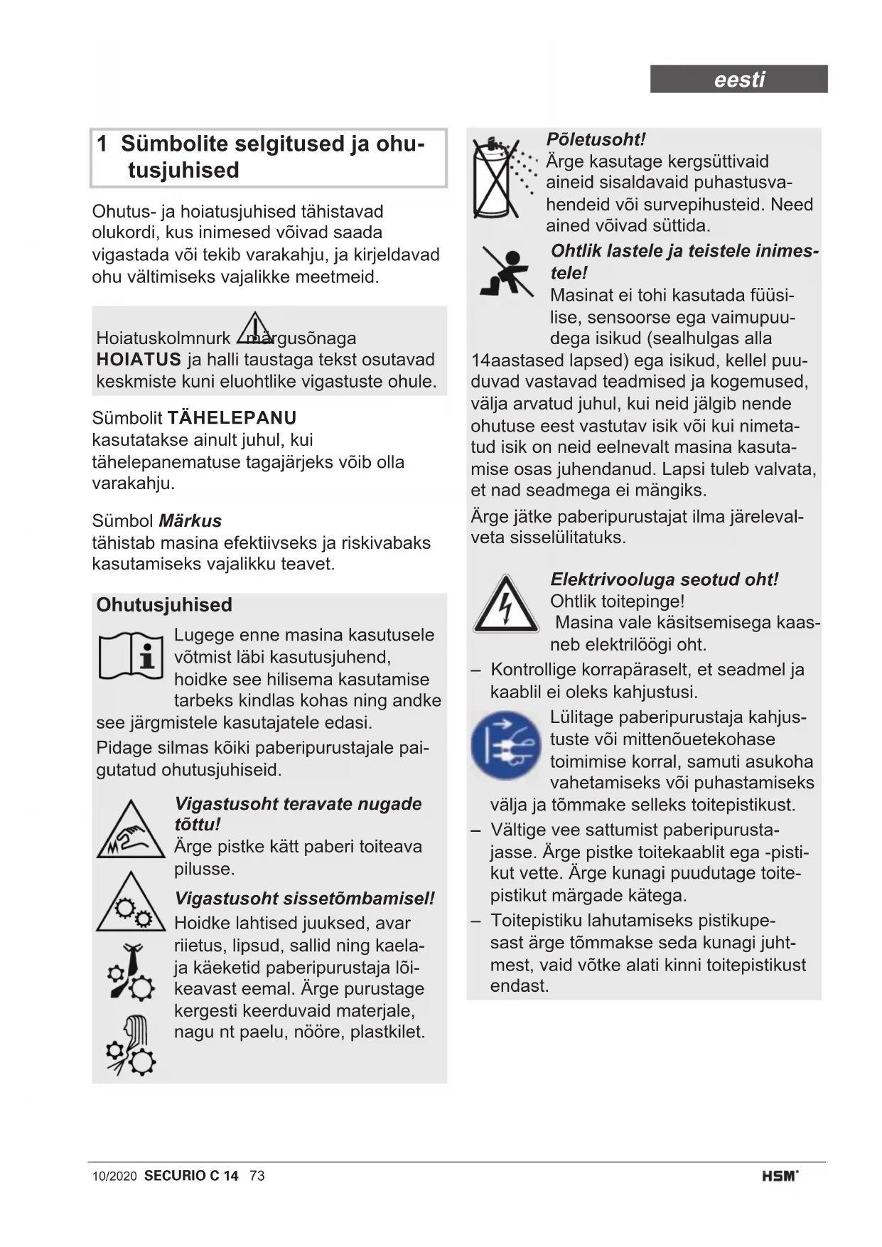- Kasutage start-stopp-automaatikat ja laske lõikeseadmel ilma paberitoiteta töö- tada. Eralduvad paberitolm ja -osakesed. Puhastage paberipurustajat ainult pehme lapi ja õrnatoimelise seebilahusega. Seejuu- res ei tohi vesi sattuda seadme sisemusse. HOIATUS Ohtlik toitepinge! Masina vale käsitsemi- sega kaasneb elektrilöögi oht. Lülitage paberipurustaja asukoha vahetamiseks või puhastamiseks välja ja tõmmake selleks toitepistikust. Hooldustöid, mille käigus tuleb korpuse kaas eemaldada, on lubatud teha vaid HSM-i kliendi- teenindusel ja meie lepingupart- nerite hooldustehnikutel. Kliendi- teeninduse aadressid leiate leheküljelt
