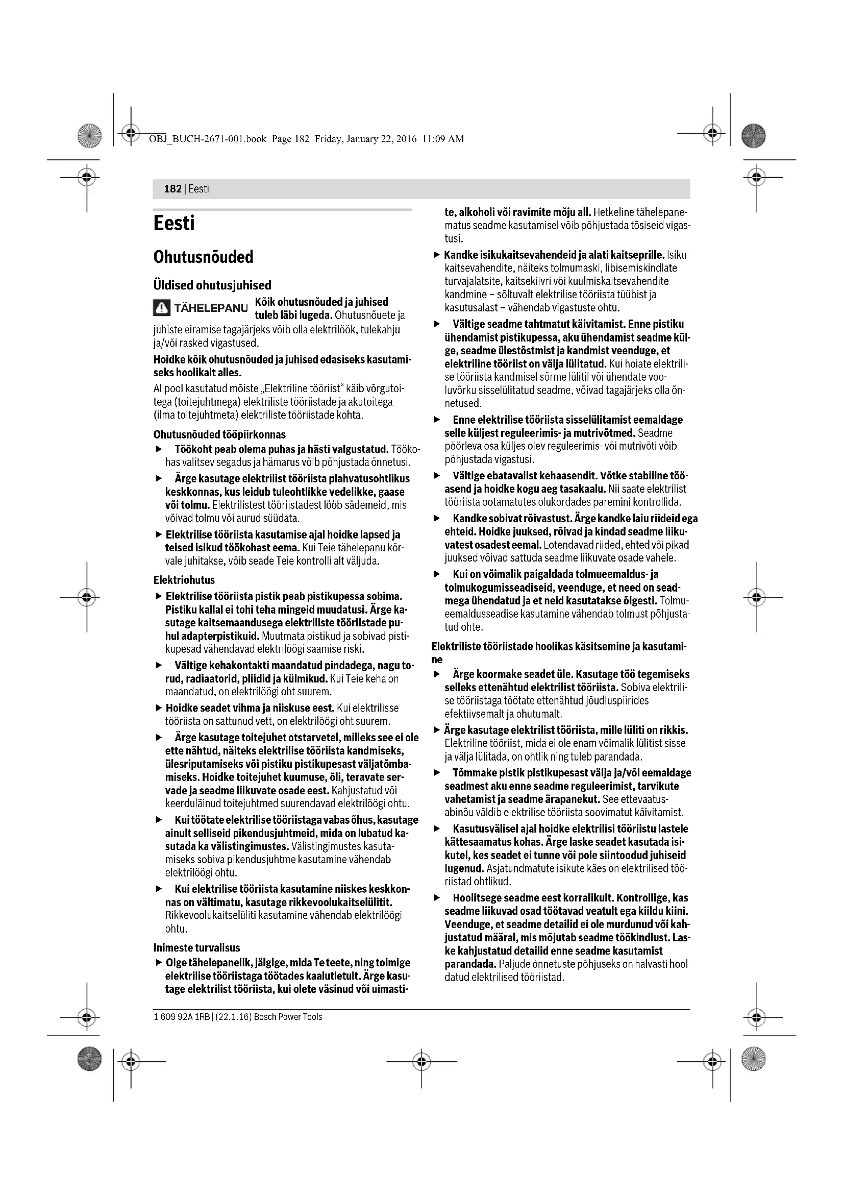 Ärge koormake seadet üle. Kasutage töö tegemiseks selleks ettenähtud elektrilist tööriista. Sobiva elektrili- se tööriistaga töötate ettenähtud jõudluspiirides efektiivsemalt ja ohutumalt. Ärge kasutage elektrilist tööriista, mille lüliti on rikkis. Elektriline tööriist, mida ei ole enam võimalik lülitist sisse ja välja lülitada, on ohtlik ning tuleb parandada. Tõmmake pistik pistikupesast välja ja/või eemaldage seadmest aku enne seadme reguleerimist, tarvikute vahetamist ja seadme ärapanekut. See ettevaatus- abinõu väldib elektrilise tööriista soovimatut käivitamist. Kasutusvälisel ajal hoidke elektrilisi tööriistu lastele kättesaamatus kohas. Ärge laske seadet kasutada isi- kutel, kes seadet ei tunne või pole siintoodud juhiseid lugenud. Asjatundmatute isikute käes on elektrilised töö- riistad ohtlikud. Hoolitsege seadme eest korralikult. Kontrollige, kas seadme liikuvad osad töötavad veatult ega kiildu kiini. Veenduge, et seadme detailid ei ole murdunud või kah- justatud määral, mis mõjutab seadme töökindlust. Las- ke kahjustatud detailid enne seadme kasutamist parandada. Paljude õnnetuste põhjuseks on halvasti hool- datud elektrilised tööriistad. TÄHELEPANU OBJ_BUCH-2671-001.book Page 182 Friday, January 22, 2016 11:09 AMEesti | 183 Bosch Power Tools 1 609 92A 1RB | (22.1.16) Hoidke lõiketarvikud teravad ja puhtad. Hoolikalt hool- datud, teravate lõikeservadega lõiketarvikud kiilduvad harvemini kinni ja neid on lihtsam juhtida. Kasutage elektrilist tööriista, lisavarustust, tarvikuid jne vastavalt siintoodud juhistele ning nii, nagu konk- reetse seadmetüübi jaoks ette nähtud. Arvestage see- juures töötingimuste ja teostatava töö iseloomuga. Elektriliste tööriistade nõuetevastane kasutamine võib põhjustada ohtlikke olukordi. Akutööriistade hoolikas käsitsemine ja kasutamine Laadige akusid ainult tootja poolt soovitatud akulaadi- jatega. Akulaadija, mis sobib teatud tüüpi akudele, muu- tub tuleohtlikuks, kui seda kasutatakse teiste akudega. Kasutage elektrilistes tööriistades ainult selleks ette- nähtud akusid. Teiste akude kasutamine võib põhjustada vigastusi ja tulekahjuohtu. Hoidke kasutusel mitteolevad akud eemal kirjaklamb- ritest, müntidest, võtmetest, naeltest, kruvidest või teistest väikestest metallesemetest, mis võivad kon- taktid omavahel ühendada. Akukontaktide vahel tekkiva lühise tagajärjeks võivad olla põletused või tulekahju. Väärkasutuse korral võib akuvedelik välja voolata. Väl- tige sellega kokkupuudet. Juhusliku kokkupuute kor- ral loputage kahjustatud kohta veega. Kui vedelik sa- tub silma, pöörduge lisaks arsti poole. Väljavoolav aku- vedelik võib põhjustada nahaärritusi või põletusi. Teenindus Laske elektrilist tööriista parandada ainult kvalifitsee- ritud spetsialistidel, kes kasutavad originaalvaruosi. Nii tagate püsivalt seadme ohutu töö. Ohutusnõuded puurtrellide ja kruvikeerajate ka- sutamisel