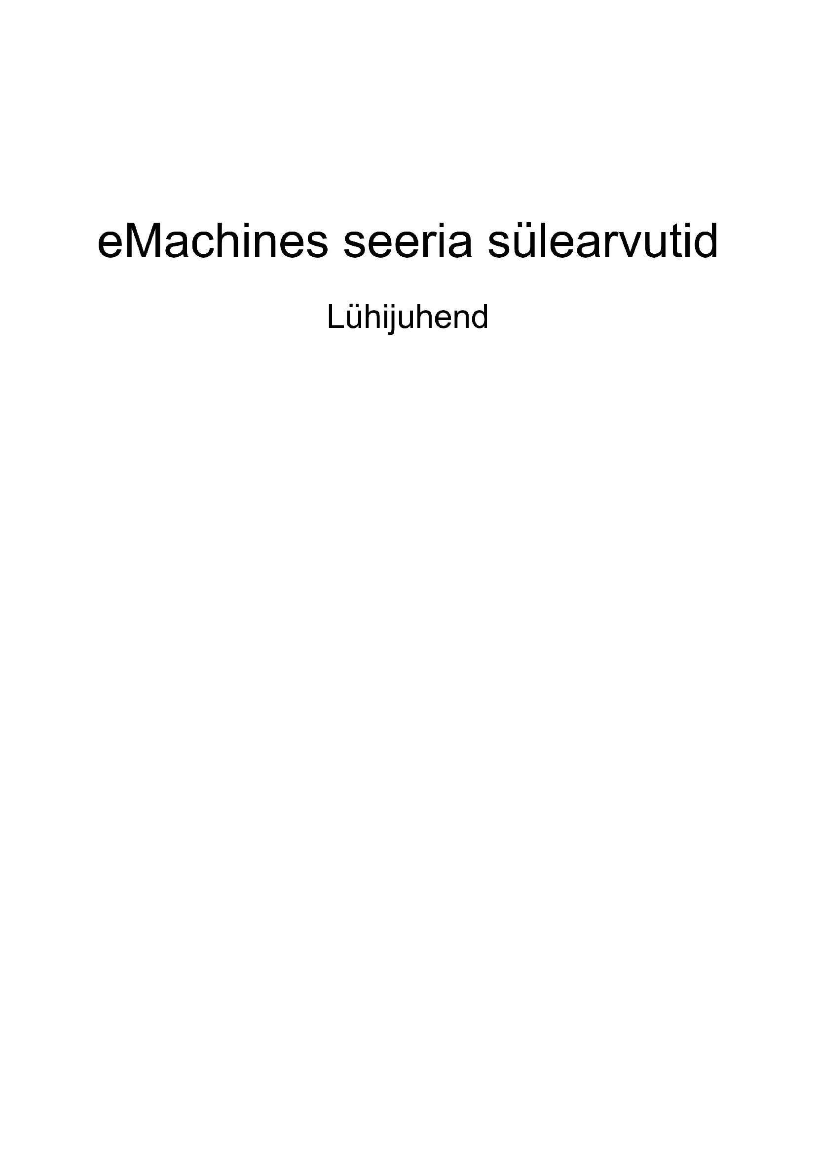 4eMachines seeria sülearvutid LühijuhendMudeli number: ________________________________ Seerianumber: _________________________________ Ostukuupäev: _________________________________ Ostukoht: _____________________________________ © 2010 Kõik õigused kaitstud. eMachines seeria sülearvutite lühijuhend Originaalväljaanne: 06/20103 Kõigepealt tähtsamad asjad Täname Teid selle eest, et valisite oma kaasaskantavaks arvutiks eMachines'i sülearvuti. Teie teejuhid Et aidata Teil kasutada oma eMachines 'i sülearvutit, oleme loonud komplekti juhiseid: Kõigepealt aitab seadistuse poster Teil alustada oma arvuti häälestamist. Trükitud eMachines üldkasutusjuhend sisaldab kõigile eMachines tooterea mudelitele kohalduvat kasulikku teavet. See katab põhilisi teemasid nagu süsteemi taastamine, klaviatuuri kasutamine, heli jne. Palume mõista, et tulenevalt nende loomusest viitab eMachines’i üldkasutusjuhend aeg-ajalt funktsioonidele või omadustele, mis on ainult teatud mudelitel, kuid mitte tingimata Teie ostetud mudelil. Sellised juhtumid on tekstis märgitud väljenditega nagu „ainult teatud mudelitel”. Lühijuhend tutvustab Teile uue arvuti põhilisi omadusi ja funktsioone. Lisateavet selle kohta, kuidas Teie arvuti aitab Teil produktiivsem olla, leiate eMachines'i üldkasutusjuhendist, mis sisaldab üksikasjalikku teavet sellistel teemadel, nagu süsteemi utiliidid, andmete taastamine, laiendusvõimalused ning tõrkeotsing. Sellele lisaks sisaldab see garantiiinformatsiooni ning sülearvuti kohta kehtivaid üldiseid regulatsioone ja ohutuseeskirju. See on saadaval PDF-formaadis (Portable Document Format) ning on laetud Teie sülearvutisse. Juhised selle avamiseks: 1 Klõpsake Start > Kõik programmid > eMachines’i dokumendid. 2 Klõpsake real eMachines’i üldkasutusjuhend. Märkus: Faili vaatamiseks on vaja Adobe Reader'it. Kui Adobe Reader pole arvutisse installeeritud, käivitab eMachines’i üldkasutusjuhend'ile klõpsamine kõigepealt Adobe Reader'i installeerimisprogrammi. Installeerimise lõpetamiseks järgige ekraanil olevaid juhiseid. Juhiseid Adobe Reader'i kasutamiseks leiate menüüst Spikker ja tugi.4 Eesti Teie eMachines sülearvuti ülevaade Kui olete oma arvuti häälestanud häälestuse postril kujutatud viisil, lubage meil teile tutvustada teie uut eMachines’i sülearvutit. Pealtvaade