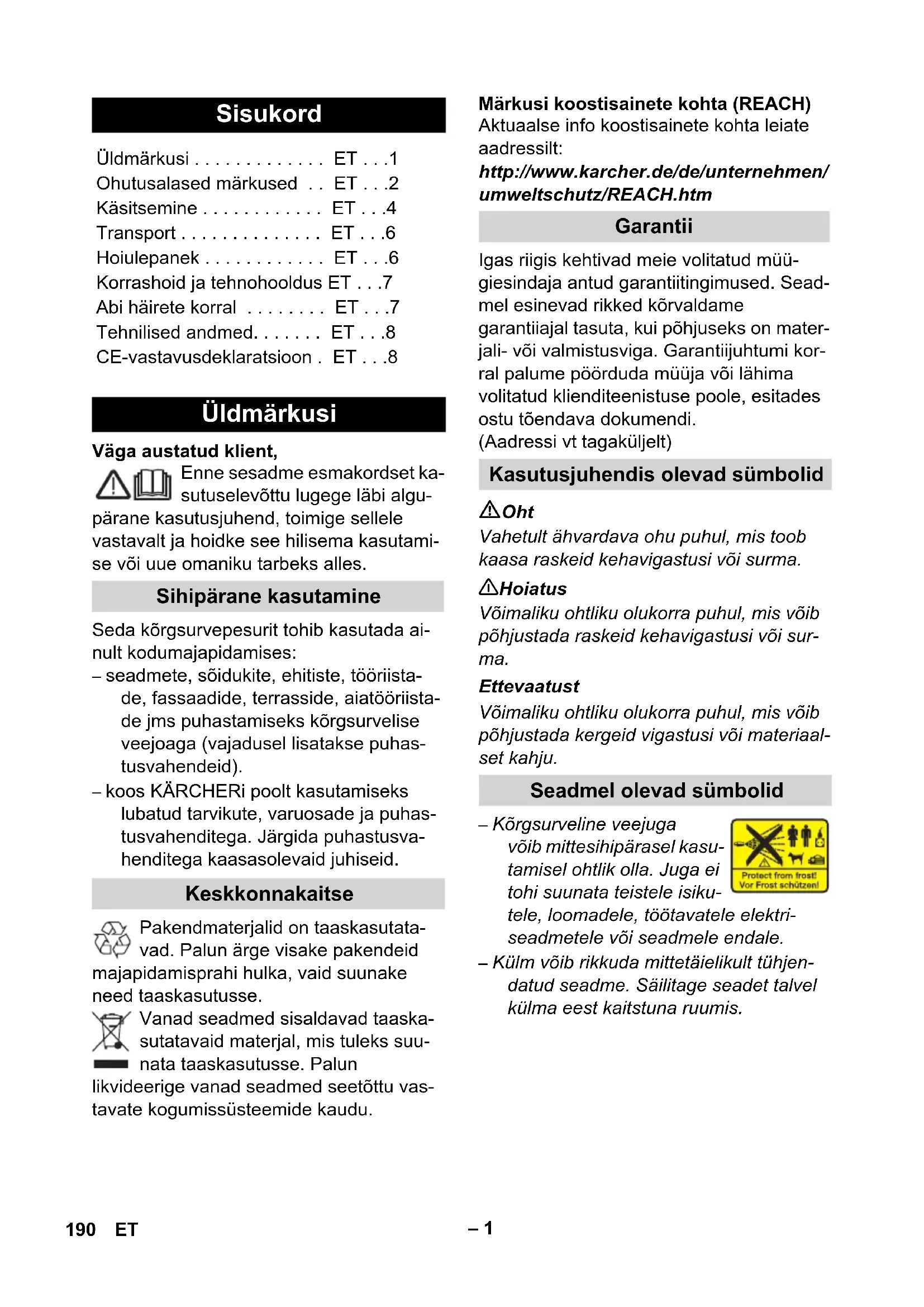 - 2006/42/EO (+2009/127/EO) 2004/108/ÅÎ 2000/14/ЕО Намерили приложение хармонизира- ни стандарти: EN 55014–1: 2006 + A1: 2009 EN 55014–2: 1997 + A2: 2008 EN 60335–1 EN 60335–2–79 EN 61000–3–2: 2006 + A2: 2009 EN 61000–3–3: 2008 EN 62233: 2008 Приложен метод за оценка на съот- ветствието: 2000/14/ЕО: Приложение V ниво на шум dB(A) Измерено:91 Гарантирано:93 CEO Head of Approbation 189BG– 1 Väga austatud klient, Enne sesadme esmakordset ka- sutuselevõttu lugege läbi algu- pärane kasutusjuhend, toimige sellele vastavalt ja hoidke see hilisema kasutami- se või uue omaniku tarbeks alles. Seda kõrgsurvepesurit tohib kasutada ai- nult kodumajapidamises: – seadmete, sõidukite, ehitiste, tööriista- de, fassaadide, terrasside, aiatööriista- de jms puhastamiseks kõrgsurvelise veejoaga (vajadusel lisatakse puhas- tusvahendeid). – koos KÄRCHERi poolt kasutamiseks lubatud tarvikute, varuosade ja puhas- tusvahenditega. Järgida puhastusva- henditega kaasasolevaid juhiseid. Pakendmaterjalid on taaskasutata- vad. Palun ärge visake pakendeid majapidamisprahi hulka, vaid suunake need taaskasutusse. Vanad seadmed sisaldavad taaska- sutatavaid materjal, mis tuleks suu- nata taaskasutusse. Palun likvideerige vanad seadmed seetõttu vas- tavate kogumissüsteemide kaudu. Märkusi koostisainete kohta (REACH) Aktuaalse info koostisainete kohta leiate aadressilt: http://www.karcher.de/de/unternehmen/ umweltschutz/REACH.htm Igas riigis kehtivad meie volitatud müü- giesindaja antud garantiitingimused. Sead- mel esinevad rikked kõrvaldame garantiiajal tasuta, kui põhjuseks on mater- jali- või valmistusviga. Garantiijuhtumi kor- ral palume pöörduda müüja või lähima volitatud klienditeenistuse poole, esitades ostu tõendava dokumendi. (Aadressi vt tagaküljelt) Oht Vahetult ähvardava ohu puhul, mis toob kaasa raskeid kehavigastusi või surma. 몇 Hoiatus Võimaliku ohtliku olukorra puhul, mis võib põhjustada raskeid kehavigastusi või sur- ma. Ettevaatust Võimaliku ohtliku olukorra puhul, mis võib põhjustada kergeid vigastusi või materiaal- set kahju. – Kõrgsurveline veejuga võib mittesihipärasel kasu- tamisel ohtlik olla. Juga ei tohi suunata teistele isiku- tele, loomadele, töötavatele elektri- seadmetele või seadmele endale. – Külm võib rikkuda mittetäielikult tühjen- datud seadme. Säilitage seadet talvel külma eest kaitstuna ruumis. Sisukord Üldmärkusi