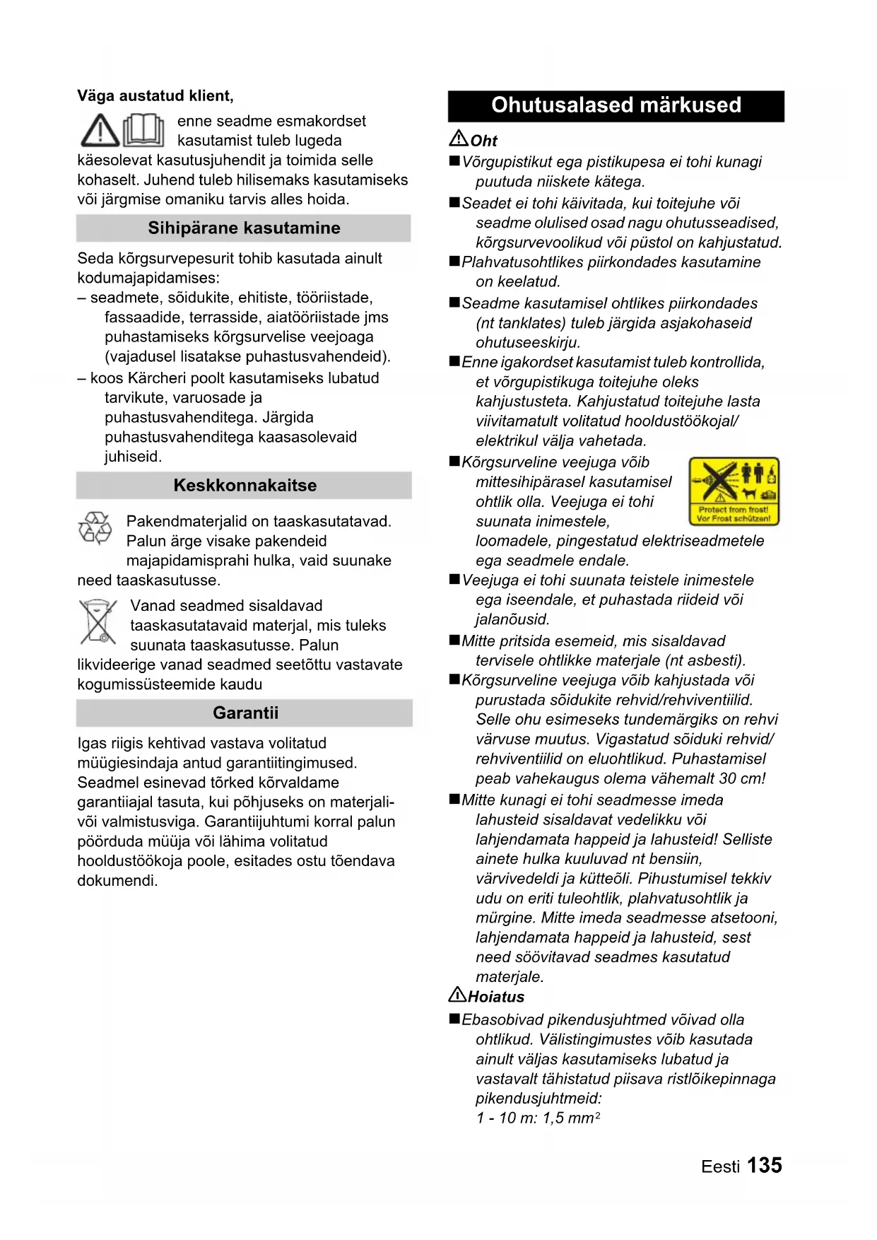 EN 60335–1 EN 60335–2–79 EN 55014–1: 2000 + A1: 2001 + A2: 2002 EN 55014–2: 1997 + A1: 2001 EN 61000–3–2: 2000 + A2: 2005 EN 61000–3–3: 1995 + A1: 2001 Приложен метод за оценка на съответствието: Приложение V ниво на шум dB(A) Измерено: 85 dB(A) Гарантирано: 87 dB(A)Eesti 135 Väga austatud klient, enne seadme esmakordset kasutamist tuleb lugeda käesolevat kasutusjuhendit ja toimida selle kohaselt. Juhend tuleb hilisemaks kasutamiseks või järgmise omaniku tarvis alles hoida. Seda kõrgsurvepesurit tohib kasutada ainult kodumajapidamises: – seadmete, sõidukite, ehitiste, tööriistade, fassaadide, terrasside, aiatööriistade jms puhastamiseks kõrgsurvelise veejoaga (vajadusel lisatakse puhastusvahendeid). – koos Kärcheri poolt kasutamiseks lubatud tarvikute, varuosade ja puhastusvahenditega. Järgida puhastusvahenditega kaasasolevaid juhiseid. Pakendmaterjalid on taaskasutatavad. Palun ärge visake pakendeid majapidamisprahi hulka, vaid suunake need taaskasutusse. Vanad seadmed sisaldavad taaskasutatavaid materjal, mis tuleks suunata taaskasutusse. Palun likvideerige vanad seadmed seetõttu vastavate kogumissüsteemide kaudu Igas riigis kehtivad vastava volitatud müügiesindaja antud garantiitingimused. Seadmel esinevad tõrked kõrvaldame garantiiajal tasuta, kui põhjuseks on materjali- või valmistusviga. Garantiijuhtumi korral palun pöörduda müüja või lähima volitatud hooldustöökoja poole, esitades ostu tõendava dokumendi. Oht ! Võrgupistikut ega pistikupesa ei tohi kunagi puutuda niiskete kätega. ! Seadet ei tohi käivitada, kui toitejuhe või seadme olulised osad nagu ohutusseadised, kõrgsurvevoolikud või püstol on kahjustatud. ! Plahvatusohtlikes piirkondades kasutamine on keelatud. ! Seadme kasutamisel ohtlikes piirkondades (nt tanklates) tuleb järgida asjakohaseid ohutuseeskirju. ! Enne igakordset kasutamist tuleb kontrollida, et võrgupistikuga toitejuhe oleks kahjustusteta. Kahjustatud toitejuhe lasta viivitamatult volitatud hooldustöökojal/ elektrikul välja vahetada. ! Kõrgsurveline veejuga võib mittesihipärasel kasutamisel ohtlik olla. Veejuga ei tohi suunata inimestele, loomadele, pingestatud elektriseadmetele ega seadmele endale. ! Veejuga ei tohi suunata teistele inimestele ega iseendale, et puhastada riideid või jalanõusid. ! Mitte pritsida esemeid, mis sisaldavad tervisele ohtlikke materjale (nt asbesti). ! Kõrgsurveline veejuga võib kahjustada või purustada sõidukite rehvid/rehviventiilid. Selle ohu esimeseks tundemärgiks on rehvi värvuse muutus. Vigastatud sõiduki rehvid/ rehviventiilid on eluohtlikud. Puhastamisel peab vahekaugus olema vähemalt 30 cm! ! Mitte kunagi ei tohi seadmesse imeda lahusteid sisaldavat vedelikku või lahjendamata happeid ja lahusteid! Selliste ainete hulka kuuluvad nt bensiin, värvivedeldi ja kütteõli. Pihustumisel tekkiv udu on eriti tuleohtlik, plahvatusohtlik ja mürgine. Mitte imeda seadmesse atsetooni, lahjendamata happeid ja lahusteid, sest need söövitavad seadmes kasutatud materjale. 몇 Hoiatus ! Ebasobivad pikendusjuhtmed võivad olla ohtlikud. Välistingimustes võib kasutada ainult väljas kasutamiseks lubatud ja vastavalt tähistatud piisava ristlõikepinnaga pikendusjuhtmeid: