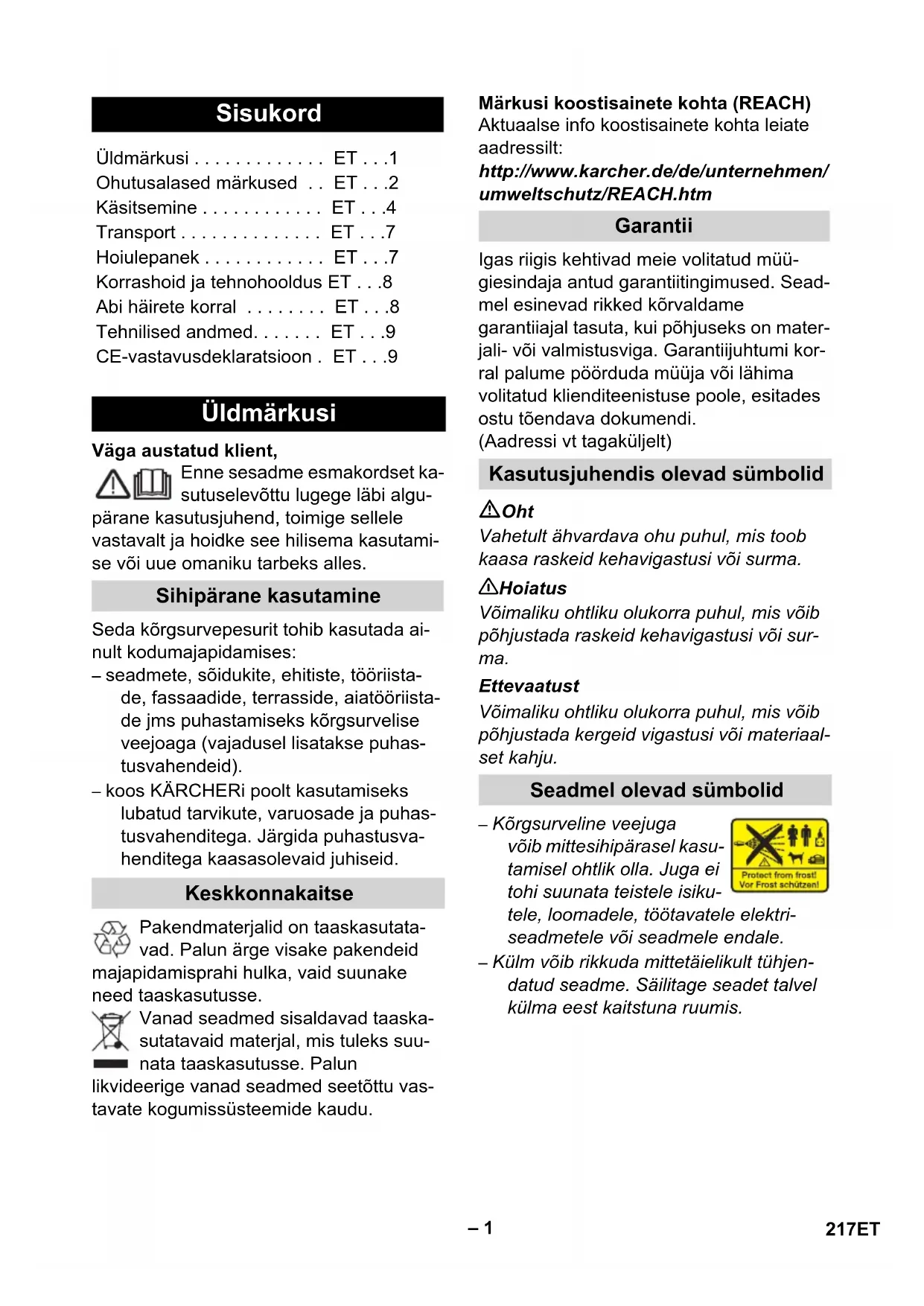 - CE-vastavusdeklaratsioon . ET Üldmärkusi Sihipärane kasutamine Keskkonnakaitse Garantii Kasutusjuhendis olevad sümbolid Seadmel olevad sümbolid 217ET– 2 Oht Võrgupistikut ega pistikupesa ei tohi ku- nagi puutuda niiskete kätega. Seadet ei tohi käivitada, kui toitejuhe või seadme olulised osad nagu kõrgsur- vevoolik, pesupüstol või ohutusseadi- sed on kahjustatud. Enne igakordset kasutamist tuleb kont- rollida, et võrgupistikuga toitekaabel oleks kahjustusteta. Defektne toitekaa- bel tuleb lasta viivitamatult volitatud klienditeeninduses/elektrikul välja va- hetada. Enne igakordset kasutamist tuleb kant- rollida, et kõrsurvevoolik oleks terve. Kahjustatud kõrgsurvevoolik kohe välja vahetada. Plahvatusohtlikes piirkondades kasuta- mine on keelatud. Seadme kasutamisel ohtlikes piirkon- dades (nt tanklates) tuleb järgida asja- kohaseid ohutuseeskirju. Kõrgsurveline veejuga võib mittesihipä- rasel kasutamisel ohtlik olla. Veejuga ei tohi suunata inimestele, loomadele, pin- gestatud elektriseadmetele ega sead- mele endale. Kõrgsurvejuga ei tohi suunata teistele inimestele ega iseendale, et puhastada riideid või jalanõusid. Mitte pritsida esemeid, mis sisaldavad tervisele ohtlikke materjale (nt asbesti). Kõrgsurveline veejuga võib kahjustada või purustada sõidukite rehvid/rehvi- ventiilid. Selle ohu esimeseks tunde- märgiks on rehvi värvuse muutus. Vigastatud sõiduki rehvid/rehviventiilid on eluohtlikud. Puhastamisel peab va- hekaugus olema vähemalt 30 cm! Plahvatusoht! Ärge piserdage põlevaid vedelikke. Mitte kunagi ei tohi seadmesse imeda lahusteid sisaldavat vedelikku või lah- jendamata happeid ja lahusteid! Selliste ainete hulka kuuluvad nt bensiin, värvi- vedeldi ja kütteõli. Pihustumisel tekkiv udu on eriti tuleohtlik, plahvatusohtlik ja mürgine. Mitte kasutada atsetooni, lah- jendamata happeid ja lahusteid, sest need söövitavad seadmes kasutatud materjale. 몇 Hoiatus Toitepistik ja pikenduskaabli ühendus peavad olema veekindlad ega tohi leba- da vees. Ebasobivad pikendusjuhtmed võivad olla ohtlikud. Välistingimustes võib ka- sutada ainult väljas kasutamiseks luba- tud ja vastavalt tähistatud piisava ristlõikepinnaga pikendusjuhtmeid: p. 9
