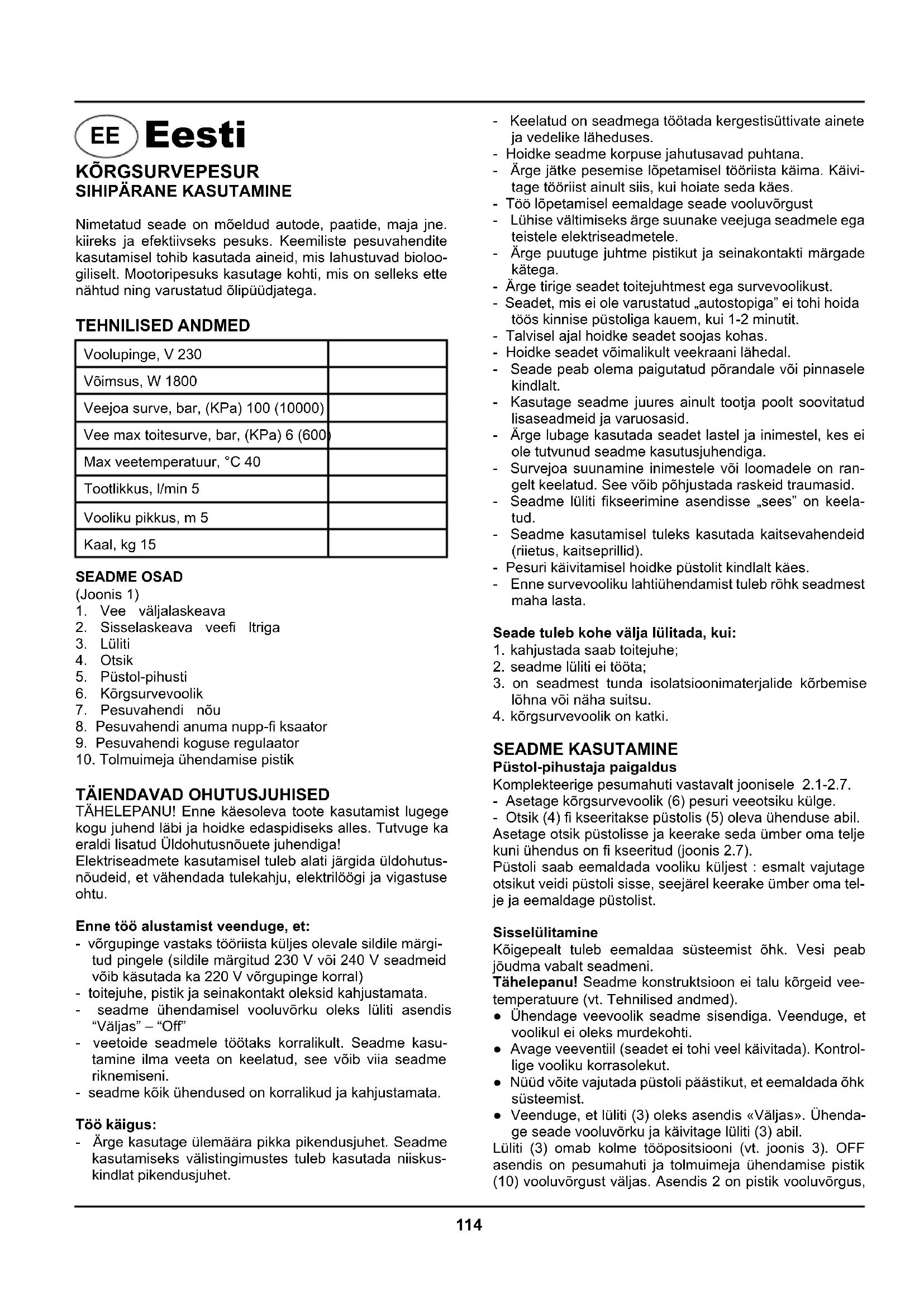 TÄHELEPANU! Enne käesoleva toote kasutamist lugege kogu juhend läbi ja hoidke edaspidiseks alles. Tutvuge ka eraldi lisatud Üldohutusnõuete juhendiga!Elektriseadmete kasutamisel tuleb alati järgida üldohutus-nõudeid, et vähendada tulekahju, elektrilöögi ja vigastuse ohtu.Enne töö alustamist veenduge, et:- võrgupinge vastaks tööriista küljes olevale sildile märgi-tud pingele (sildile märgitud 230 V või 240 V seadmeid võib käsutada ka 220 V võrgupinge korral)- toitejuhe, pistik ja seinakontakt oleksid kahjustamata.- seadme ühendamisel vooluvõrku oleks lüliti asendis “Väljas” – “Off”- veetoide seadmele töötaks korralikult. Seadme kasu-tamine ilma veeta on keelatud, see võib viia seadme riknemiseni.- seadme kõik ühendused on korralikud ja kahjustamata.Töö käigus:- Ärge kasutage ülemäära pikka pikendusjuhet. Seadme kasutamiseks välistingimustes tuleb kasutada niiskus-kindlat pikendusjuhet.- Keelatud on seadmega töötada kergestisüttivate ainete ja vedelike läheduses.- Hoidke seadme korpuse jahutusavad puhtana.- Ärge jätke pesemise lõpetamisel tööriista käima. Käivi-tage tööriist ainult siis, kui hoiate seda käes.- Töö lõpetamisel eemaldage seade vooluvõrgust- Lühise vältimiseks ärge suunake veejuga seadmele ega teistele elektriseadmetele.- Ärge puutuge juhtme pistikut ja seinakontakti märgade kätega.- Ärge tirige seadet toitejuhtmest ega survevoolikust.- Seadet, mis ei ole varustatud „autostopiga” ei tohi hoida töös kinnise püstoliga kauem, kui 1-2 minutit.- Talvisel ajal hoidke seadet soojas kohas.- Hoidke seadet võimalikult veekraani lähedal.- Seade peab olema paigutatud põrandale või pinnasele kindlalt.- Kasutage seadme juures ainult tootja poolt soovitatud lisaseadmeid ja varuosasid.- Ärge lubage kasutada seadet lastel ja inimestel, kes ei ole tutvunud seadme kasutusjuhendiga.- Survejoa suunamine inimestele või loomadele on ran-gelt keelatud. See võib põhjustada raskeid traumasid. - Seadme lüliti ^ kseerimine asendisse „sees” on keela- tud. - Seadme kasutamisel tuleks kasutada kaitsevahendeid (riietus, kaitseprillid).- Pesuri käivitamisel hoidke püstolit kindlalt käes.- Enne survevooliku lahtiühendamist tuleb rõhk seadmest maha lasta.Seade tuleb kohe välja lülitada, kui:1. kahjustada saab toitejuhe;2. seadme lüliti ei tööta;3. on seadmest tunda isolatsioonimaterjalide kõrbemise lõhna või näha suitsu.4. kõrgsurvevoolik on katki. SEADME KASUTAMINE Püstol-pihustaja paigaldusKomplekteerige pesumahuti vastavalt joonisele 2.1-2.7.- Asetage kõrgsurvevoolik (6) pesuri veeotsiku külge.- Otsik (4) ^ kseeritakse püstolis (5) oleva ühenduse abil.Asetage otsik püstolisse ja keerake seda ümber oma telje kuni ühendus on ^ kseeritud (joonis 2.7).Püstoli saab eemaldada vooliku küljest : esmalt vajutage otsikut veidi püstoli sisse, seejärel keerake ümber oma tel-je ja eemaldage püstolist.SisselülitamineKõigepealt tuleb eemaldaa süsteemist õhk. Vesi peab jõudma vabalt seadmeni.Tähelepanu! Seadme konstruktsioon ei talu kõrgeid vee-temperatuure (vt. Tehnilised andmed). Ühendage veevoolik seadme sisendiga. Veenduge, et voolikul ei oleks murdekohti. Avage veeventiil (seadet ei tohi veel käivitada). Kontrol-lige vooliku korrasolekut. Nüüd võite vajutada püstoli päästikut, et eemaldada õhk süsteemist. Veenduge, et lüliti (3) oleks asendis «Väljas». Ühenda-ge seade vooluvõrku ja käivitage lüliti (3) abil.Lüliti (3) omab kolme tööpositsiooni (vt. joonis 3). OFF asendis on pesumahuti ja tolmuimeja ühendamise pistik (10) vooluvõrgust väljas. Asendis 2 on pistik vooluvõrgus,