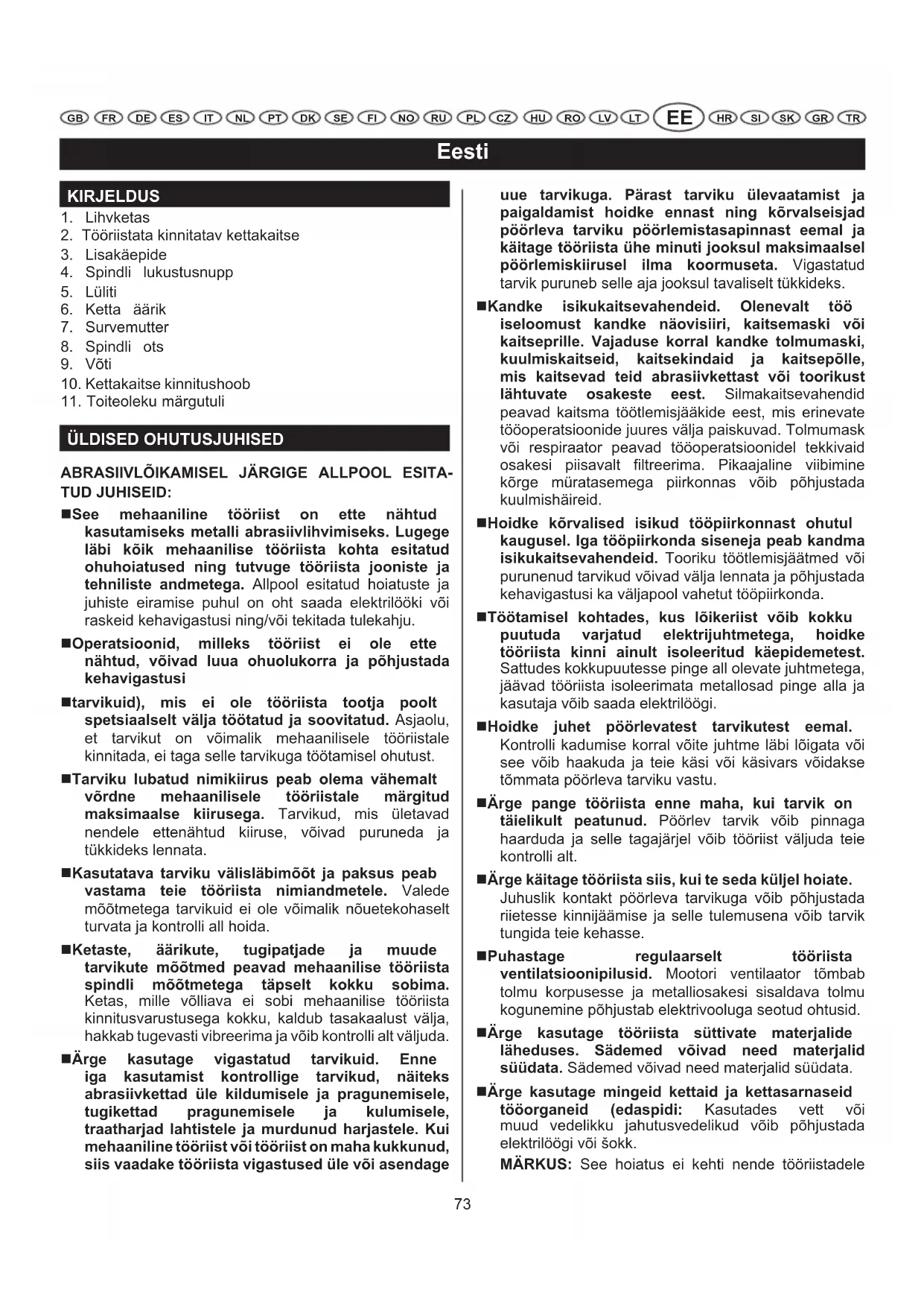 TUD JUHISEID: See mehaaniline tööriist on ette nähtud kasutamiseks metalli abrasiivlihvimiseks. Lugege läbi kõik mehaanilise tööriista kohta esitatud ohuhoiatused ning tutvuge tööriista jooniste ja tehniliste andmetega. Allpool esitatud hoiatuste ja juhiste eiramise puhul on oht saada elektrilööki või raskeid kehavigastusi ning/või tekitada tulekahju. Operatsioonid, milleks tööriist ei ole ette nähtud, võivad luua ohuolukorra ja põhjustada kehavigastusi tarvikuid), mis ei ole tööriista tootja poolt spetsiaalselt välja töötatud ja soovitatud. Asjaolu, et tarvikut on võimalik mehaanilisele tööriistale kinnitada, ei taga selle tarvikuga töötamisel ohutust. Tarviku lubatud nimikiirus peab olema vähemalt võrdne mehaanilisele tööriistale märgitud maksimaalse kiirusega. Tarvikud, mis ületavad nendele ettenähtud kiiruse, võivad puruneda ja tükkideks lennata. Kasutatava tarviku välisläbimõõt ja paksus peab vastama teie tööriista nimiandmetele. Valede mõõtmetega tarvikuid ei ole võimalik nõuetekohaselt turvata ja kontrolli all hoida. Ketaste, äärikute, tugipatjade ja muude tarvikute mõõtmed peavad mehaanilise tööriista spindli mõõtmetega täpselt kokku sobima. Ketas, mille võlliava ei sobi mehaanilise tööriista kinnitusvarustusega kokku, kaldub tasakaalust välja, hakkab tugevasti vibreerima ja võib kontrolli alt väljuda. Ärge kasutage vigastatud tarvikuid. Enne iga kasutamist kontrollige tarvikud, näiteks abrasiivkettad üle kildumisele ja pragunemisele, tugikettad pragunemisele ja kulumisele, traatharjad lahtistele ja murdunud harjastele. Kui mehaaniline tööriist või tööriist on maha kukkunud, siis vaadake tööriista vigastused üle või asendage uue tarvikuga. Pärast tarviku ülevaatamist ja paigaldamist hoidke ennast ning kõrvalseisjad pöörleva tarviku pöörlemistasapinnast eemal ja käitage tööriista ühe minuti jooksul maksimaalsel pöörlemiskiirusel ilma koormuseta. Vigastatud tarvik puruneb selle aja jooksul tavaliselt tükkideks. Kandke isikukaitsevahendeid. Olenevalt töö iseloomust kandke näovisiiri, kaitsemaski või kaitseprille. Vajaduse korral kandke tolmumaski, kuulmiskaitseid, kaitsekindaid ja kaitsepõlle, mis kaitsevad teid abrasiivkettast või toorikust lähtuvate osakeste eest. Silmakaitsevahendid peavad kaitsma töötlemisjääkide eest, mis erinevate tööoperatsioonide juures välja paiskuvad. Tolmumask või respiraator peavad tööoperatsioonidel tekkivaid osakesi piisavalt filtreerima. Pikaajaline viibimine kõrge müratasemega piirkonnas võib põhjustada kuulmishäireid. Hoidke kõrvalised isikud tööpiirkonnast ohutul kaugusel. Iga tööpiirkonda siseneja peab kandma isikukaitsevahendeid. Tooriku töötlemisjäätmed või purunenud tarvikud võivad välja lennata ja põhjustada kehavigastusi ka väljapool vahetut tööpiirkonda. Töötamisel kohtades, kus lõikeriist võib kokku puutuda varjatud elektrijuhtmetega, hoidke tööriista kinni ainult isoleeritud käepidemetest. Sattudes kokkupuutesse pinge all olevate juhtmetega, jäävad tööriista isoleerimata metallosad pinge alla ja kasutaja võib saada elektrilöögi. Hoidke juhet pöörlevatest tarvikutest eemal. Kontrolli kadumise korral võite juhtme läbi lõigata või see võib haakuda ja teie käsi või käsivars võidakse tõmmata pöörleva tarviku vastu. Ärge pange tööriista enne maha, kui tarvik on täielikult peatunud. Pöörlev tarvik võib pinnaga haarduda ja selle tagajärjel võib tööriist väljuda teie kontrolli alt. Ärge käitage tööriista siis, kui te seda küljel hoiate. Juhuslik kontakt pöörleva tarvikuga võib põhjustada riietesse kinnijäämise ja selle tulemusena võib tarvik tungida teie kehasse. Puhastage regulaarselt tööriista ventilatsioonipilusid. Mootori ventilaator tõmbab tolmu korpusesse ja metalliosakesi sisaldava tolmu kogunemine põhjustab elektrivooluga seotud ohtusid. Ärge kasutage tööriista süttivate materjalide läheduses. Sädemed võivad need materjalid süüdata. Sädemed võivad need materjalid süüdata. Ärge kasutage mingeid kettaid ja kettasarnaseid tööorganeid (edaspidi: Kasutades vett või muud vedelikku jahutusvedelikud võib põhjustada elektrilöögi või šokk. MÄRKUS: See hoiatus ei kehti nende tööriistadele74 Eesti