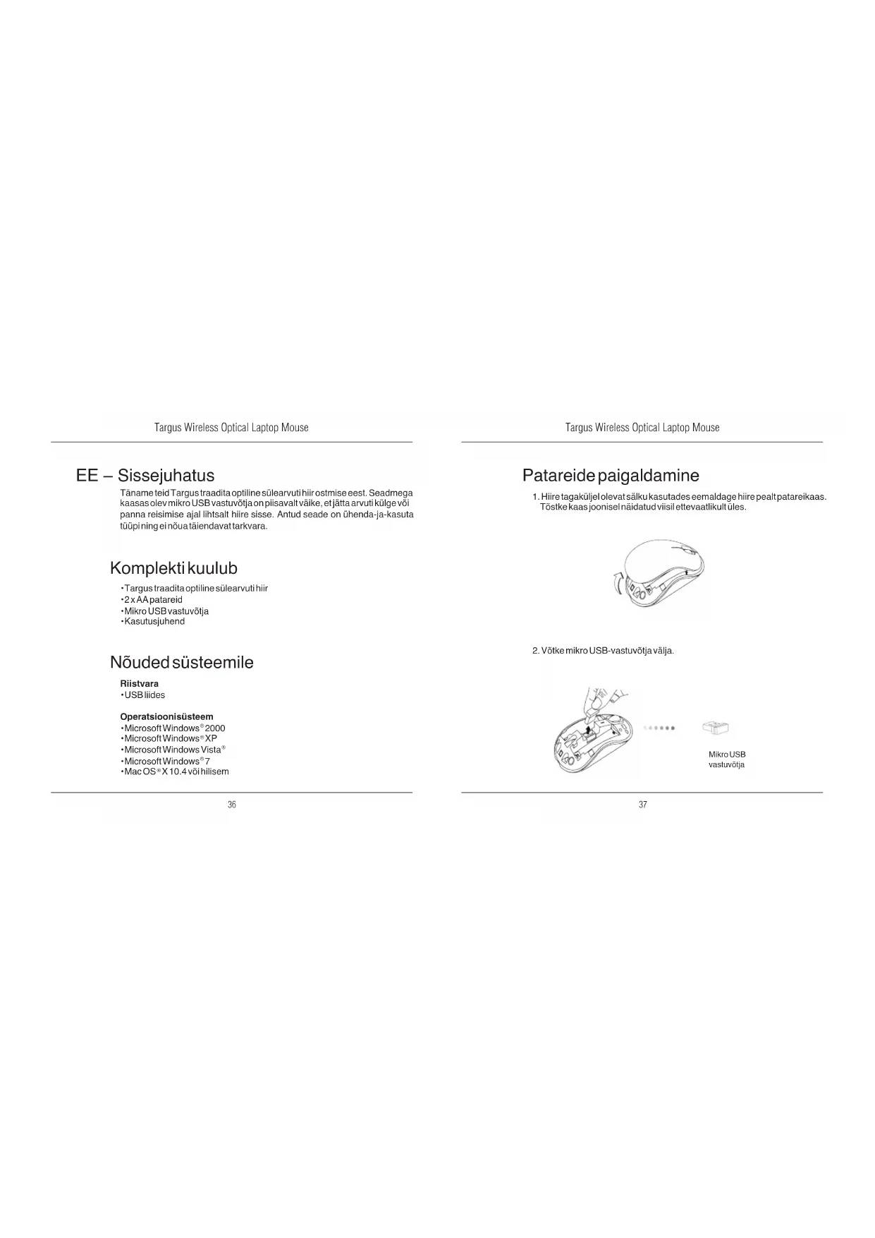 EE – Sissejuhatus Täname teid Targus traadita optiline sülearvuti hiir ostmise eest. Seadmega kaasas olev mikro USB vastuvõtja on piisavalt väike, et jätta arvuti külge või panna reisimise ajal lihtsalt hiire sisse. Antud seade on ühenda-ja-kasuta tüüpi ning ei nõua täiendavat tarkvara. Nõuded süsteemile Riistvara