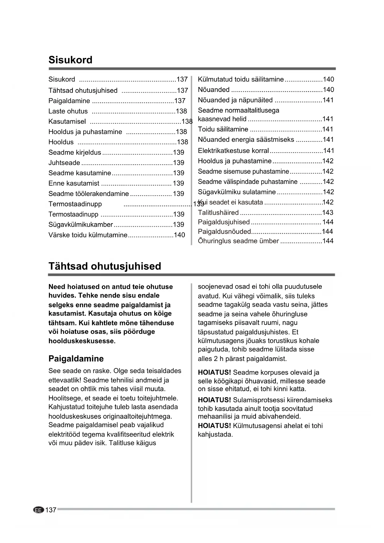 - Need hoiatused on antud teie ohutuse huvides. Tehke nende sisu endale selgeks enne seadme paigaldamist ja kasutamist. Kasutaja ohutus on kõige tähtsam. Kui kahtlete mõne tähenduse või hoiatuse osas, siis pöörduge hoolduskeskusesse. Paigaldamine See seade on raske. Olge seda teisaldades ettevaatlik! Seadme tehnilisi andmeid ja seadet on ohtlik mis tahes viisil muuta. Hoolitsege, et seade ei toetu toitejuhtmele. Kahjustatud toitejuhe tuleb lasta asendada hoolduskeskuses originaaltoitejuhtmega. Seadme paigaldamisel peab vajalikud elektritööd tegema kvalifitseeritud elektrik või muu pädev isik. Talitluse käigus soojenevad osad ei tohi olla puudutusele avatud. Kui vähegi võimalik, siis tuleks seadme tagakülg seada vastu seina, jättes seadme ja seina vahele õhuringluse tagamiseks piisavalt ruumi, nagu täpsustatud paigaldusjuhistes. Et külmutusagens jõuaks torustikus kohale paigutuda, tohib seadme lülitada sisse alles 2 h pärast paigaldamist. HOIATUS! Seadme korpuses olevaid ja selle köögikapi õhuavasid, millesse seade on sisse ehitatud, ei tohi kinni katta. HOIATUS! Sulamisprotsessi kiirendamiseks tohib kasutada ainult tootja soovitatud mehaanilisi ja muid abivahendeid. HOIATUS! Külmutusagensi ahelat ei tohi kahjustada. Tähtsad ohutusjuhised Sisukord Sisukord p. 137