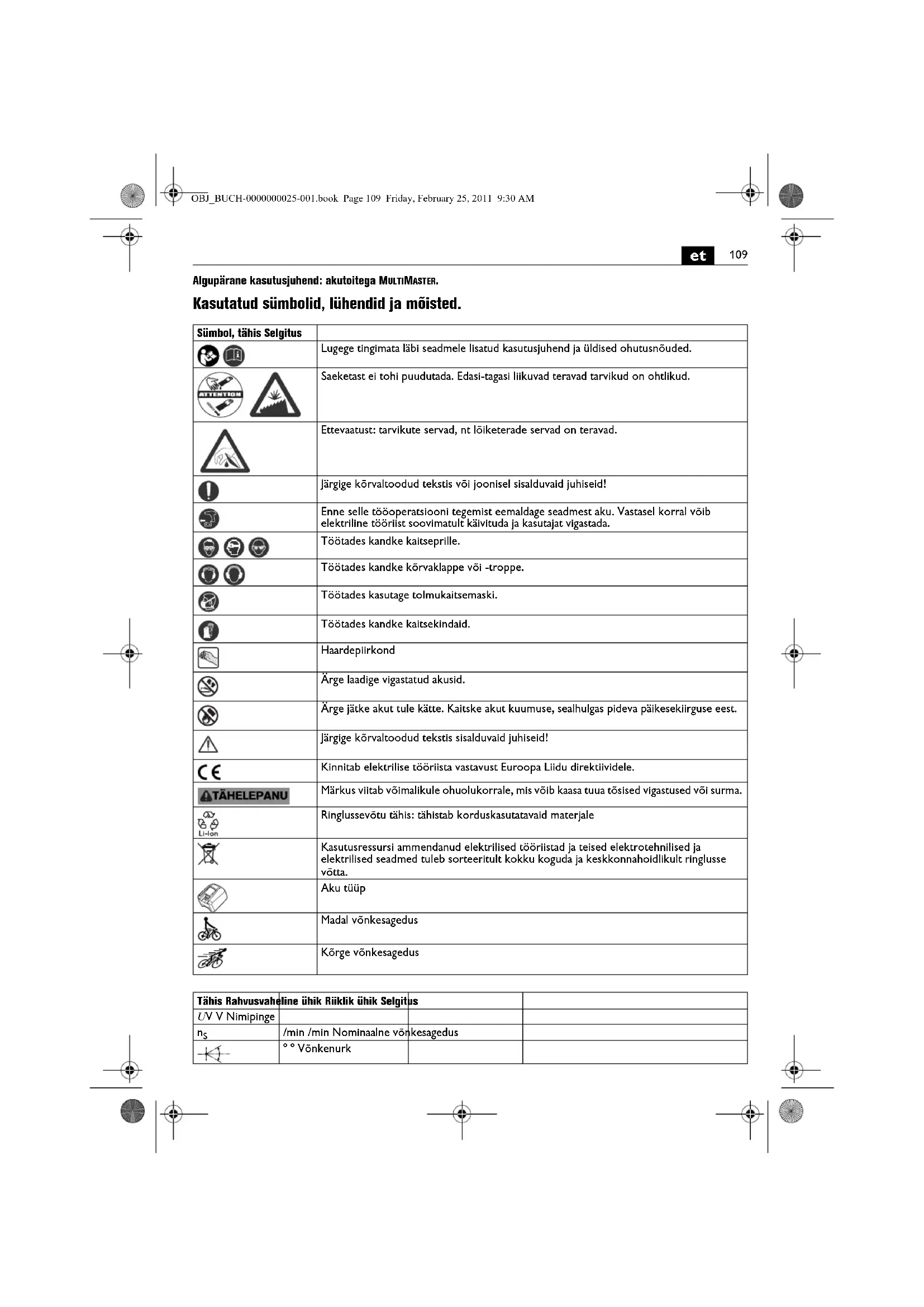 Algupärane kasutusjuhend: akutoitega MULTIMASTER. Kasutatud sümbolid, lühendid ja mõisted. Sümbol, tähis Selgitus Lugege tingimata läbi seadmele lisatud kasutusjuhend ja üldised ohutusnõuded. Saeketast ei tohi puudutada. Edasi-tagasi liikuvad teravad tarvikud on ohtlikud. Ettevaatust: tarvikute servad, nt lõiketerade servad on teravad. Järgige kõrvaltoodud tekstis või joonisel sisalduvaid juhiseid! Enne selle tööoperatsiooni tegemist eemaldage seadmest aku. Vastasel korral võib elektriline tööriist soovimatult käivituda ja kasutajat vigastada. Töötades kandke kaitseprille. Töötades kandke kõrvaklappe või -troppe. Töötades kasutage tolmukaitsemaski. Töötades kandke kaitsekindaid. Haardepiirkond Ärge laadige vigastatud akusid. Ärge jätke akut tule kätte. Kaitske akut kuumuse, sealhulgas pideva päikesekiirguse eest. Järgige kõrvaltoodud tekstis sisalduvaid juhiseid! Kinnitab elektrilise tööriista vastavust Euroopa Liidu direktiividele. Märkus viitab võimalikule ohuolukorrale, mis võib kaasa tuua tõsised vigastused või surma. Ringlussevõtu tähis: tähistab korduskasutatavaid materjale Kasutusressursi ammendanud elektrilised tööriistad ja teised elektrotehnilised ja elektrilised seadmed tuleb sorteeritult kokku koguda ja keskkonnahoidlikult ringlusse võtta. Aku tüüp Madal võnkesagedus Kõrge võnkesagedus Tähis Rahvusvaheline ühik Riiklik ühik Selgitus U V V Nimipinge