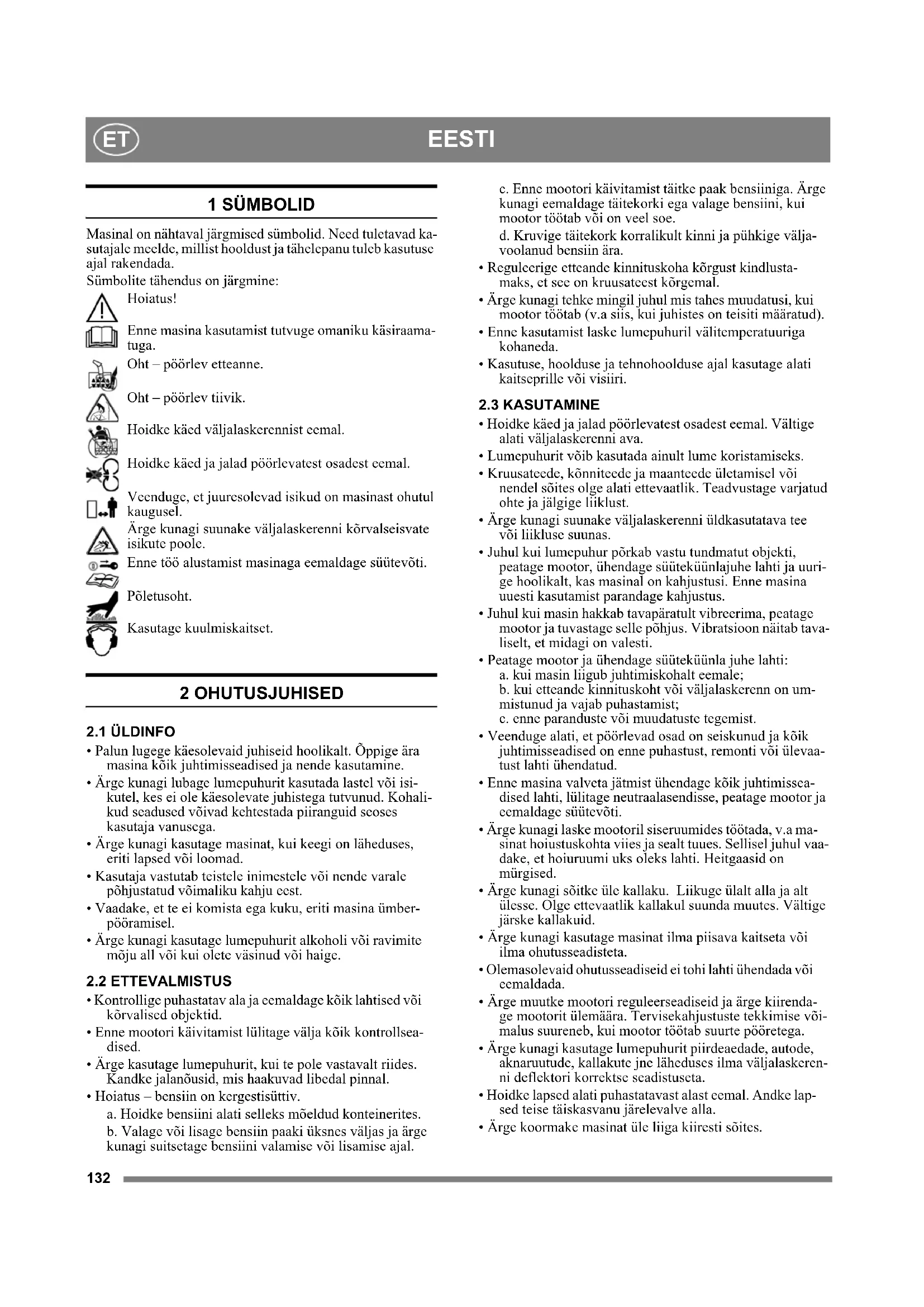 1 SÜMBOLID Masinal on nähtaval järgmised sümbolid. Need tuletavad ka- sutajale meelde, millist hooldust ja tähelepanu tuleb kasutuse ajal rakendada. Sümbolite tähendus on järgmine: Hoiatus! Enne masina kasutamist tutvuge omaniku käsiraama- tuga. Oht – pöörlev etteanne. Oht – pöörlev tiivik. Hoidke käed väljalaskerennist eemal. Hoidke käed ja jalad pöörlevatest osadest eemal. Veenduge, et juuresolevad isikud on masinast ohutul kaugusel. Ärge kunagi suunake väljalaskerenni kõrvalseisvate isikute poole. Enne töö alustamist masinaga eemaldage süütevõti. Põletusoht. Kasutage kuulmiskaitset. 2 OHUTUSJUHISED
