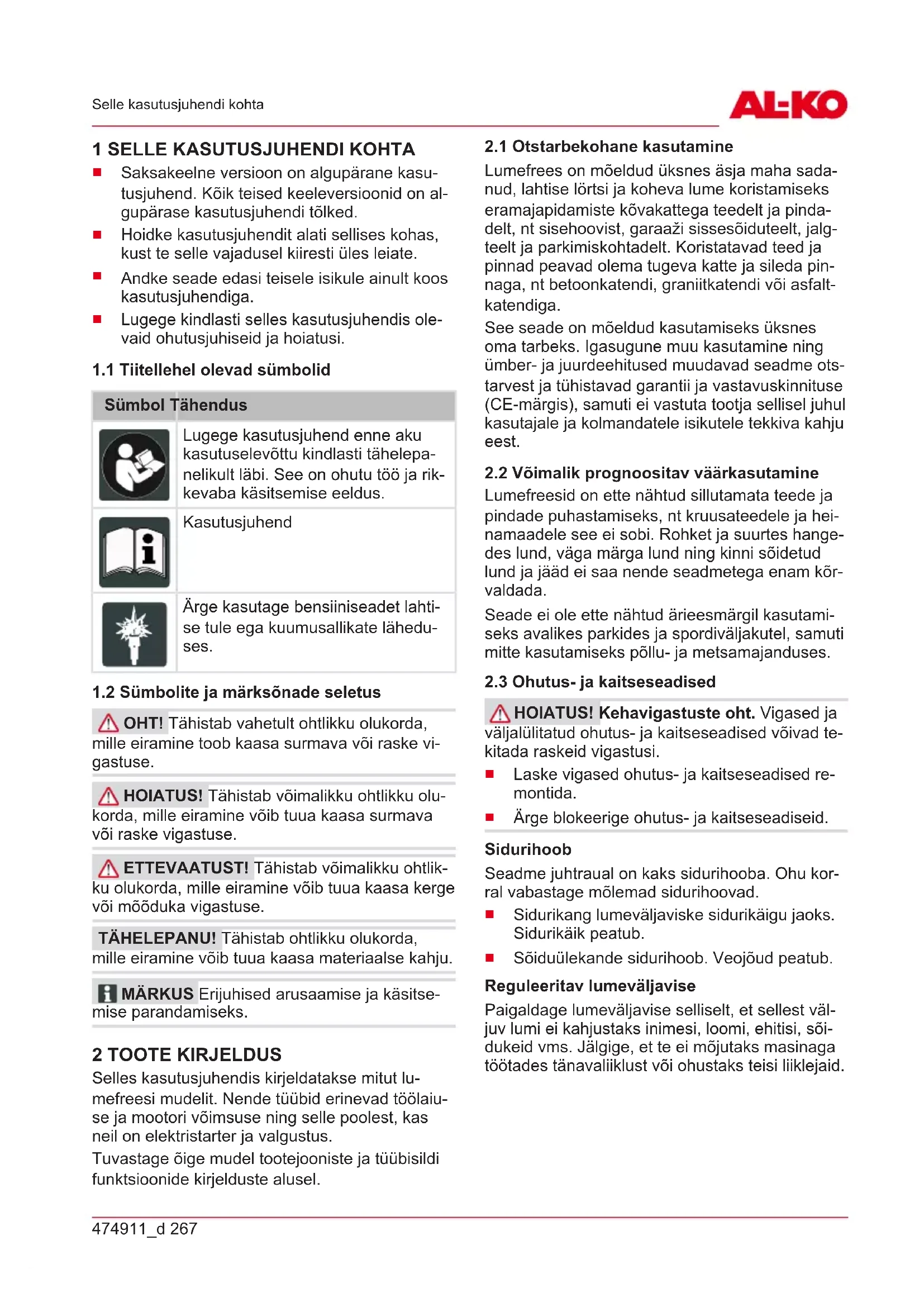 OHT! Tähistab vahetult ohtlikku olukorda, mille eiramine toob kaasa surmava või raske vi- gastuse. HOIATUS! Tähistab võimalikku ohtlikku olu- korda, mille eiramine võib tuua kaasa surmava või raske vigastuse. ETTEVAATUST! Tähistab võimalikku ohtlik- ku olukorda, mille eiramine võib tuua kaasa kerge või mõõduka vigastuse. TÄHELEPANU! Tähistab ohtlikku olukorda, mille eiramine võib tuua kaasa materiaalse kahju. MÄRKUS Erijuhised arusaamise ja käsitse- mise parandamiseks. 2 TOOTE KIRJELDUS Selles kasutusjuhendis kirjeldatakse mitut lu- mefreesi mudelit. Nende tüübid erinevad töölaiu- se ja mootori võimsuse ning selle poolest, kas neil on elektristarter ja valgustus. Tuvastage õige mudel tootejooniste ja tüübisildi funktsioonide kirjelduste alusel.