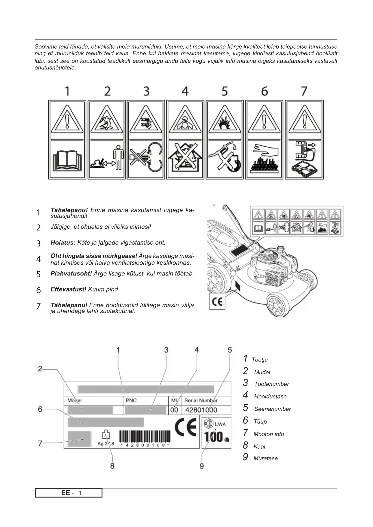 Tähelepanu! Enne masina kasutamist lugege ka- sutusjuhendit. Jälgige, et ohualas ei viibiks inimesi! Hoiatus: Käte ja jalgade vigastamise oht. Oht hingata sisse mürkgaase! Ärge kasutage masi- nat kinnises või halva ventilatsiooniga keskkonnas. Plahvatusoht! Ärge lisage kütust, kui masin töötab. Ettevaatust! Kuum pind Tähelepanu! Enne hooldustöid lülitage masin välja ja ühendage lahti süüteküünal. 1 Tootja 2 Mudel 3 Tootenumber 4 Hooldustase 5 Seerianumber 6 Tüüp 7 Mootori info 8 Kaal 9 MürataseEE -