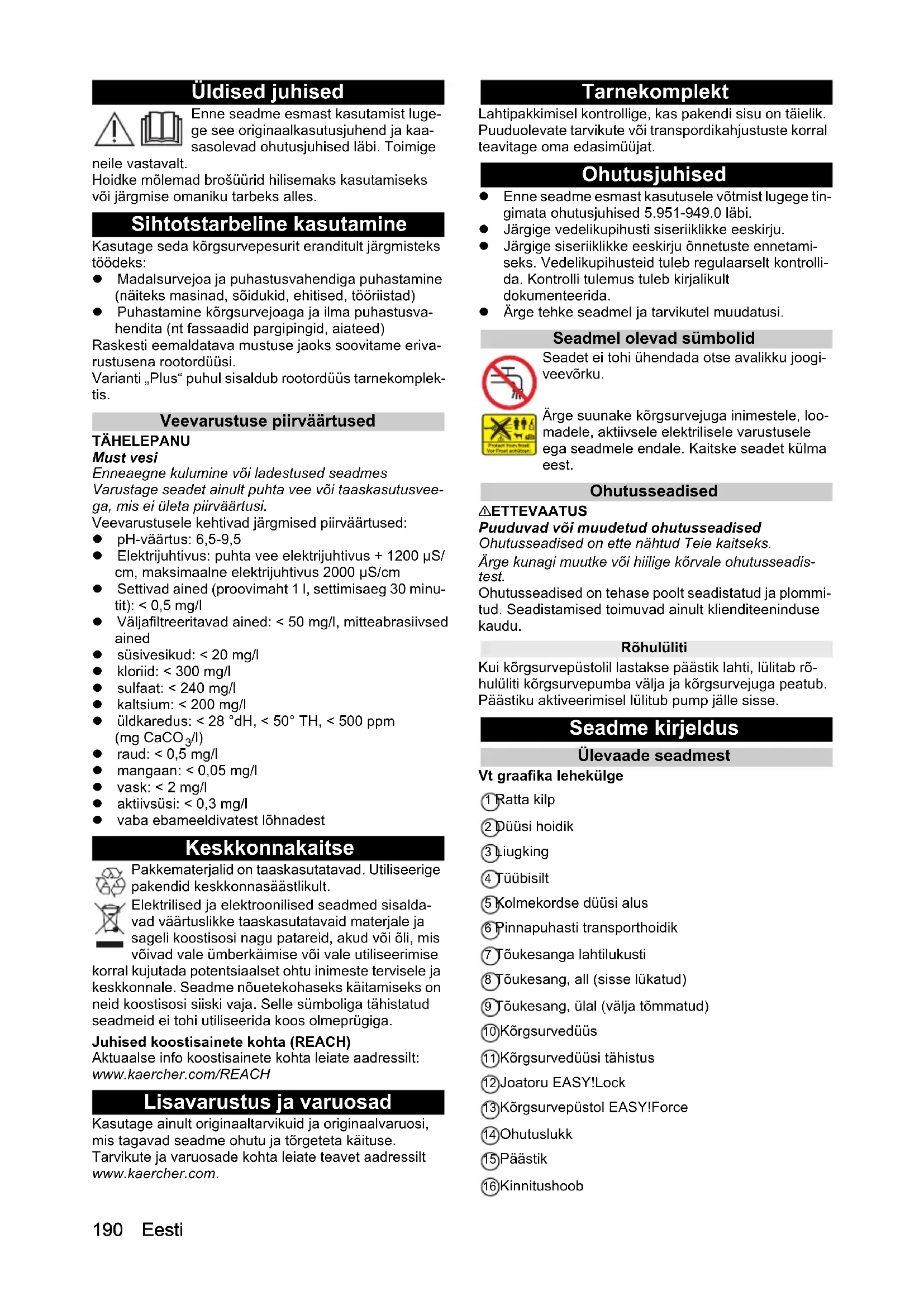 - EL vastavusdeklaratsioon Chairman of the Board of Management Director Regulatory Affairs & Certification H. Jenner S. Reiser190 Eesti Üldised juhised Enne seadme esmast kasutamist luge- ge see originaalkasutusjuhend ja kaa- sasolevad ohutusjuhised läbi. Toimige neile vastavalt. Hoidke mõlemad brošüürid hilisemaks kasutamiseks või järgmise omaniku tarbeks alles. Sihtotstarbeline kasutamine Kasutage seda kõrgsurvepesurit eranditult järgmisteks töödeks: Madalsurvejoa ja puhastusvahendiga puhastamine (näiteks masinad, sõidukid, ehitised, tööriistad) Puhastamine kõrgsurvejoaga ja ilma puhastusva- hendita (nt fassaadid pargipingid, aiateed) Raskesti eemaldatava mustuse jaoks soovitame eriva- rustusena rootordüüsi. Varianti „Plus“ puhul sisaldub rootordüüs tarnekomplek- tis. Veevarustuse piirväärtused TÄHELEPANU Must vesi Enneaegne kulumine või ladestused seadmes Varustage seadet ainult puhta vee või taaskasutusvee- ga, mis ei ületa piirväärtusi. Veevarustusele kehtivad järgmised piirväärtused: pH-väärtus: 6,5-9,5 Elektrijuhtivus: puhta vee elektrijuhtivus + 1200 µS/ cm, maksimaalne elektrijuhtivus 2000 µS/cm Settivad ained (proovimaht 1 l, settimisaeg 30 minu- tit): < 0,5 mg/l Väljafiltreeritavad ained: < 50 mg/l, mitteabrasiivsed ained süsivesikud: < 20 mg/l kloriid: < 300 mg/l sulfaat: < 240 mg/l kaltsium: < 200 mg/l üldkaredus: < 28 °dH, < 50° TH, < 500 ppm (mg CaCO p. 197