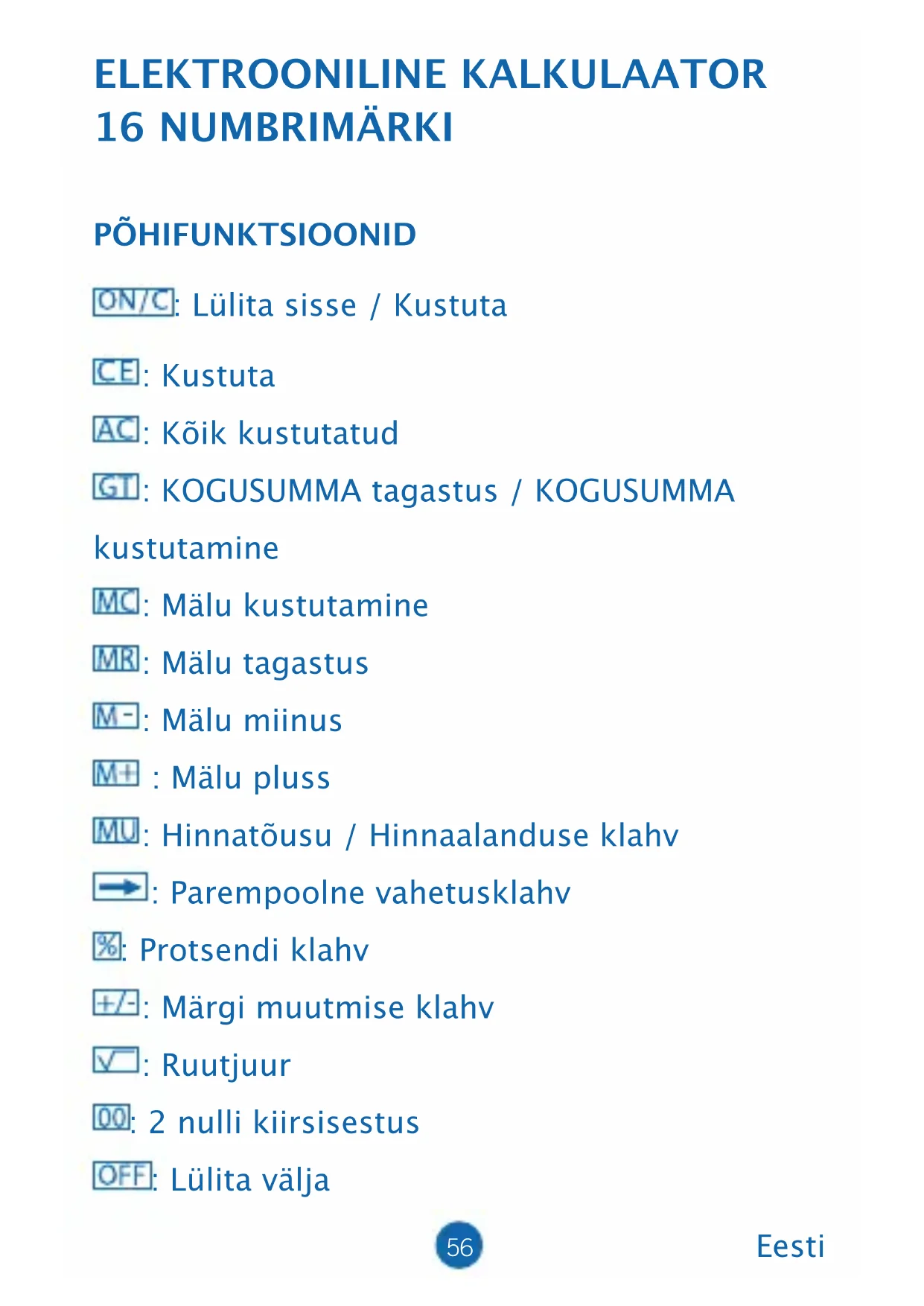 eemaldage see. (2) Kasutage kruvikeerajat või muud selleks sobivat vahendit patarei välja lükkamiseks. (Märkus: lükake väljapoole) *Olge ettevaatlik ja püüdke vooluala mitte kahjustada. VÄLJU (3) Lükake uus patarei vastupidises suunas sisse (palun pange tähele, et patarei + pool peaks olema ülesse suunatud) (4) Pange kaas tagasi ja keerake kruvi kinni (ärge üle pingutage) (5) Automaatne väljalülitus: Umbes 8 minuti pärast.61 ELEKTRONISKS KALKULATORS 16 CIPARI