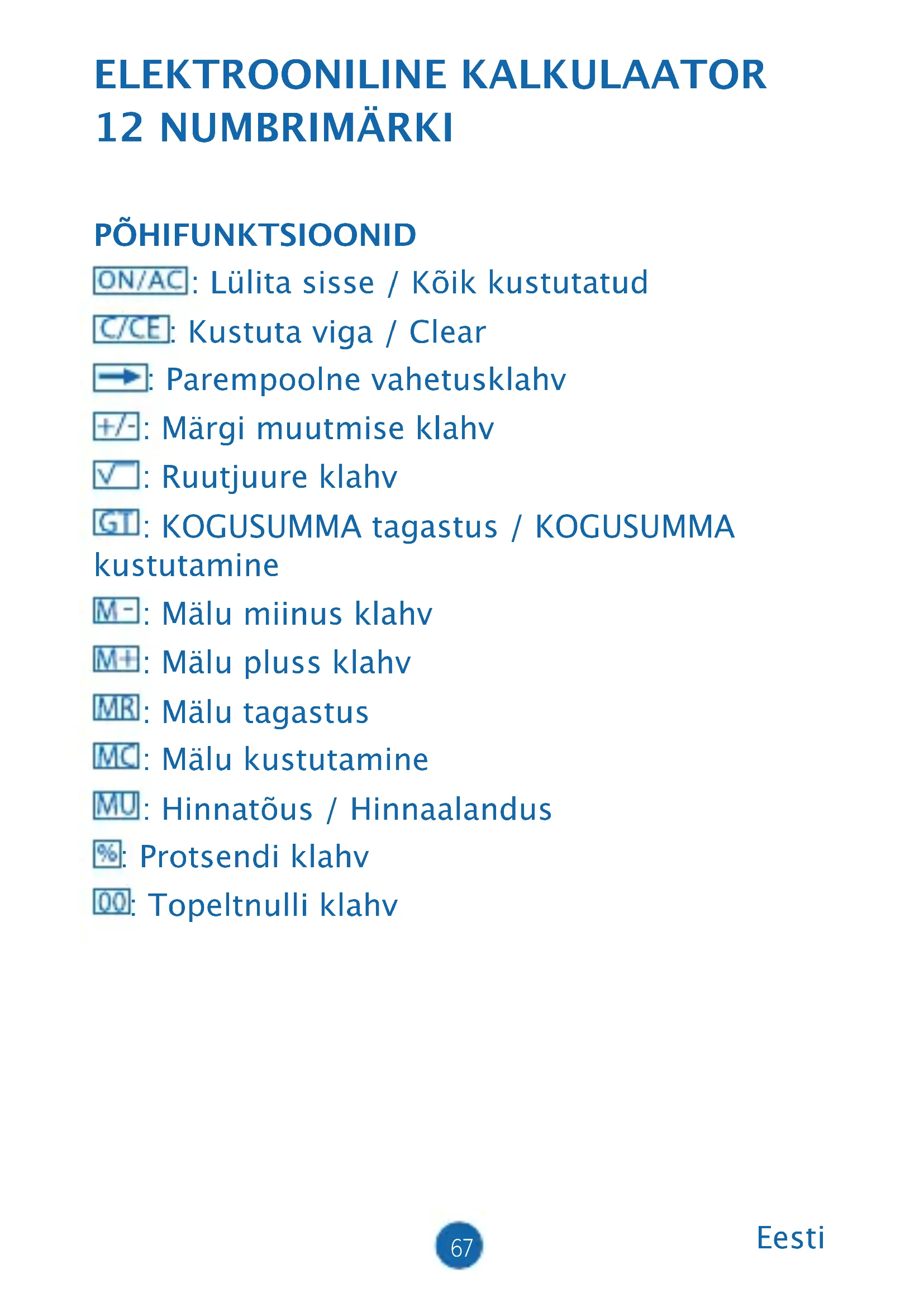 . F : Muutuv komakoht. . 4.2.0 Viitab 4,2 või 0 komakohale. . A : see näitab, et komakohtade arv on automaatselt 2. (näiteks, kui sisestate “.”, siis see asukoht on aluseks). Seda omadust saab tõhusalt kasutada vaid liitmisel ja lahutamisel. LCD EKRAANI KIRJELDUS: GT : KOGUSUMMA märk, mis näitab, et kogusumma (GT) mälu on toimiv. M : Sõltumatu mälu märk näitab, et sõltumatu mälu on toimiv. - : Miinusmärk. E : Vea märk, kui ekraanile ilmub "E", võite vajutada klahvile , et viga kustutada.69 ARVUTUSTEHTE NÄIDIS: Tavalise arvutustehte näide 10% 1500st (1500 x 10%=) 5% lisa summast 1500 (1500 x 5%=) (1500 - 5%=) . protsent 20st vastu 500 TasutaTasutaTasutaTasutaTasutaTasutaTasuta