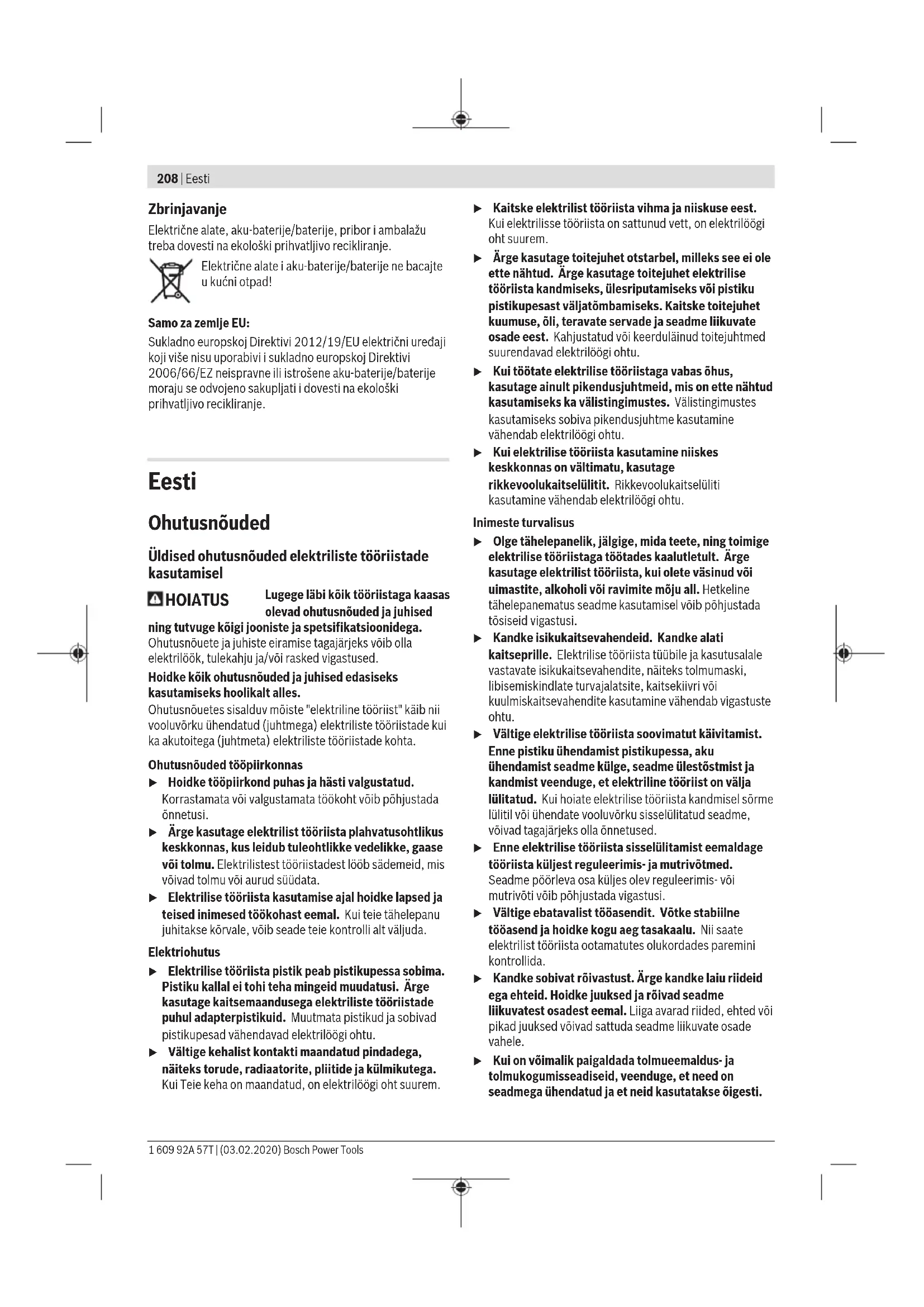 EL-vastavusdeklaratsioon Kinnitame ainuvastutajatena, et nimetatud tooted vastavad järgnevalt loetle- tud direktiivide ja määruste kõikidele asjaomastele nõuetele ja on kooskõlas Ülafrees Tootenumber 1 609 92A 57T | (03.02.2020) Bosch Power ToolsIII järgmiste normidega. Tehnilised dokumendid saadaval: *