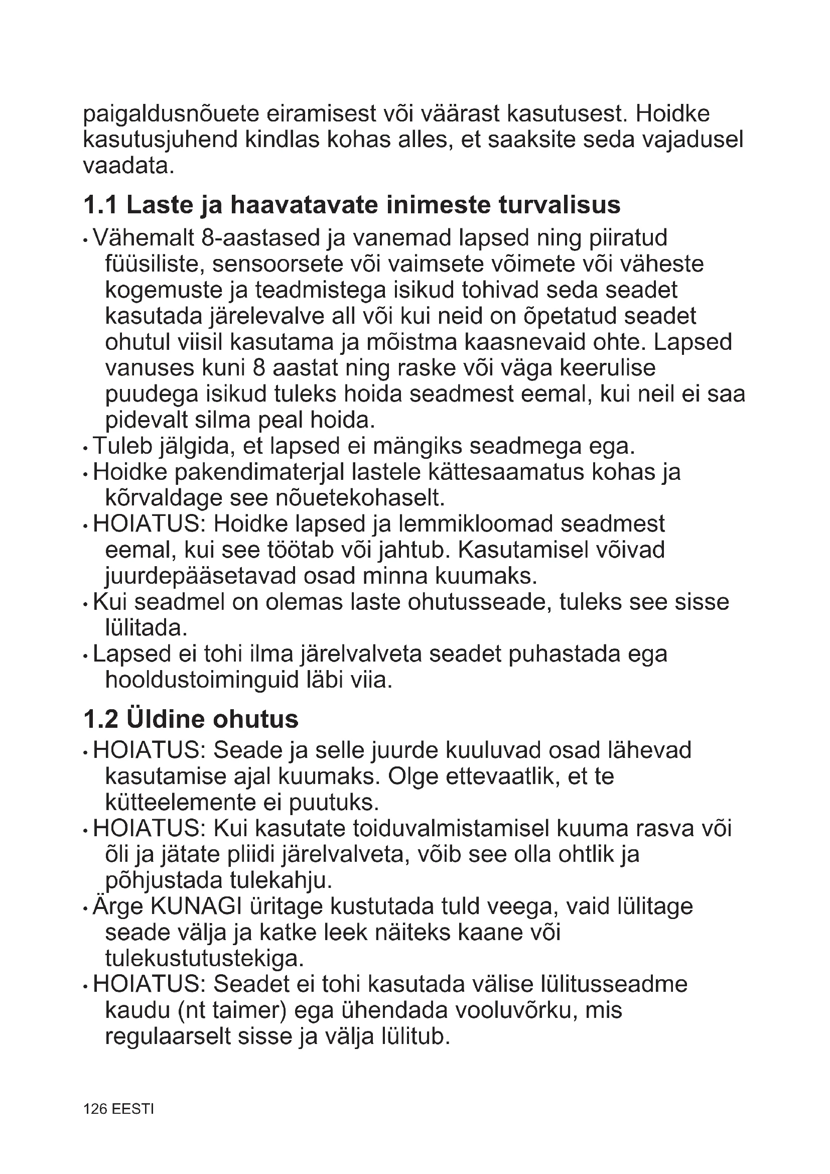 - Vähemalt 8-aastased ja vanemad lapsed ning piiratud füüsiliste, sensoorsete või vaimsete võimete või väheste kogemuste ja teadmistega isikud tohivad seda seadet kasutada järelevalve all või kui neid on õpetatud seadet ohutul viisil kasutama ja mõistma kaasnevaid ohte. Lapsed vanuses kuni 8 aastat ning raske või väga keerulise puudega isikud tuleks hoida seadmest eemal, kui neil ei saa pidevalt silma peal hoida.