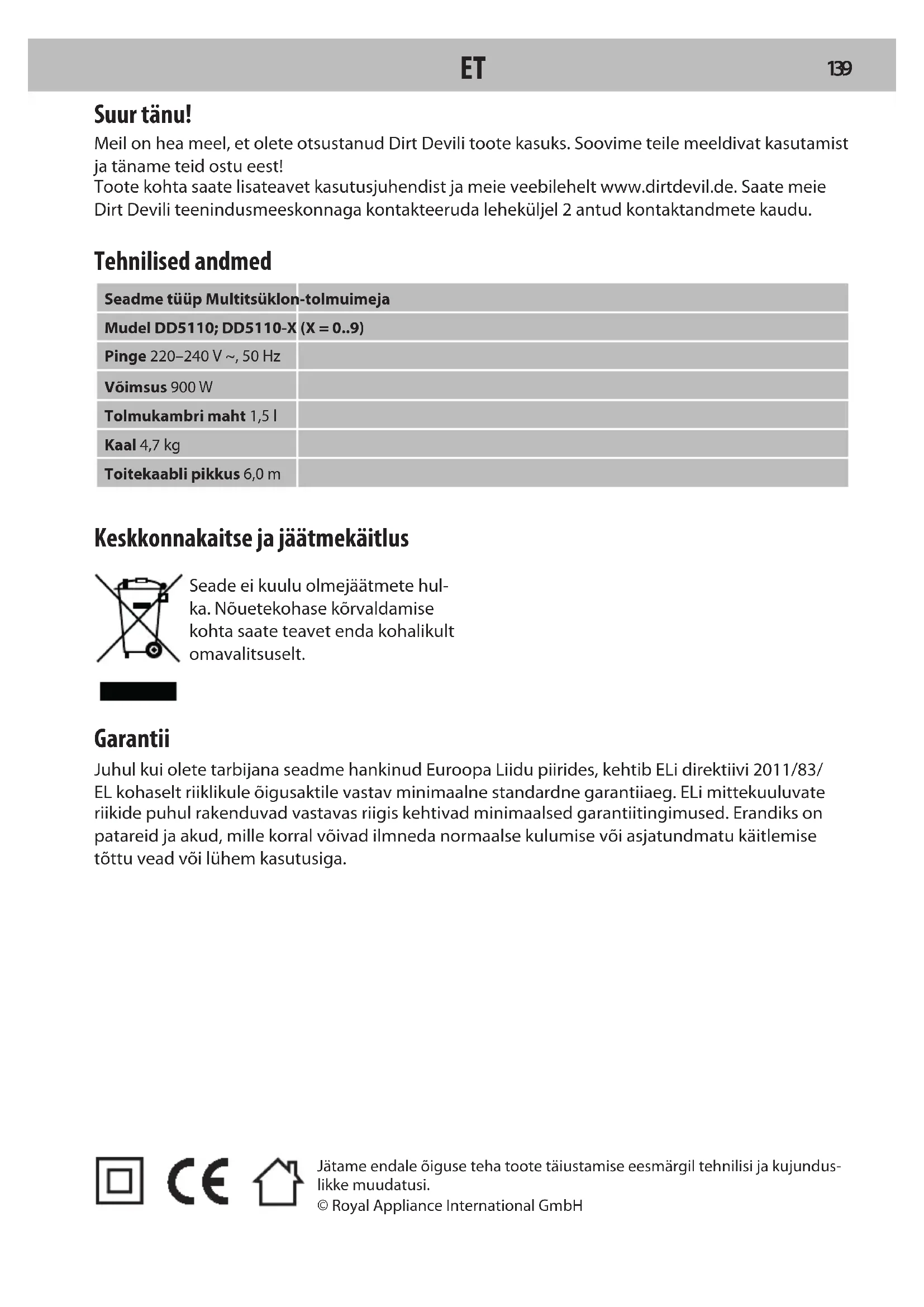 LVJätame endale õiguse teha toote täiustamise eesmärgil tehnilisi ja kujundus- likke muudatusi. © Royal Appliance International GmbH Suur tänu! Meil on hea meel, et olete otsustanud Dirt Devili toote kasuks. Soovime teile meeldivat kasutamist ja täname teid ostu eest! Toote kohta saate lisateavet kasutusjuhendist ja meie veebilehelt www.dirtdevil.de. Saate meie Dirt Devili teenindusmeeskonnaga kontakteeruda leheküljel 2 antud kontaktandmete kaudu. Tehnilised andmed Seadme tüüp Multitsüklon-tolmuimeja Mudel DD5110; DD5110-X (X = 0..9) Pinge 220–240 V ~, 50 Hz Võimsus 900 W Tolmukambri maht 1,5 l Kaal 4,7 kg Toitekaabli pikkus 6,0 m Keskkonnakaitse ja jäätmekäitlus Seade ei kuulu olmejäätmete hul- ka. Nõuetekohase kõrvaldamise kohta saate teavet enda kohalikult omavalitsuselt. Garantii Juhul kui olete tarbijana seadme hankinud Euroopa Liidu piirides, kehtib ELi direktiivi 2011/83/ EL kohaselt riiklikule õigusaktile vastav minimaalne standardne garantiiaeg. ELi mittekuuluvate riikide puhul rakenduvad vastavas riigis kehtivad minimaalsed garantiitingimused. Erandiks on patareid ja akud, mille korral võivad ilmneda normaalse kulumise või asjatundmatu käitlemise tõttu vead või lühem kasutusiga.