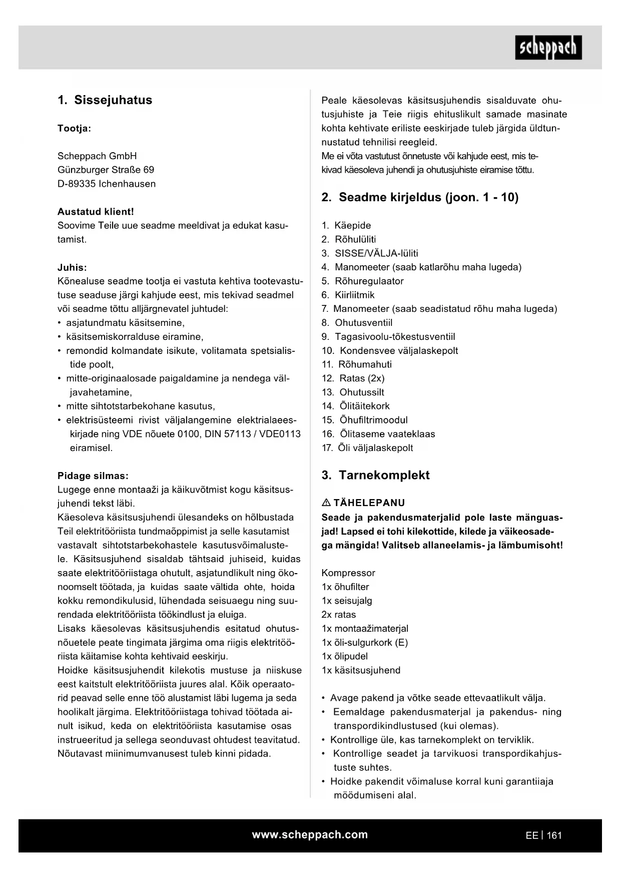 Tootja: Scheppach GmbH Günzburger Straße 69 D-89335 Ichenhausen Austatud klient! Soovime Teile uue seadme meeldivat ja edukat kasu- tamist. Juhis: Kõnealuse seadme tootja ei vastuta kehtiva tootevastu- tuse seaduse järgi kahjude eest, mis tekivad seadmel või seadme tõttu alljärgnevatel juhtudel: