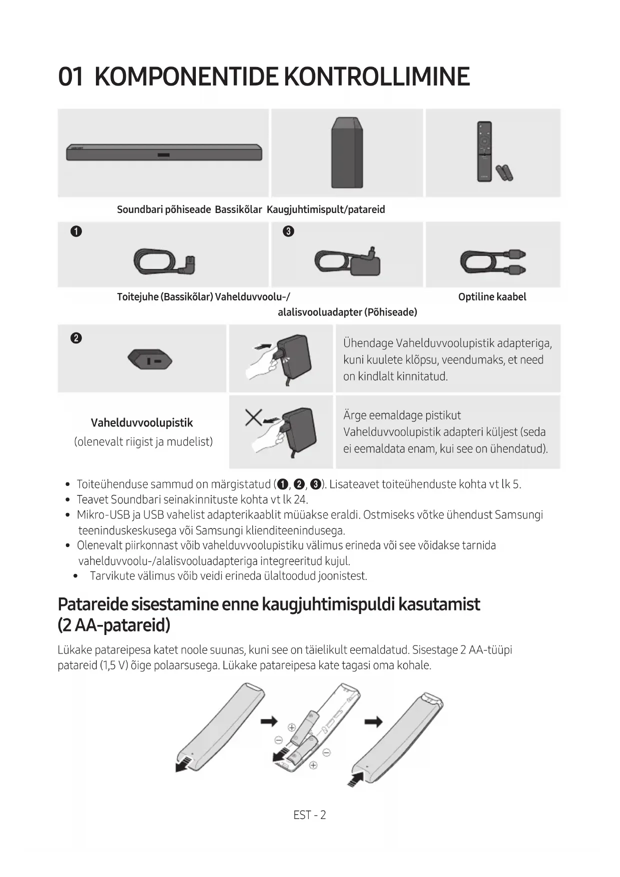 Klienditoekeskusesse pääsemiseks skannige QR-koodi. Juhendi vaatamiseks arvutis või mobiilsideseadmes laadige see veebisaidilt dokumendivormingus alla. (http://www.samsung.com/support) Disain ja tehnilised andmed võivad muutuda ilma ette teatamata.EST - iv SISUKORD 01 Komponentide Kontrollimine 2 Patareide sisestamine enne kaugjuhtimispuldi kasutamist (2 AA-patareid) ------------------------- 2 02 Toote Ülevaade 3 Soundbari esipaneel / parempoolne paneel ------------------------- 3 Soundbari alumine paneel ------------------------- 4 03 Soundbari Ühendamine 5 Elektritoite ühendamine