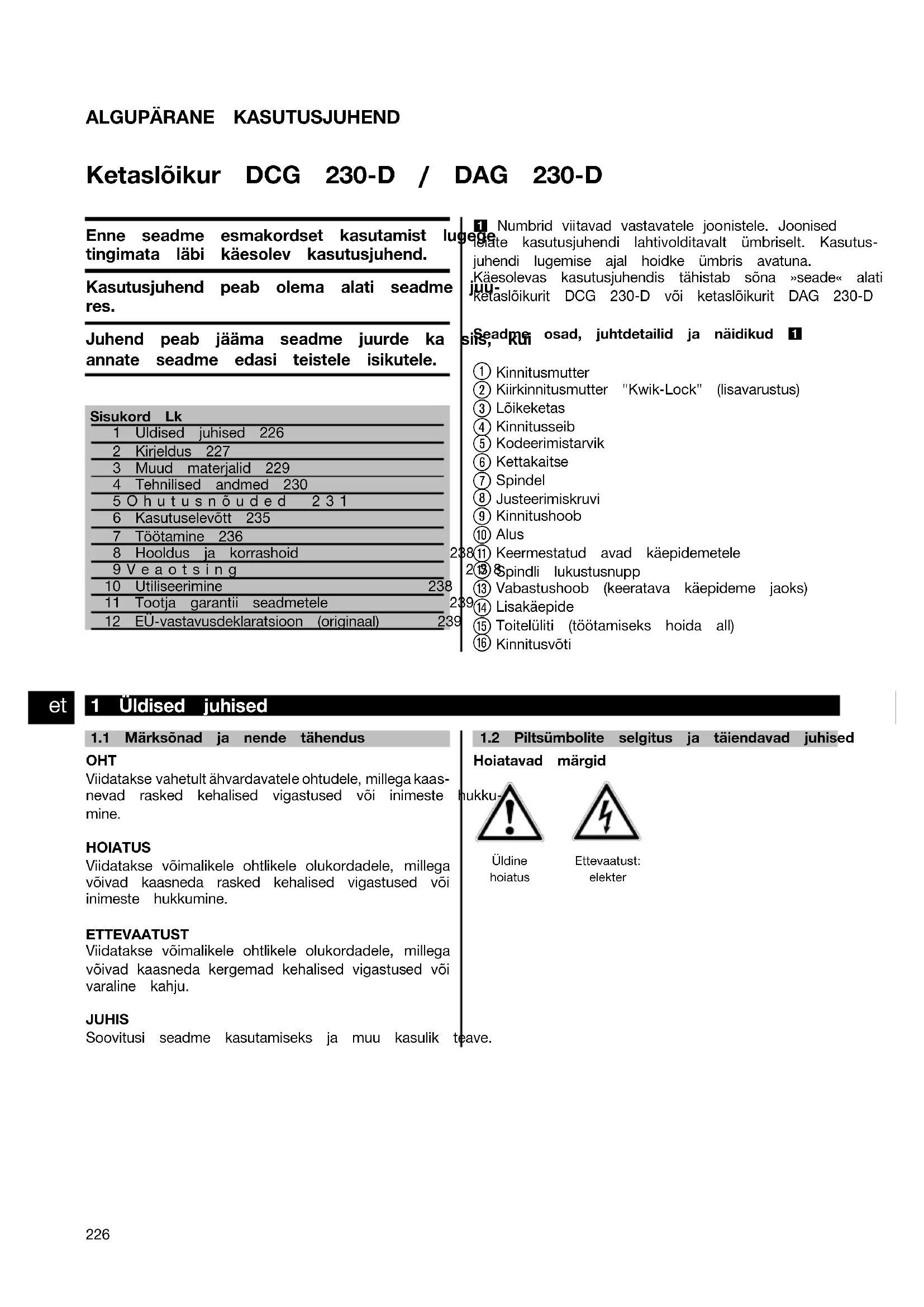 Printed: 20.11.2013 | Doc-Nr: PUB / 5069494 / 000 / 02ALGUPÄRANE KASUTUSJUHEND Ketaslõikur DCG 230‑D / DAG 230‑D Enne seadme esmakordset kasutamist lugege tingimata läbi käesolev kasutusjuhend. Kasutusjuhend peab olema alati seadme juu- res. Juhend peab jääma seadme juurde ka siis, kui annate seadme edasi teistele isikutele. Sisukord Lk1 Üldised juhised 2262 Kirjeldus 2273 Muud materjalid 2294 Tehnilised andmed 2305Ohutusnõuded 2316 Kasutuselevõtt 2357 Töötamine 2368 Hooldus ja korrashoid 2389Veaotsing 23810 Utiliseerimine 23811 Tootja garantii seadmetele 23912 EÜ-vastavusdeklaratsioon (originaal) 239 1 Numbrid viitavad vastavatele joonistele. Joonised leiate kasutusjuhendi lahtivolditavalt ümbriselt. Kasutus-juhendi lugemise ajal hoidke ümbris avatuna.Käesolevas kasutusjuhendis tähistab sõna »seade« alatiketaslõikurit DCG 230‑D või ketaslõikurit DAG 230‑DSeadme osad, juhtdetailid ja näidikud 1 Kinnitusmutter Kiirkinnitusmutter "Kwik-Lock" (lisavarustus) Lõikeketas Kinnitusseib Kodeerimistarvik Kettakaitse Spindel Justeerimiskruvi Kinnitushoob