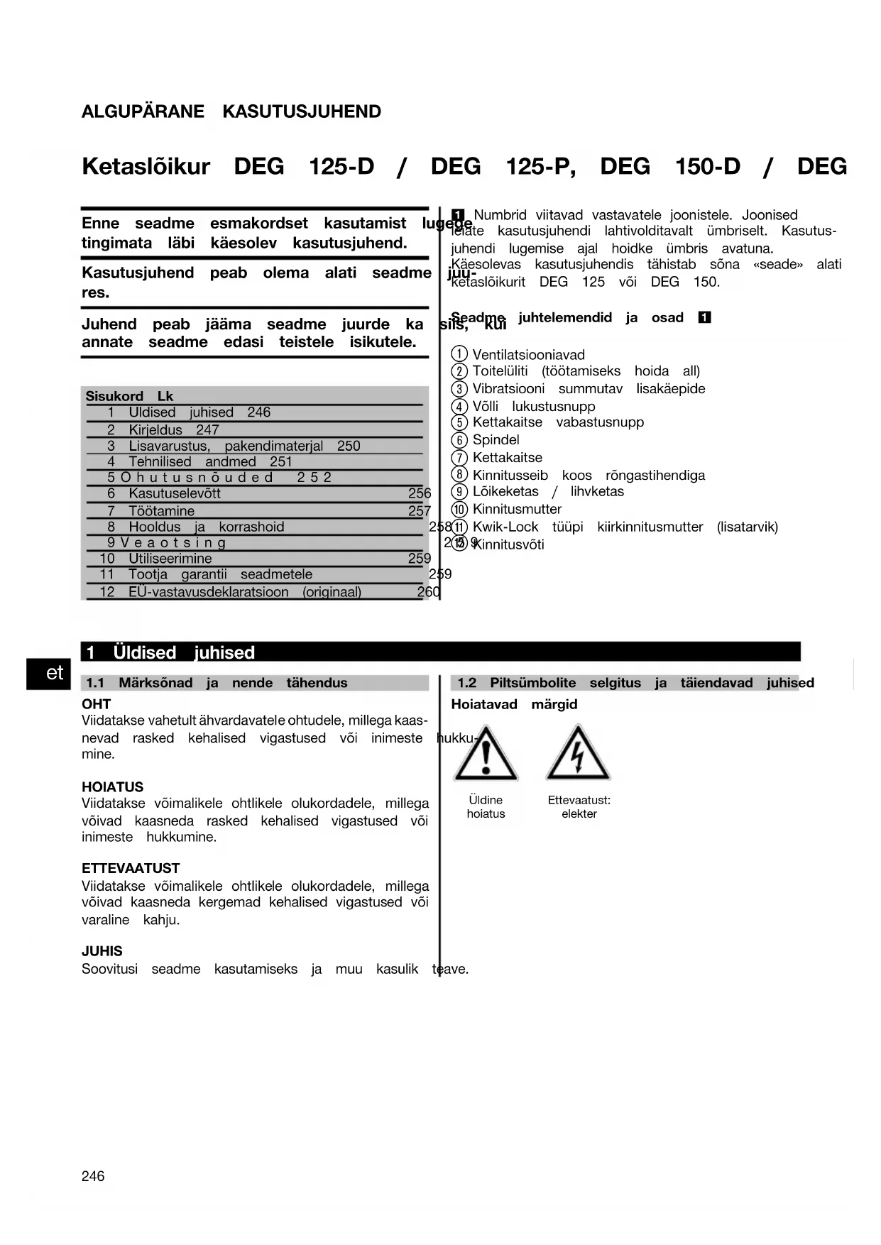 Hilti DEG 125-D/-P, DEG 150-D/-P, Pos.1, Art. Nr.285965/A3, 18.09.2013 Printed: 21.11.2013 | Doc-Nr: PUB / 5162491 / 000 / 00ALGUPÄRANE KASUTUSJUHEND Ketaslõikur DEG 125‑D / DEG 125‑P, DEG 150‑D / DEG 150‑P Enne seadme esmakordset kasutamist lugege tingimata läbi käesolev kasutusjuhend. Kasutusjuhend peab olema alati seadme juu- res. Juhend peab jääma seadme juurde ka siis, kui annate seadme edasi teistele isikutele. Sisukord Lk1 Üldised juhised 2462 Kirjeldus 2473 Lisavarustus, pakendimaterjal 2504 Tehnilised andmed 2515Ohutusnõuded 2526 Kasutuselevõtt 2567 Töötamine 2578 Hooldus ja korrashoid 2589Veaotsing 25910 Utiliseerimine 25911 Tootja garantii seadmetele 25912 EÜ-vastavusdeklaratsioon (originaal) 260 1 Numbrid viitavad vastavatele joonistele. Joonised leiate kasutusjuhendi lahtivolditavalt ümbriselt. Kasutus-juhendi lugemise ajal hoidke ümbris avatuna.Käesolevas kasutusjuhendis tähistab sõna «seade» alatiketaslõikurit DEG 125 või DEG 150.Seadme juhtelemendid ja osad 1 Ventilatsiooniavad Toitelüliti (töötamiseks hoida all) Vibratsiooni summutav lisakäepide Võlli lukustusnupp Kettakaitse vabastusnupp Spindel Kettakaitse Kinnitusseib koos rõngastihendiga Lõikeketas / lihvketas Kinnitusmutter Kwik‑Lock tüüpi kiirkinnitusmutter (lisatarvik) Kinnitusvõti 1 Üldised juhised