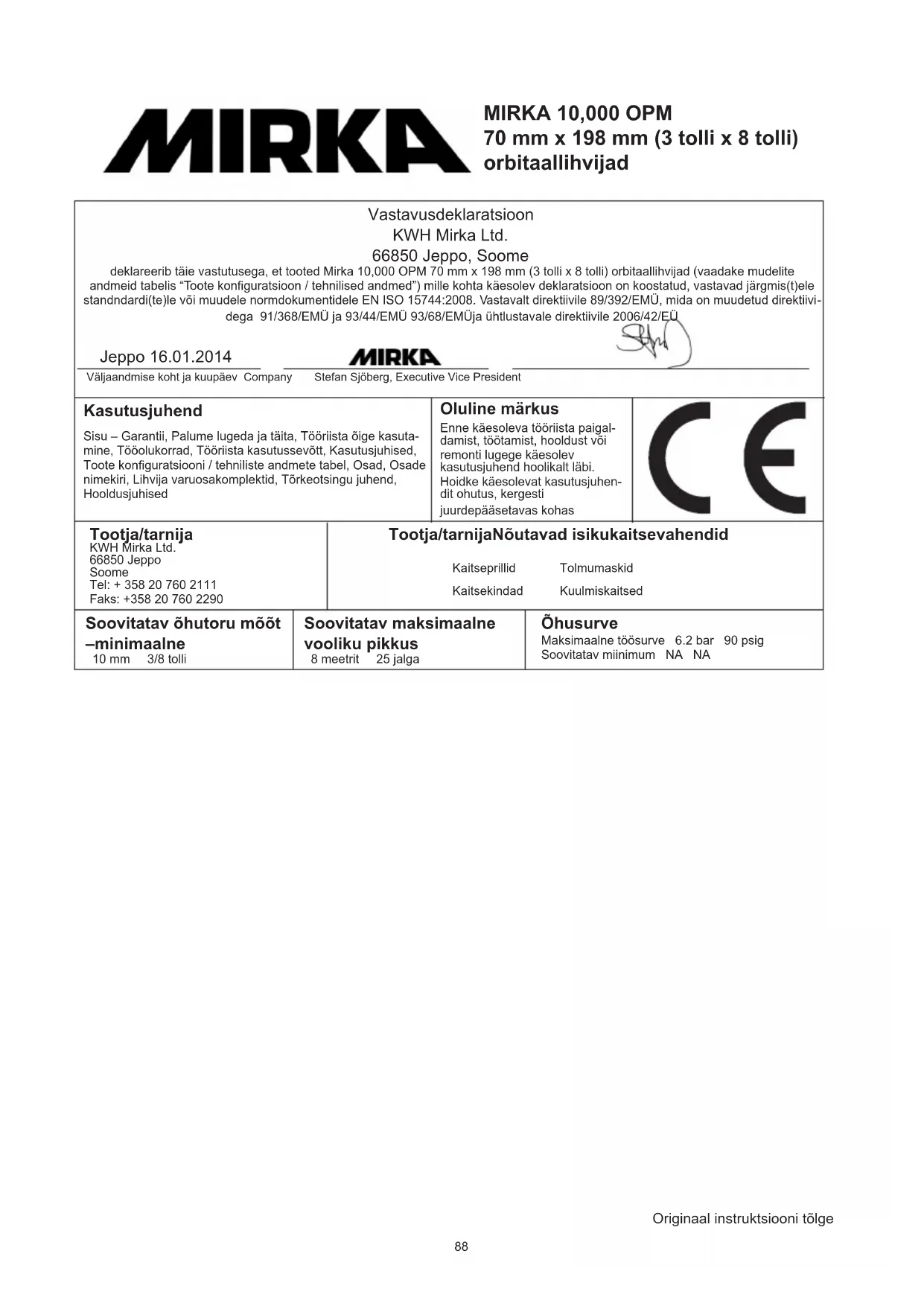 | Vastavusdeklaratsion KWH Mirka Ltd. 66850 Jeppo, Soome deklareerib täie vastutusega, et tooted Mirka 10,000 OPM 70 mm x 198 mm (3 toli x 8 toli) orbitaallihvijad (vaadake mudelite andmeid tabelis "Toote konfiguratsion / tehnilised andmed") mille kohta käesolev deklaratsion on koostatud, vastavad järgmis(t)ele standndardi(te)le vöi muudele normdokumentidele EN ISO 15744:2008. Vastavelt direktivile 89/392/EMÜ, mida on muudetud direktivi- dega 91/368/EMÜ ja 93/44/EMÜ 93/68/EMÜja ühlustavale direktivile 2006/42/EU | |||