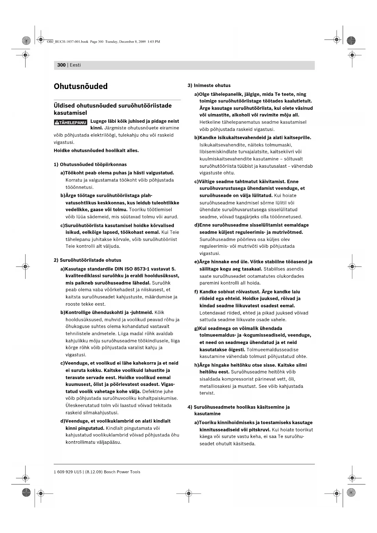 kasutamine a)Tooriku kinnihoidmiseks ja toestamiseks kasutage kinnitusseadiseid või pitskruvi. Kui hoiate toorikut käega või surute vastu keha, ei saa Te suruõhu- seadet ohutult käsitseda. TÄHELEPANU OBJ_BUCH-1037-001.book Page 300 Tuesday, December 8, 2009 1:03 PMEesti | 301 Bosch Power Tools 1 609 929 U15 | (8.12.09) b)Ärge koormake suruõhuseadet üle. Kasutage üksnes antud töö jaoks ette nähtud suruõhuseadet. Sobiva suruõhuseadmega töötate toodud jõudluspiirides tõhusamalt ja ohutumalt. c)Ärge kasutage suruõhuseadet, mida ei saa lülitist korralikult sisse ja välja lülitada. Suruõhuseade, mida ei saa enam sisse ja välja lülitada, on ohtlik ja tuleb toimetada parandusse. d)Enne seadme seadistamist, tarvikute vahetust ja seadme käestpanekut katkestage õhuvarustus. See ettevaatusabinõu hoiab ära suruõhuseadme soovimatu käivitumise. e)Kasutusvälisel ajal hoidke suruõhuseadmeid lastele kättesaamatus kohas. Ärge lubage suruõhuseadet kasutada isikutel, kes seadet ei tunne ega ole lugenud käesolevat kasutusjuhendit. Asjatundmatute isikute käes on suruõhuseadmed ohtlikud. f) Hooldage suurõhuseadet korralikult. Veenduge, et seadme liikuvad detailid töötavad veatult ja kiildu kinni, et seadme detailid ei ole murdunud ega kah- justatud määral, mis mõjutab suruõhuseadme töökindlust. Laske vigastatud detailid enne suruõhuseadme töölerakendamist parandada. Paljude õnnetuste põhjuseks on suruõhuseadmete ebapiisav hooldus. g)Kasutage suruõhuseadet, lisavarustust, tarvikuid jm käesolevate juhiste kohaselt. Arvestage seejuures töötingimusi ja sooritatavat tegevust. Suruõhuseadme nõuetevastane kasutamine võib põhjustada ohtlikke olukordi.