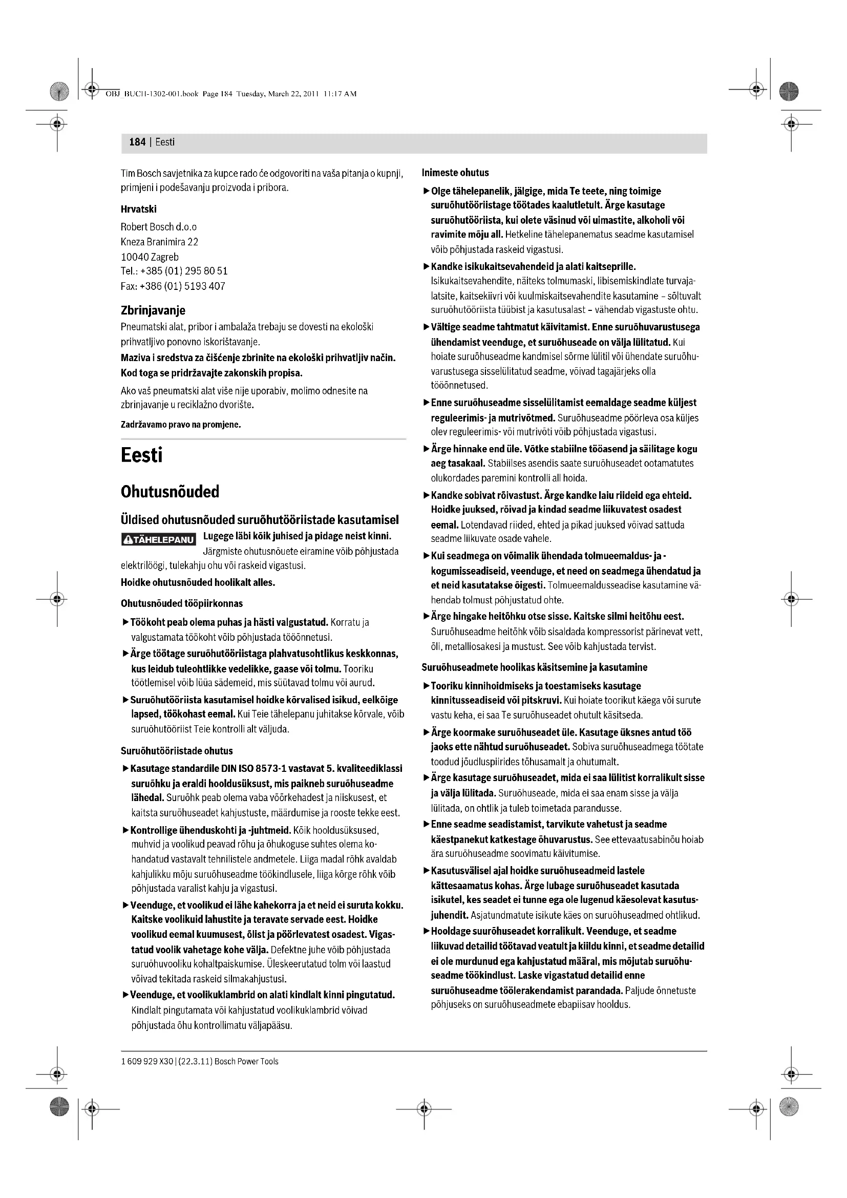 Sprječava se zaglavljivanje čavlića. – Svakodnevno ispušite komprimiranim zrakom mehanizam magazina/zasuna magazina. Osigurač okidanja 2 treba propisno djelovati. Povećava vašu sigurnost pri radu i djelotvornu primjenu pneumatskog alata. – Svakodnevno sa komprimiranim zrakom ispušite osigurač okidanja. Pneumatski alat podmazati. Smanjuje se trošenje pneumatskog alata. – Ukapajte 2–3 kapi maziva u priključni element za zrak 8. (vidjeti „Podmazivanje pneumatskog alata“, stranica 182) Isprazniti kompresor. Sprječava se nakupljanje prljavštine i vlage u pneumatskom alatu. – Otvorite ispusni ventil spremnika. Smetnja Uzrok Otklanjanje Pneumatski alat je spreman za rad ali ne izbacuje čavliće. Čavlić se je zaglavio u kanalu za hitac. – Oslobodite iz zaglavljenog stanja. (vidjeti „Oslobađanje iz zaglavljenog položaja“, stranica 182) Zasun magazina 11 je neispravan. – Čistite i podmazujte prema potrebi zasun magazina 11 i pazite da magazin 10 ne bude zaprljan. Opruga zasuna magazina je suviše slaba ili neispravna. – Zatražite pomoć ovlaštenog Bosch servisa. Tamo zatražite zamjenu dijela. Korišteni elementi za pričvršćenje su nedopušteni. – Koristite samo originalni pribor. Smiju se koristiti samo elementi za pričvršćenje (čavlići, spajalice, itd.) koji su navedeni u tablici „Tehnički podaci“. Magazin 10 je prazan. – Ponovno napunite magazin. (vidjeti „Punjenje magazina“, stranica 180) OBJ_BUCH-1302-001.book Page 182 Tuesday, March 22, 2011 11:17 AMHrvatski | 183 Bosch Power Tools 1 609 929 X30 | (22.3.11) Pribor O kompletnom programu kvalitetnog pribora možete se informirati na internetu, na adresi www.bosch-pt.com ili u specijaliziranoj trgovačkoj mreži. Servis za kupce i savjetovanje kupaca Naš servis će odgovoriti na vaša pitanja o popravku i održavanju vašeg proizvoda, kao i o rezervnim dijelovima. Crteže u rastavljenom obliku i informacije o rezervnim dijelovima možete naći i na našoj adresi: www.bosch-pt.com Čavlići se izbacuju samo vrlo sporo i sa premalim pritiskom. Prenizak je nazivni tlak opskrbe komprimiranim zrakom. – Povećati dovod komprimiranog zraka. Kod toga se ne smije premašiti tlak od 8 bar. Udarni žig je oštećen. – Koristite samo mazivo koje je preporučio Bosch. (vidjeti „Podmazivanje pneumatskog alata“, stranica 182) Brtveni prsten klipa je istrošen ili oštećen. – Zatražite pomoć ovlaštenog Bosch servisa. Tamo zatražite zamjenu dijela. Odbojnik je istrošen. – Zatražite pomoć ovlaštenog Bosch servisa. Tamo zatražite zamjenu dijela. Dužina i promjer crijeva za dovedeni zrak 15 prema podacima ne odgovaraju za ovaj pneumatski alat. – Koristite crijevo za dovedeni zrak odgovarajućih dimenzija. (vidjeti „Tehnički podaci“, stranica 180) Crijevo za dovedeni zrak 15 ima na sebi pregib. – Uklonite pregib sa crijeva za dovedeni zrak. Čavlići se zabijaju suviše duboko. Previsok je nazivni tlak opskrbe komprimiranim zrakom. – Smanjite dovod komprimiranog zraka. Kod toga se tlak ne smije spustiti ispod 4 bar. Graničnik dubine je namješten suviše duboko. – Namjestite graničnik dubine na traženu dubinu. (vidjeti „Namještanje graničnika dubine“, stranica 182) Odbojnik je istrošen. – Zatražite pomoć ovlaštenog Bosch servisa. Tamo zatražite zamjenu dijela. Čavlići se zabijaju suviše plitko. Prenizak je nazivni tlak opskrbe komprimiranim zrakom. – Povećati dovod komprimiranog zraka. Kod toga se ne smije premašiti tlak od 8 bar. Graničnik dubine je namješten suviše visoko. – Namjestite graničnik dubine na traženu dubinu. (vidjeti „Namještanje graničnika dubine“, stranica 182) Dužina i promjer crijeva za dovedeni zrak 15 prema podacima ne odgovaraju za ovaj pneumatski alat. – Koristite crijevo za dovedeni zrak odgovarajućih dimenzija. (vidjeti „Tehnički podaci“, stranica 180) Crijevo za dovedeni zrak 15 ima na sebi pregib. – Uklonite pregib sa crijeva za dovedeni zrak. Pneumatski alat preskače čavliće ili ima suviše veliki taktni posmak. Korišteni elementi za pričvršćenje su nedopušteni. – Koristite samo originalni pribor. Smiju se koristiti samo elementi za pričvršćenje (čavlići, spajalice, itd.) koji su navedeni u tablici „Tehnički podaci“. Magazin 10 ne radi ispravno. – Čistite i podmazujte prema potrebi zasun magazina 11 i pazite da magazin 10 ne bude zaprljan. Opruga zasuna magazina je suviše slaba ili neispravna. – Zatražite pomoć ovlaštenog Bosch servisa. Tamo zatražite zamjenu dijela. Brtveni prsten klipa je istrošen ili oštećen. – Zatražite pomoć ovlaštenog Bosch servisa. Tamo zatražite zamjenu dijela. Čavlići se često zaglavljuju u kanalu za hitac. Korišteni elementi za pričvršćenje su nedopušteni. – Koristite samo originalni pribor. Smiju se koristiti samo elementi za pričvršćenje (čavlići, spajalice, itd.) koji su navedeni u tablici „Tehnički podaci“. – Zatražite pomoć ovlaštenog Bosch servisa. Zabijeni čavlići su savijeni. Udarni žig je oštećen. – Zatražite pomoć ovlaštenog Bosch servisa. Tamo zatražite zamjenu dijela. Za razliku od rada sa normalnom radnom brzinom, kod velike radne brzine čavlići se ne zabijaju dovoljno duboko. Premali svijetli promjer dovodnog crijeva. – Koristite crijevo za dovedeni zrak odgovarajućih dimenzija. (vidjeti „Tehnički podaci“, stranica 180) Kompresor nije prikladan za velike radne brzine. – Koristite kompresor koji je dovoljno dimenzioniran za određeni broj priključenih pneumatskih alata i za traženu radnu brzinu. Smetnja Uzrok Otklanjanje OBJ_BUCH-1302-001.book Page 183 Tuesday, March 22, 2011 11:17 AM1 609 929 X30 | (22.3.11) Bosch Power Tools 184 | Eesti Tim Bosch savjetnika za kupce rado će odgovoriti na vaša pitanja o kupnji, primjeni i podešavanju proizvoda i pribora. Hrvatski Robert Bosch d.o.o Kneza Branimira 22 10040 Zagreb Tel.: +385 (01) 295 80 51 Fax: +386 (01) 5193 4
