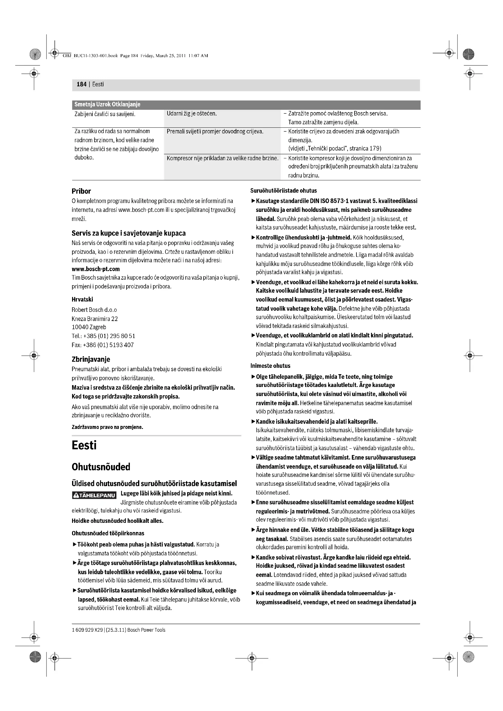 Kaal EPTA-Procedure 01/2003 järgi kg 2,5 Dr. Egbert Schneider Senior Vice President Engineering Dr. Eckerhard Strötgen Head of Product Certification Suruõhuklambrilööja GCN 45-15 Professional OBJ_BUCH-1303-001.book Page 186 Friday, March 25, 2011 11:07 AMEesti | 187 Bosch Power Tools 1 609 929 X29 | (25.3.11) lastakse välja, kui suruõhuseadme sisedetailid ei ole pärast parandus- või hooldustöid või transporti algasendis. – Ühendage õhuliitmik 3 sissetuleva õhu voolikuga 13, mis on varustatud kiirkinnituva muhviga 12. – Kontrollige, kas seade töötab veatult: selleks suruge suruõhuseadme ninaosa 9 vastu puitklotsi ja vajutage paar korda päästikule. Päästiku vahetamine (vt jooniseid B1–B2) Enne seadme seadistamist, tarvikute vahetust ja seadme käestpanekut katkestage õhuvarustus. See ettevaatusabinõu hoiab ära suruõhuseadme soovimatu käivitumise. Suruõhuseadet saab kasutada kahe erineva vabastussüsteemiga. Vabastussüsteem valitakse vastava päästiku paigaldamisega. Päästiku mahavõtmine – Tõmmake kummirõngas 14 tugivardalt 15 maha. – Tõmmake tugivarras 15 korpusest välja. – Tõmmake päästik suunaga taha korpusest välja. Päästiku paigaldamine – Valige soovitud vabastussüsteemi jaoks sobiv päästik. Märkus: Halli päästiku 5 paigaldamisel veenduge, et vabastushoob 16 on õiges asendis (vt joonist B2). – Lükake päästik korpusesse. Seejuures veenduge, et vabastusvedru 17 ümbritseb vabastuspolti 18 ja avaldab survet vabastushoovale 16. – Seadke päästiku paigaldusavad kohakuti korpuse paigaldusavadega ja lükake tugivarras 15 läbi avade. – Lükake kummirõngas 14 tugivarda 15 soonde. Salve täitmine (vt jooniseid C1–C3) Enne seadme seadistamist, tarvikute vahetust ja seadme käestpanekut katkestage õhuvarustus. See ettevaatusabinõu hoiab ära suruõhuseadme soovimatu käivitumise. fKasutage ainult Boschi originaaltarvikuid (vt „Tehnilised andmed“). Suruõhuseadme täppisdetailid nagu salv, ninaosa ja löögikanal on kohandatud Boschi klambrite, naelte ja tihvtidega. Teised tootjad kasutavad teistsuguse kvaliteediga terast ja teiste mõõtmetega detaile. Teiste tootjate kinnitusvahendite kasutamine võib suruõhuseadet kahjustada ja tuua kaasa vigastuste ohu. Hoidke suruõhuseadet salve täitmise ajal nii, et seadme ninaosa 9 ei ole suunatud ei Teie enda ega teiste inimeste poole. – Vajaduse korral puhastage ja määrige salve löögikanalit 21 ja veenduge, et salv 6 ei ole määrdunud. – Vajutage salve lukule 4 ja avage salve kaas 7. Salve spindel 19 tuleb reguleerida vastavalt naelte pikkusele, et naelad läheksid kergesti seadme ninaossa. – Tõmmake salve spindlit 19 üles ja keerake salve spindlit, kuni see fikseerub soovitud asendisse. – Asetage naelarull 20 salve spindlile 19. – Võtke naelarull piisavalt lahti, nii et esimese naela saab paigutada löögikanalisse 21 ja teise naela etteandedetaili 22. Asetage naelte pead juhtsoonde 23. – Sulgege salve kaas 7, nii et salve lukk 4 fikseerub kohale. fVeenduge, et naelarulli sissepanekul ei saa viga ega deformeeru naelte traatmähis. Vigastatud mähise või valesti sisse pandud naelarulli tõttu võib juhtuda, et salve kaant ei saa enam korrektselt sulgeda. See põhjustab häireid seadme töös. Kasutamine Vabastussüsteemid Suruõhuseadet saab kasutada kahe erineva vabastussüsteemiga: – Üksiklöögi vabastamine Selle vabastussüsteemi puhul tuleb kõigepealt suruda kontaktlüliti 10 tugevasti vastu pinda. Kinnitusvahend lastakse välja alles siis, kui vajutate päästikule . Järgmist kinnitusvahendit saab välja lasta vaid siis, kui päästik ja kontaktlüliti on eelnevalt viidud tagasi algasendisse. – Kontaktvabastamine Selle vabastussüsteemi puhul tuleb kõigepealt vajutada päästikule . Kinnitusvahend lastakse välja siis, kui sissevajutatud päästikuga seadme kontaktlüliti 10 surutakse tugevasti vastu pinda. Sellega saavutatakse suurem töökiirus. Vabastussüsteem valitakse vastava päästiku paigaldamisega. (vt „Päästiku vahetamine“, lk 187) Kasutuselevõtt Enne seadme seadistamist, tarvikute vahetust ja seadme käestpanekut katkestage õhuvarustus. See ettevaatusabinõu hoiab ära suruõhuseadme soovimatu käivitumise. Töötamine üksiklöögi vabastamise süsteemiga (vt joonist D) – Paigaldage hall päästik 5. (vt „Päästiku vahetamine“, lk 187) – Asetage ninaosa 9 tugevasti vastu toorikut, kuni kontaktlüliti 10 on täiesti sisse surutud. – Seejärel vajutage korraks päästikule 5 ja vabastage see siis. Seejuures lastakse nael välja. – Laske suruõhuseadmelt pinnalt tagasi põrgata. – Järgmise naela sisselöömiseks eemaldage suruõhuseade pinnalt ja asetage see kohta, kuhu soovite järgmist naela sisse lüüa. Töötamine kontaktvabastussüsteemiga (vt joonist E) – Paigaldage punane päästik 8. (vt „Päästiku vahetamine“, lk 187) – Vajutage päästik 8 sisse ja hoidke seda sees. – Asetage ninaosa 9 tugevasti vastu toorikut, kuni kontaktlüliti 10 on täiesti sisse surutud. Seejuures lastakse nael välja. – Laske suruõhuseadmelt pinnalt tagasi põrgata. – Järgmise naela sisselöömiseks eemaldage suruõhuseade pinnalt ja asetage see kohta, kuhu soovite järgmist naela sisse lüüa. – Tõstke suruõhuseade uuesti järgmisse kohta ning sel viisil laske seadmega sisse kõik naelad kogu pinna ulatuses. Sümbol Päästik Päästikusüsteem Päästik 5 (hall) Üksiklöögi vabastamine Päästik 8 (punane) Kontaktvabastamine Naelte pikkus 19 mm–32 mm 32 mm–44 mm Salve markeering 3/4–11/4 11/4–13/4 Salve spindli asend ülal all Pöörlemissuund päripäeva vastupäeva OBJ_BUCH-1303-001.book Page 187 Friday, March 25, 2011 11:07 AM1 609 929 X29 | (25.3.11) Bosch Power Tools 188 | Eesti Iga kord, kui surute suruõhuseadme vastu pinda ja kui kontaktlüliti on sisse vajutatud, lastakse nael välja. – Kui soovitud arv naelu on sisse löödud, vabastage päästik 8. Tööjuhised Enne seadme s