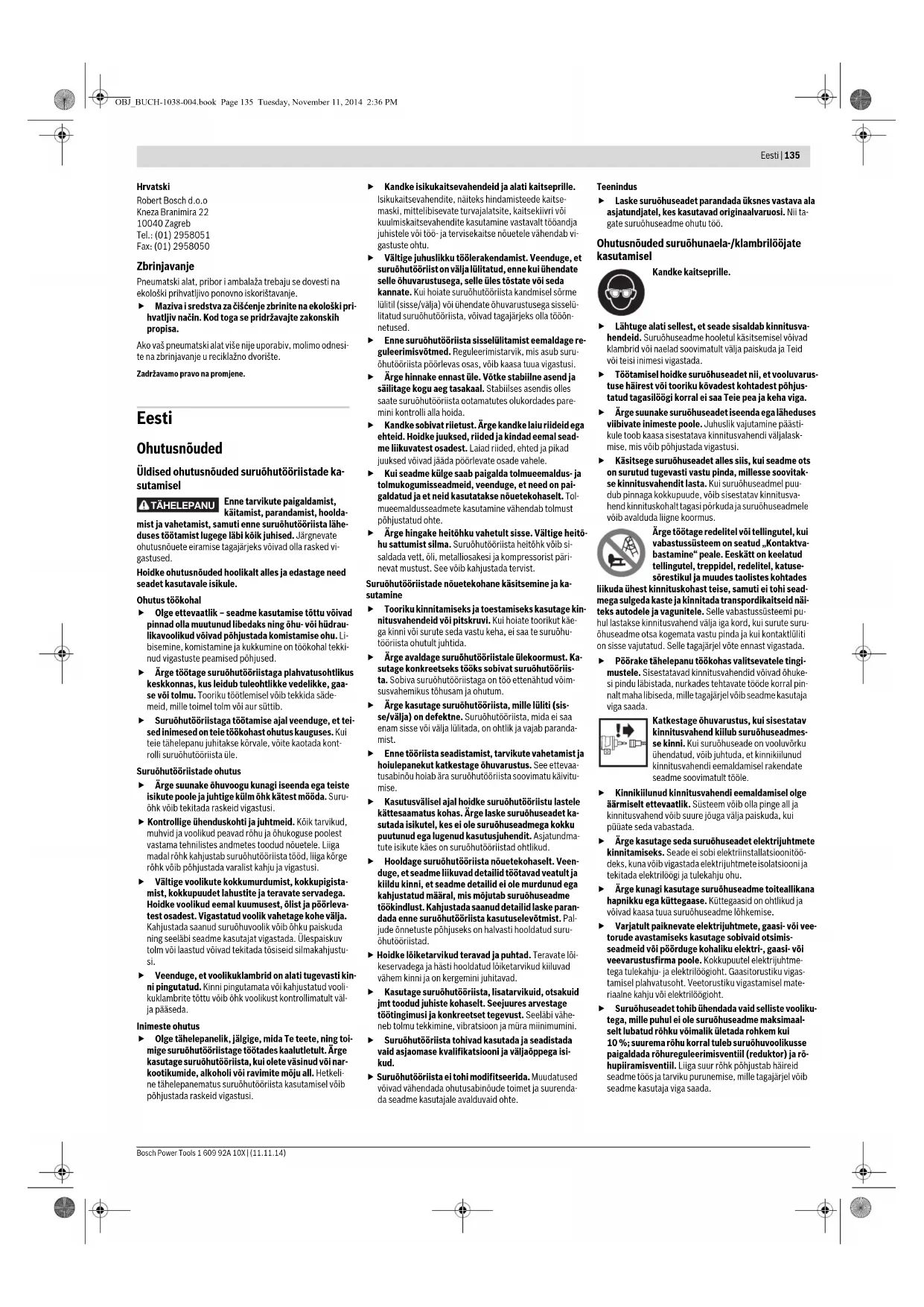 – Täitke salv uuesti. (vt „Salve täitmine“, lk 136) – Veenduge reguleeritud sissetungimissügavuse sobivu- ses proovipinnal. Vajaduse korral korrake tööoperatsioone. Kinnikiilunud naelte vabastamine Üksikud klambrid (GTK 40) või viimistlusnaelad (GSK 50) võivad löögikanalisse kinni kiiluda. Kui seda peaks juhtuma tihti, pöörduge Boschi volitatud remonditöökotta. Märkus: Kui pärast kinnikiilunud naela eemaldamist ei liigu löögimatriits enam tagasi, pöörduge Boschi volitatud re- monditöökotta. GTK 40 (vt jooniseid G1–G3) –Tühjendage salv 8. (vt „Salve tühjendamine“, lk 137) – Suruge lukustushoob 12 alla, nii et löögikanalit on või- malik avada. – Eemaldage kinnikiilunud klamber. Vajaduse korral kasu- tage selleks tange. – Kui löögimatriits 21 on välja liikunud, lükake see määri- tud kruvikeeraja või mõne muu sobiva määritud eseme- ga tagasi kolvi. – Määrige löögikanalit 2–3 tilga mootoriõliga (SAE 10 või SAE 20). – Sulgege löögikanal, asetage lukustushoova 12 kaar löö- gikanali riputi külge ja suruge lukustushoob seejärel uuesti üles. – Täitke salv uuesti. (vt „Salve täitmine“, lk 136) GSK 50 (vt joonist H) –Tühjendage salv 8. (vt „Salve tühjendamine“, lk 137) – Hoidke salv avatuna ja eemaldage kinnikiilunud viimist- lusnael. Vajaduse korral kasutage selleks tange. – Kui löögimatriits 21 on välja liikunud, lükake see määri- tud kruvikeeraja või mõne muu sobiva määritud eseme- ga tagasi kolvi. – Määrige löögikanalit 2–3 tilga mootoriõliga (SAE 10 või SAE 20). – Täitke salv uuesti. (vt „Salve täitmine“, lk 136) Pinnakaitse vahetamine (vt joonist I) Pinnakaitse 1, mis on kontaktlüliti 2 peal, kaitseb pinda ajal, mil suruõhuseadet naela sisselöömiseks õigesse asen- disse seatakse. Pinnakaitset saab eemaldada ja välja vahetada. – Tõmmake pinnakaitse kontaktlüliti pealt ära. – Lükake uus pinnakaitse kontaktlüliti peale. GSK 50: Selle suruõhuseadme puhul saab varukaitset hoi- da salve 8 all. Selleks asetage pinnakaitse hoidikusse 22. Reguleeritav õhuväljalaskeklapp (vt joonist J) Õhu väljumisava küljes oleva väljalaskeklapi 4 abil saate suunata heitõhku endast või pinnast eemale. OBJ_BUCH-1038-004.book Page 137 Tuesday, November 11, 2014 2:36 PM1 609 92A 10X | (11.11.14) Bosch Power Tools 138 | Eesti Transport ja säilitamine Transportimiseks ühendage suruõhuseade õhuvarustuse küljest lahti, seda eeskätt juhul, kui kasutate redelit või kui transportimisel on Teie keha ebatavalises asendis. Kandmisel hoidke suruõhuseadet vaid käepidemest 5 ning päästik 10 ei tohi olla sisse vajutatud. Kasutusvälisel ajal peab suruõhuseade olema õhuvarustu- sest lahti ühendatud, seadet tuleb hoida kuivas ja soojas kohas. Kui Te seadet pikemat aega ei kasuta, määrige terasest de- taile vähese õliga. See hoiab ära rooste tekke. Hooldus ja teenindus Hooldus ja puhastus Enne seadme seadistamist, tarvikute vahetust ja seadme käestpanekut katkestage õhuvarustus. See ettevaatus- abinõu hoiab ära suruõhuseadme soovima- tu käivitumise. Hooldus- ja parandustöid laske teha üksnes kvalifit- seeritud tehnikutel. Nii tagate suruõhuseadme ohutu töö. Boschi volitatud parandustöökojas tehakse need tööd kii- resti ja usaldusväärselt. Suruõhuseadme määrimine (vt joonist K) Kui suruõhuseade ei ole ühendatud hooldusüksusega, tu- leb seda regulaarselt määrida: – Väheintensiivse kasutamise korral 1x päevas. – Intensiivse kasutamise korral 2x päevas. Tilgutage 2–3 tilka määret õhuliitmikku 6.Ärge kasutage määret liiga suures koguses, sest see koguneb seadmesse ja väljub uuesti õhu väljalaskeava 4 kaudu. Kasutage Boschi soovitatud määrdeaineid. – Mineraalne mootoriõli SAE 10 (kasutamiseks juhul, kui ümbritseva keskkonna temperatuur on väga madal) – Mineraalne mootoriõli SAE 20 Määrdeained ja puhastusvahendid utiliseerige kesk- konda säästval viisil. Järgige kasutusriigis kehtivaid nõudeid. Korrashoid Hoidke õhu väljalaskeava 4, kontaktlüliti 2 ja päästik 10 alati puhtad ja vabad võõrkehadest (tolm, laastud, liiv jmt). Puhastage salv 8. Eemaldage plast- või puitlaastud, mis võivad töötamise ajal salve koguneda. Puhastage suruõhuseadet regulaarselt suruõhuga. Häirete kõrvaldamine Abinõu Põhjendus Teostus Puhastage regulaarselt jääkõhufiltrit. Hoiab ära mustuse ja niiskuse kogunemise suruõhuseadmes- se. – Avage väljalaskeventiil. Hoidke määrdeplokk alati täidetuna. Tagab suruõhuseadme pideva õlitamise. – Täitke määrdeplokk soovitatud määrdevahenditega. (vt „Suruõhuseadme määrimine“, lk 138) Puhastage salve 8 ja salve liugurit 11. Hoiab ära klambri (GTK 40) või viimistlusnaela (GSK 50) kinni- kiilumise. – Puhastage salve/salve liuguri mehhanismi iga päev suruõhuga. Tagage kontaktlüliti 2 nõuetekohane toimimine. Aitab kaasa tööohutuse ja suruõhuseadme efektiivse kasuta- mise tagamisele. – Puhastage kontaktlüliti mehhanismi iga päev suruõhuga. Määrige suruõhuseadet. Vähendab suruõhuseadme kulumist. – Tilgutage 2–3 tilka määret õhuliitmikku 6. (vt „Suruõhuseadme määrimine“, lk 138) Tühjendage kompressor. Hoiab ära mustuse ja niiskuse kogunemise suruõhuseadmesse. – Avage kompressori paagi väljalaskeventiil. Probleem Põhjus Vea kõrvaldamine Suruõhuseade on töövalmis, kuid klambreid (GTK 40) või viimistlusnaelu (GSK 50) välja ei lase. Klamber (GTK 40) või viimistlusnael (GSK 50) on löögikanalis- se kinni kiilunud. – Eemaldage kinnikiildunud nael. (vt „Kinnikiilunud naelte vabastamine“, lk 137) Salve liugur 11 on defektne. – Vajaduse korral puhastage ja määrige salve liugurit 11 ja veen- duge, et salv 8 ei ole määrdunud. Salve liuguri vedru on liiga nõrk või defektne. – Võtke ühendust Boschi volitatud remonditöökojaga. Laske detail seal välja vahetada. Kasutatud ei ole nõuetekohaseid kinnitusvahendeid. – Kasuta