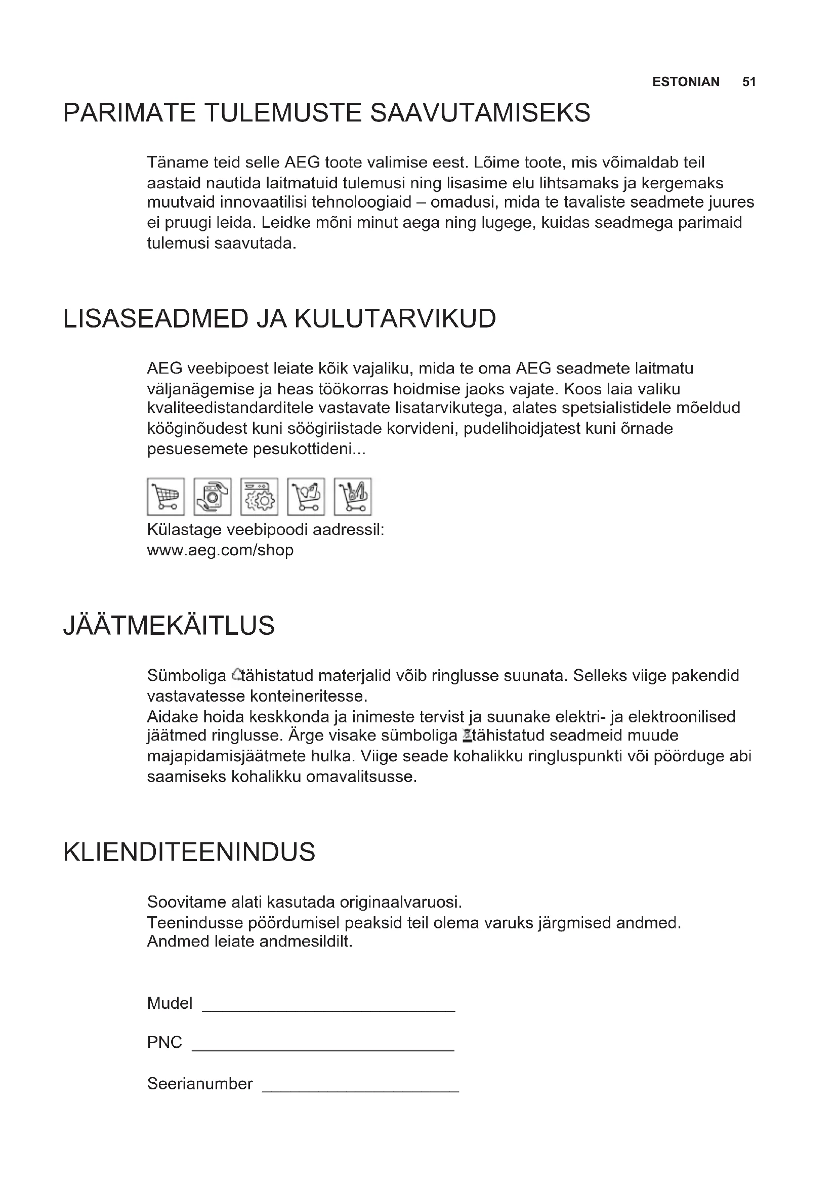 AEG veebipoest leiate kõik vajaliku, mida te oma AEG seadmete laitmatu väljanägemise ja heas töökorras hoidmise jaoks vajate. Koos laia valiku kvaliteedistandarditele vastavate lisatarvikutega, alates spetsialistidele mõeldud kööginõudest kuni söögiriistade korvideni, pudelihoidjatest kuni õrnade pesuesemete pesukottideni... Külastage veebipoodi aadressil: www.aeg.com/shop