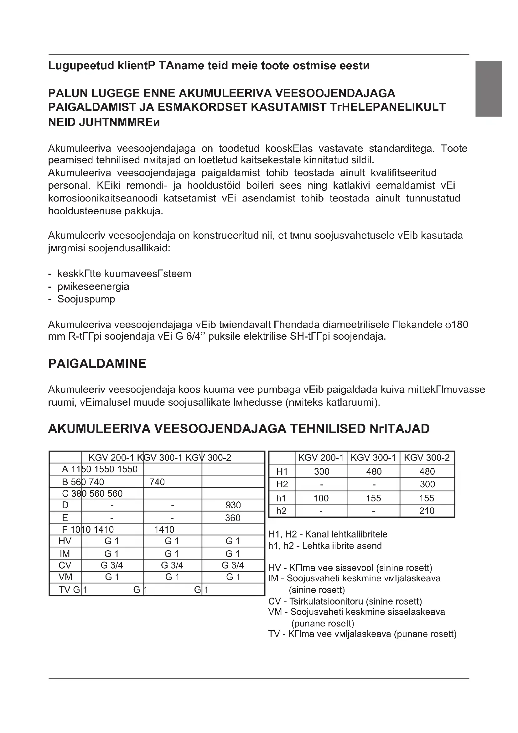 H1 300 480 480 H2 - - 300 h1 100 155 155 h2 - - 210 H1, H2 - Kanal lehtkaliibritele h1, h2 - Lehtkaliibrite asend HV - Külma vee sissevool (sinine rosett) IM - Soojusvaheti keskmine väljalaskeava (sinine rosett) CV - Tsirkulatsioonitoru (sinine rosett) VM - Soojusvaheti keskmine sisselaskeava (punane rosett) TV - Külma vee väljalaskeava (punane rosett) l{¢ª Termomeeter Tüüp KGV 200-1 KGV 300-1 KGV 300-2 Maht [l] 200 285 280 Nominaalne surve [MPa] 0,6 Kaal / veega täidetuna [kg] 82 / 282 112 / 397 134 / 414 Paagi korrosioonikaitse Email/Mg anood