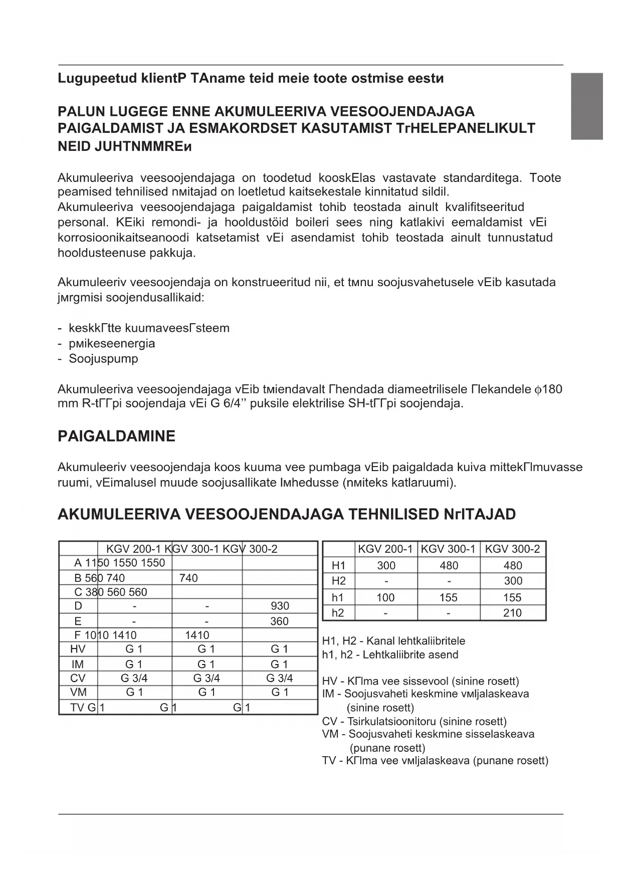 H1 300 480 480 H2 - - 300 h1 100 155 155 h2 - - 210 H1, H2 - Kanal lehtkaliibritele h1, h2 - Lehtkaliibrite asend HV - Külma vee sissevool (sinine rosett) IM - Soojusvaheti keskmine väljalaskeava (sinine rosett) CV - Tsirkulatsioonitoru (sinine rosett) VM - Soojusvaheti keskmine sisselaskeava (punane rosett) TV - Külma vee väljalaskeava (punane rosett) l{¢ª Termomeeter Tüüp KGV 200-1 KGV 300-1 KGV 300-2 Maht [l] 200 285 280 Nominaalne surve [MPa] 0,6 Kaal / veega täidetuna [kg] 82 / 282 112 / 397 134 / 414 Paagi korrosioonikaitse Email/Mg anood