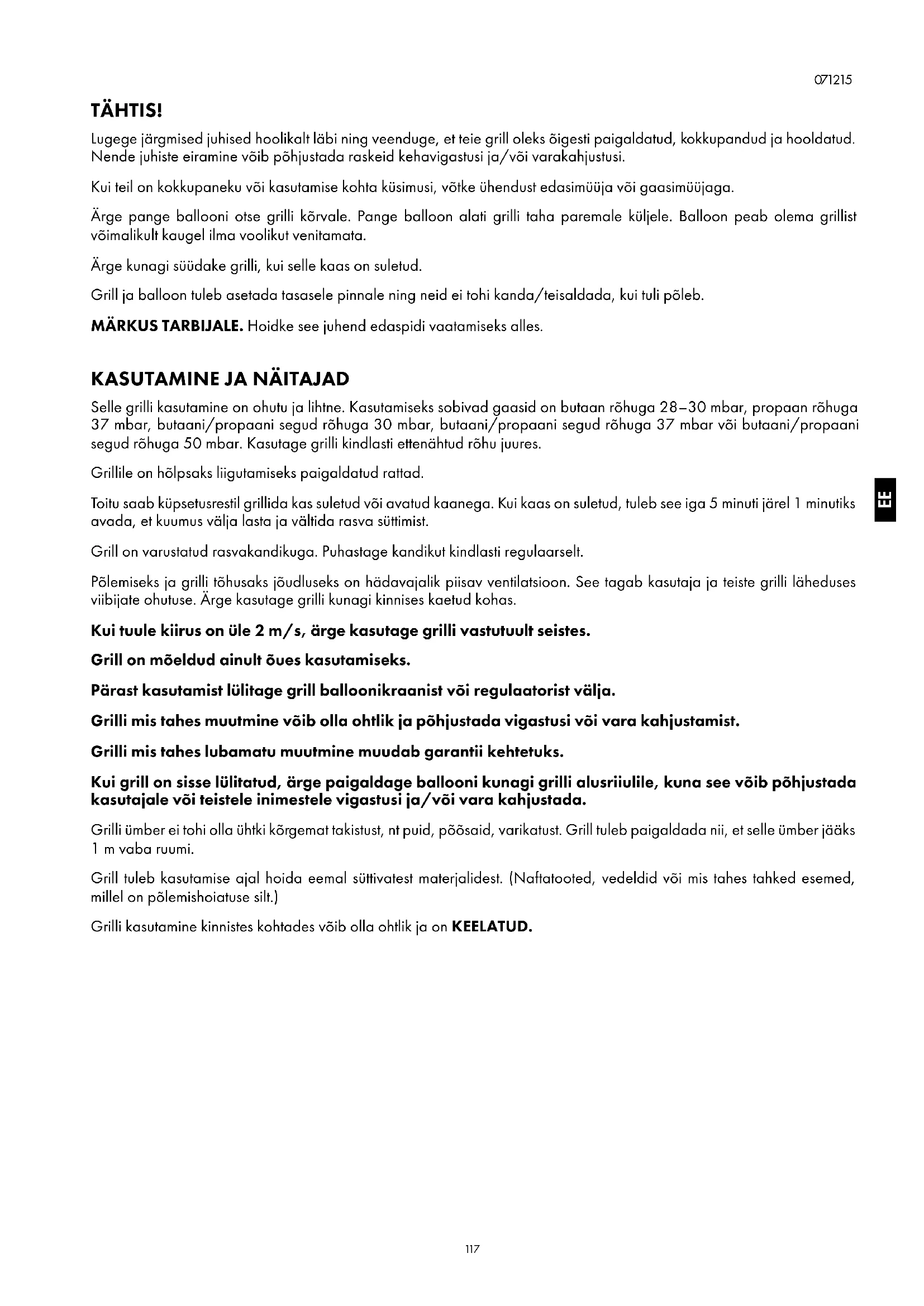 Selle grilli kasutamine on ohutu ja lihtne. Kasutamiseks sobivad gaasid on butaan rõhuga 28–30 mbar, propaan rõhuga 37 mbar, butaani/propaani segud rõhuga 30 mbar, butaani/propaani segud rõhuga 37 mbar või butaani/propaani segud rõhuga 50 mbar. Kasutage grilli kindlasti ettenähtud rõhu juures. Grillile on hõlpsaks liigutamiseks paigaldatud rattad. Toitu saab küpsetusrestil grillida kas suletud või avatud kaanega. Kui kaas on suletud, tuleb see iga 5 minuti järel 1 minutiks avada, et kuumus välja lasta ja vältida rasva süttimist. Grill on varustatud rasvakandikuga. Puhastage kandikut kindlasti regulaarselt. Põlemiseks ja grilli tõhusaks jõudluseks on hädavajalik piisav ventilatsioon. See tagab kasutaja ja teiste grilli läheduses viibijate ohutuse. Ärge kasutage grilli kunagi kinnises kaetud kohas. Kui tuule kiirus on üle 2 m/s, ärge kasutage grilli vastutuult seistes. Grill on mõeldud ainult õues kasutamiseks. Pärast kasutamist lülitage grill balloonikraanist või regulaatorist välja. Grilli mis tahes muutmine võib olla ohtlik ja põhjustada vigastusi või vara kahjustamist. Grilli mis tahes lubamatu muutmine muudab garantii kehtetuks. Kui grill on sisse lülitatud, ärge paigaldage ballooni kunagi grilli alusriiulile, kuna see võib põhjustada kasutajale või teistele inimestele vigastusi ja/või vara kahjustada. Grilli ümber ei tohi olla ühtki kõrgemat takistust, nt puid, põõsaid, varikatust. Grill tuleb paigaldada nii, et selle ümber jääks 1 m vaba ruumi. Grill tuleb kasutamise ajal hoida eemal süttivatest materjalidest. (Naftatooted, vedeldid või mis tahes tahked esemed, millel on põlemishoiatuse silt.) Grilli kasutamine kinnistes kohtades võib olla ohtlik ja on KEELATUD. EE118