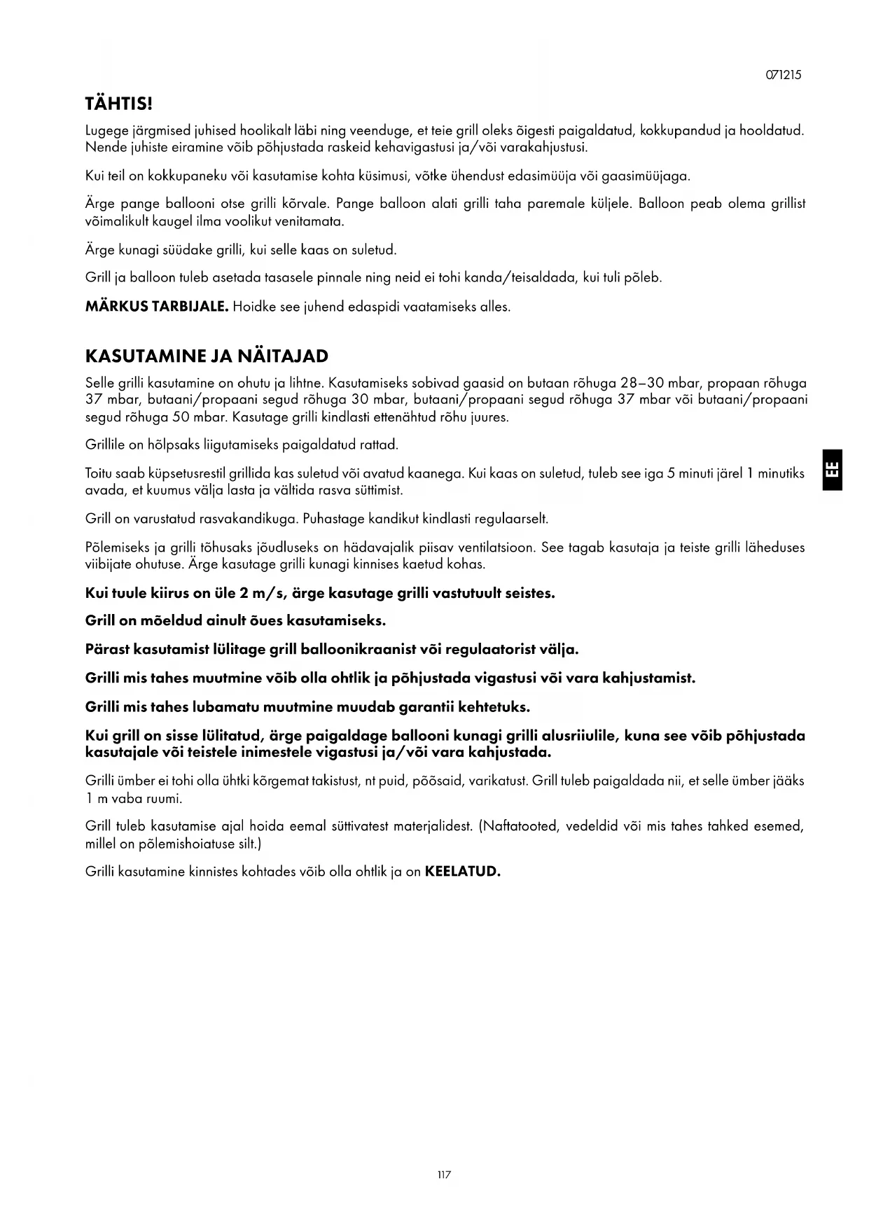 Selle grilli kasutamine on ohutu ja lihtne. Kasutamiseks sobivad gaasid on butaan rõhuga 28–30 mbar, propaan rõhuga 37 mbar, butaani/propaani segud rõhuga 30 mbar, butaani/propaani segud rõhuga 37 mbar või butaani/propaani segud rõhuga 50 mbar. Kasutage grilli kindlasti ettenähtud rõhu juures. Grillile on hõlpsaks liigutamiseks paigaldatud rattad. Toitu saab küpsetusrestil grillida kas suletud või avatud kaanega. Kui kaas on suletud, tuleb see iga 5 minuti järel 1 minutiks avada, et kuumus välja lasta ja vältida rasva süttimist. Grill on varustatud rasvakandikuga. Puhastage kandikut kindlasti regulaarselt. Põlemiseks ja grilli tõhusaks jõudluseks on hädavajalik piisav ventilatsioon. See tagab kasutaja ja teiste grilli läheduses viibijate ohutuse. Ärge kasutage grilli kunagi kinnises kaetud kohas. Kui tuule kiirus on üle 2 m/s, ärge kasutage grilli vastutuult seistes. Grill on mõeldud ainult õues kasutamiseks. Pärast kasutamist lülitage grill balloonikraanist või regulaatorist välja. Grilli mis tahes muutmine võib olla ohtlik ja põhjustada vigastusi või vara kahjustamist. Grilli mis tahes lubamatu muutmine muudab garantii kehtetuks. Kui grill on sisse lülitatud, ärge paigaldage ballooni kunagi grilli alusriiulile, kuna see võib põhjustada kasutajale või teistele inimestele vigastusi ja/või vara kahjustada. Grilli ümber ei tohi olla ühtki kõrgemat takistust, nt puid, põõsaid, varikatust. Grill tuleb paigaldada nii, et selle ümber jääks 1 m vaba ruumi. Grill tuleb kasutamise ajal hoida eemal süttivatest materjalidest. (Naftatooted, vedeldid või mis tahes tahked esemed, millel on põlemishoiatuse silt.) Grilli kasutamine kinnistes kohtades võib olla ohtlik ja on KEELATUD. EE118